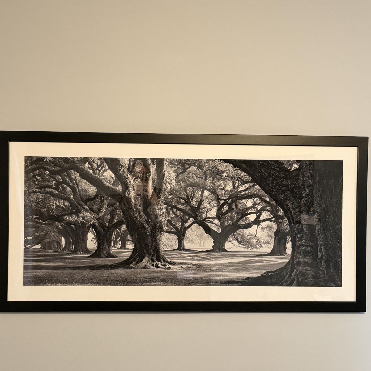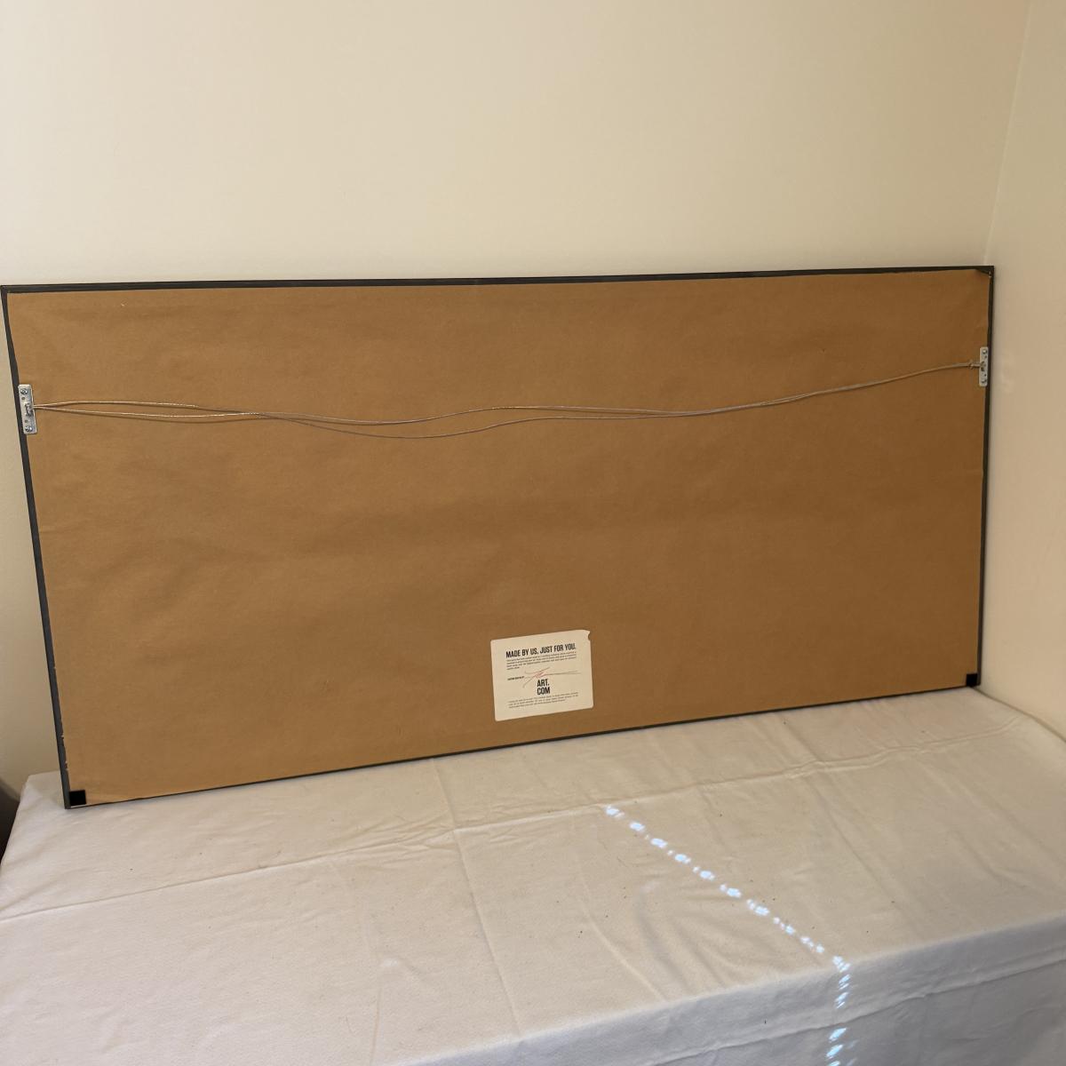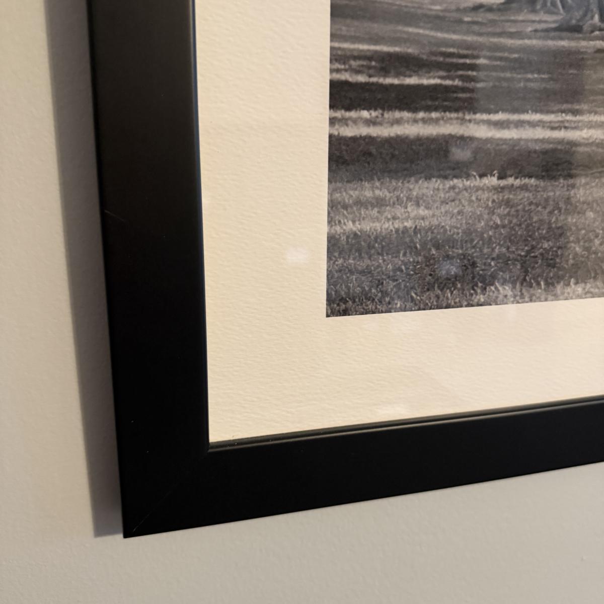 This black and white wooden framed print is under glass. Frame measures 46” x 22”H.