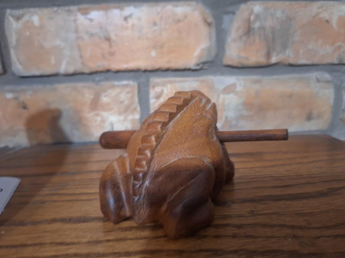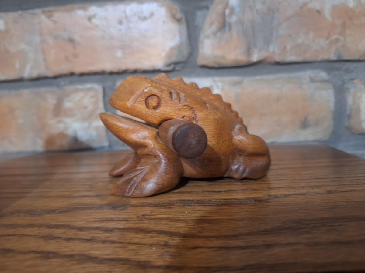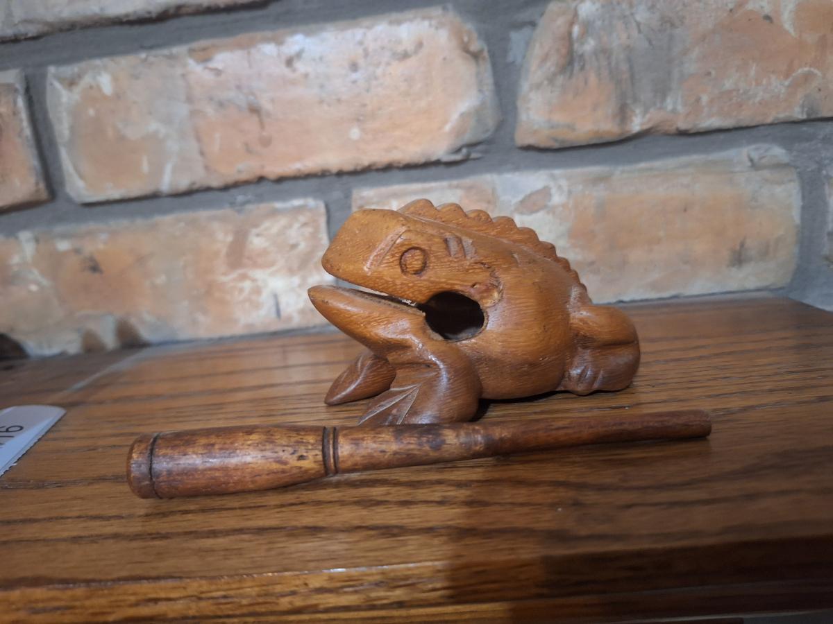Running the included stick (seen in its mouth) along the ridges creates a sound like a croaking frog or a "ribbit".
