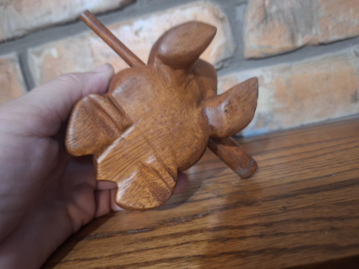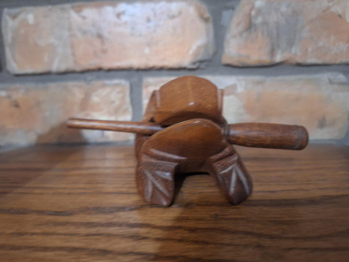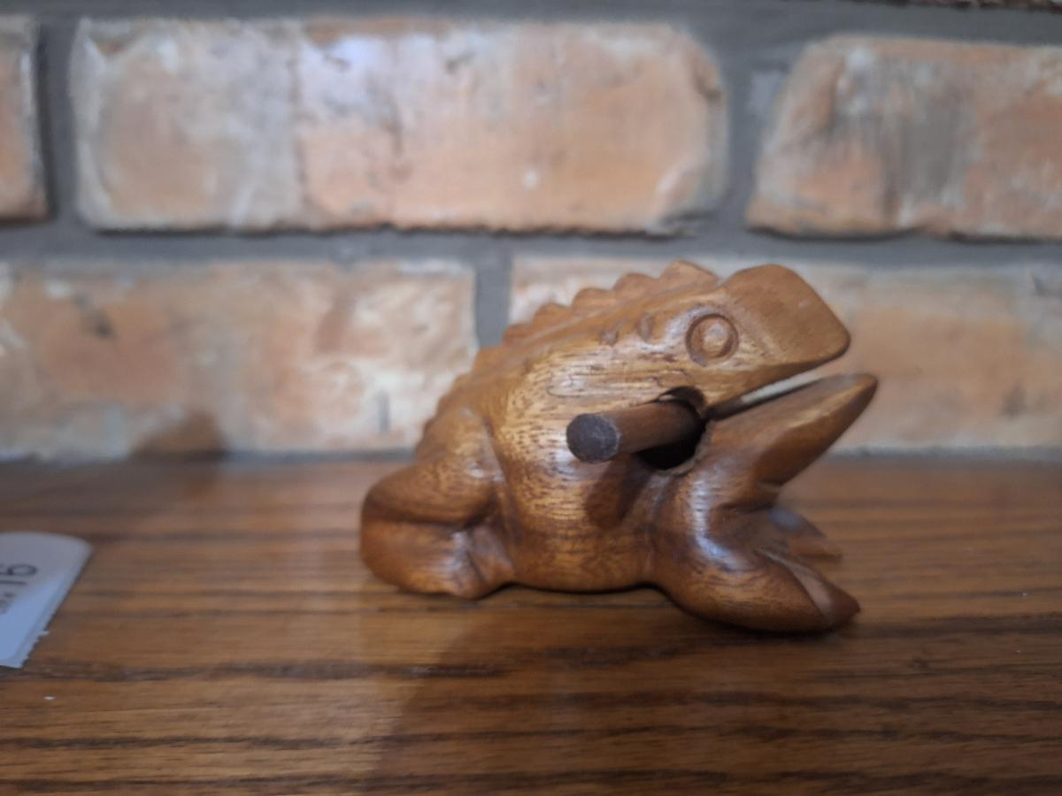 Running the included stick (seen in its mouth) along the ridges creates a sound like a croaking frog or a "ribbit".
