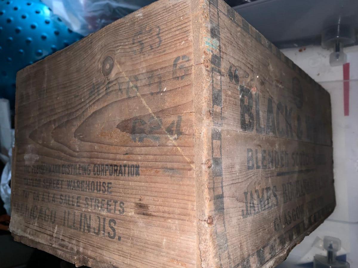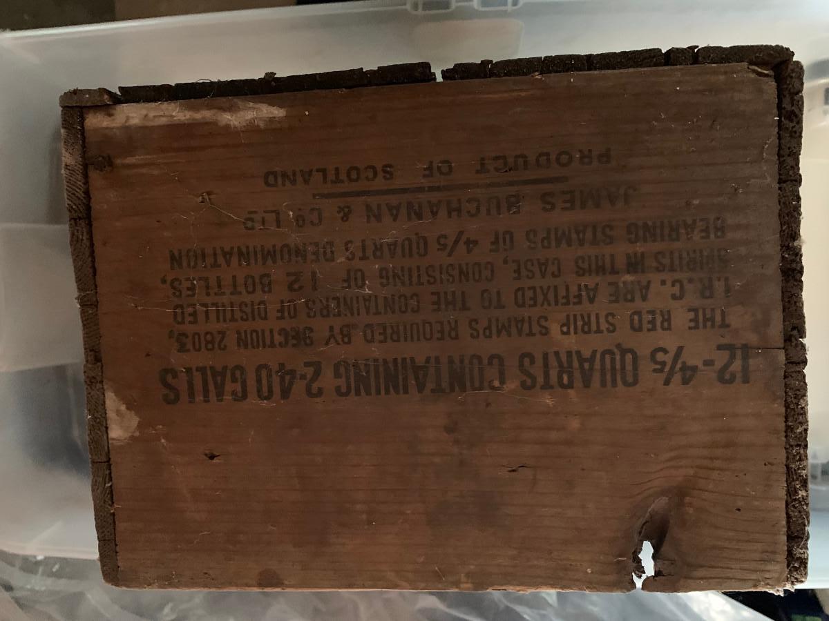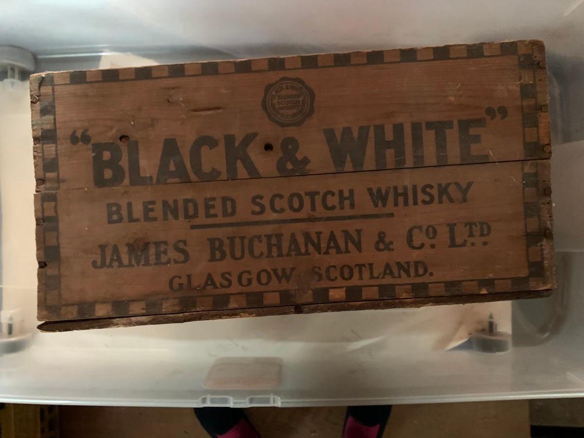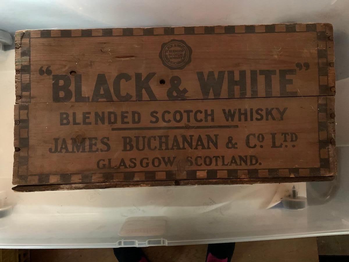 wooden fruit box with label#2 black n white blended scotch whiskey (6 wooden boxes total listed in this sale listing)