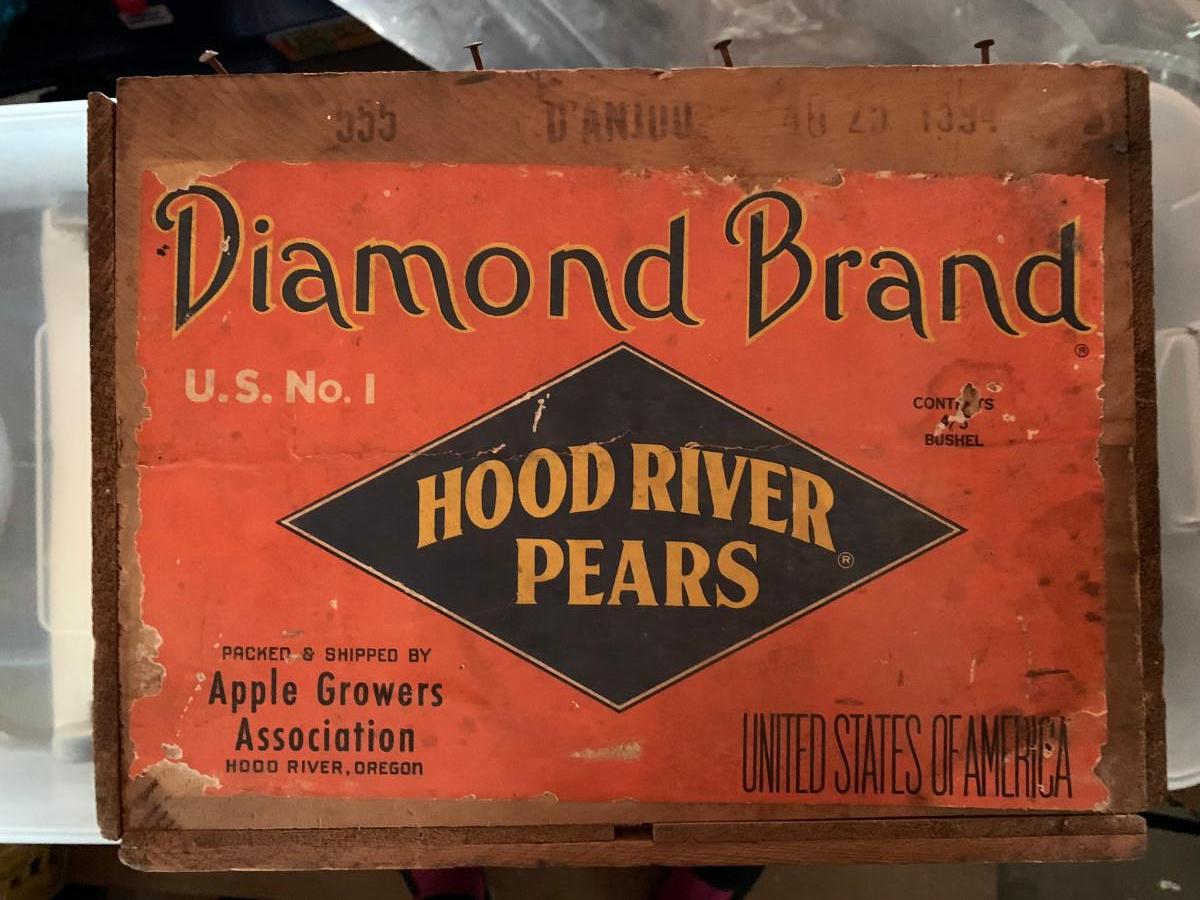 wooden fruit box with label# 3 , diamond brand hood river pears (6 total listed in this sale listing)