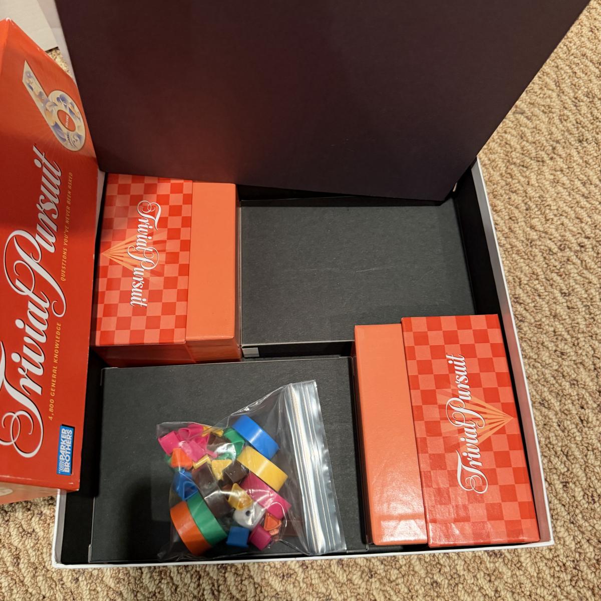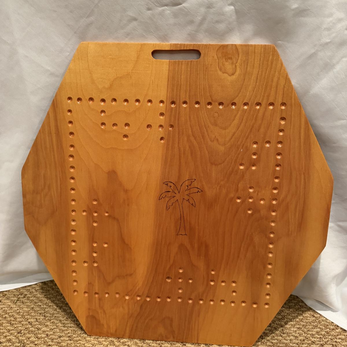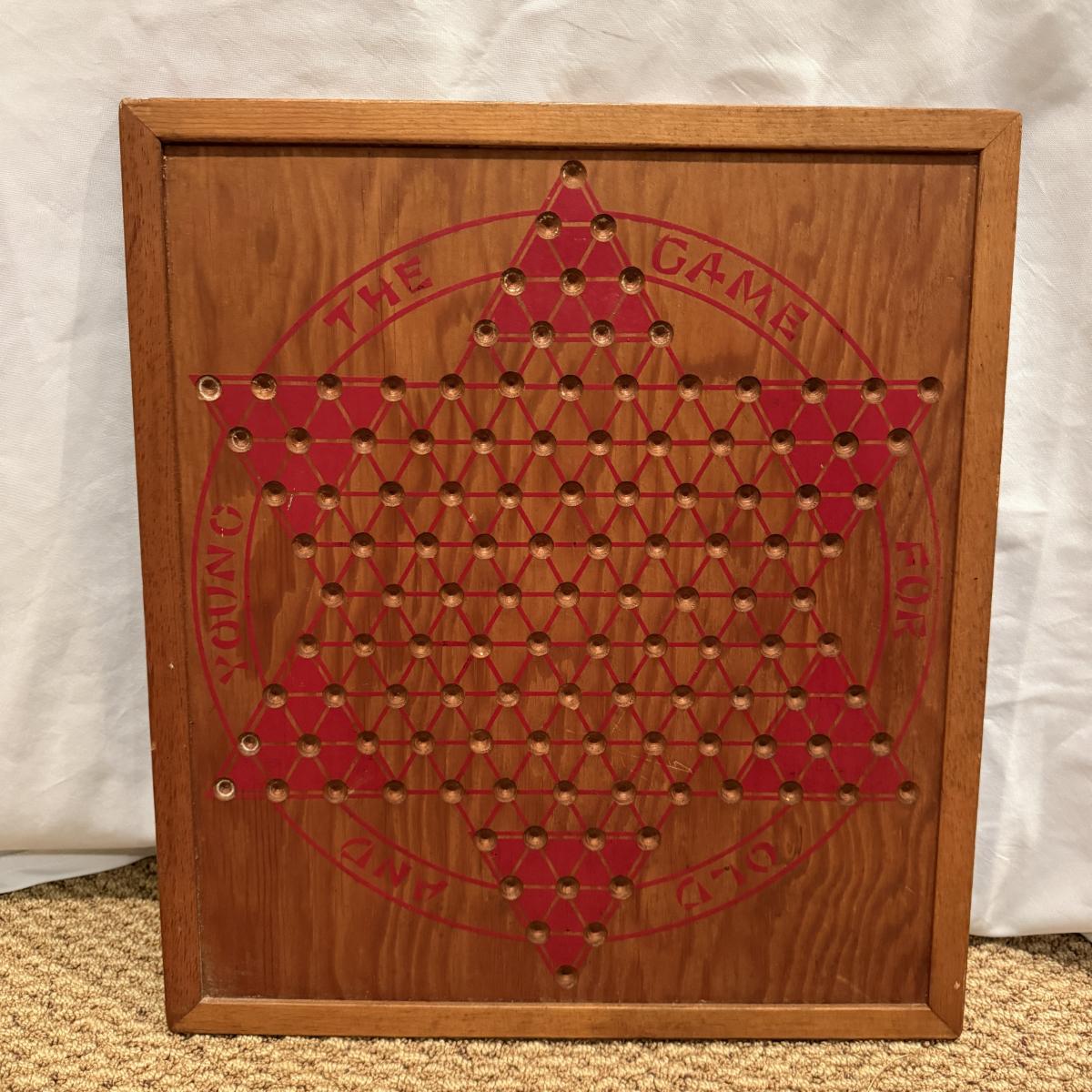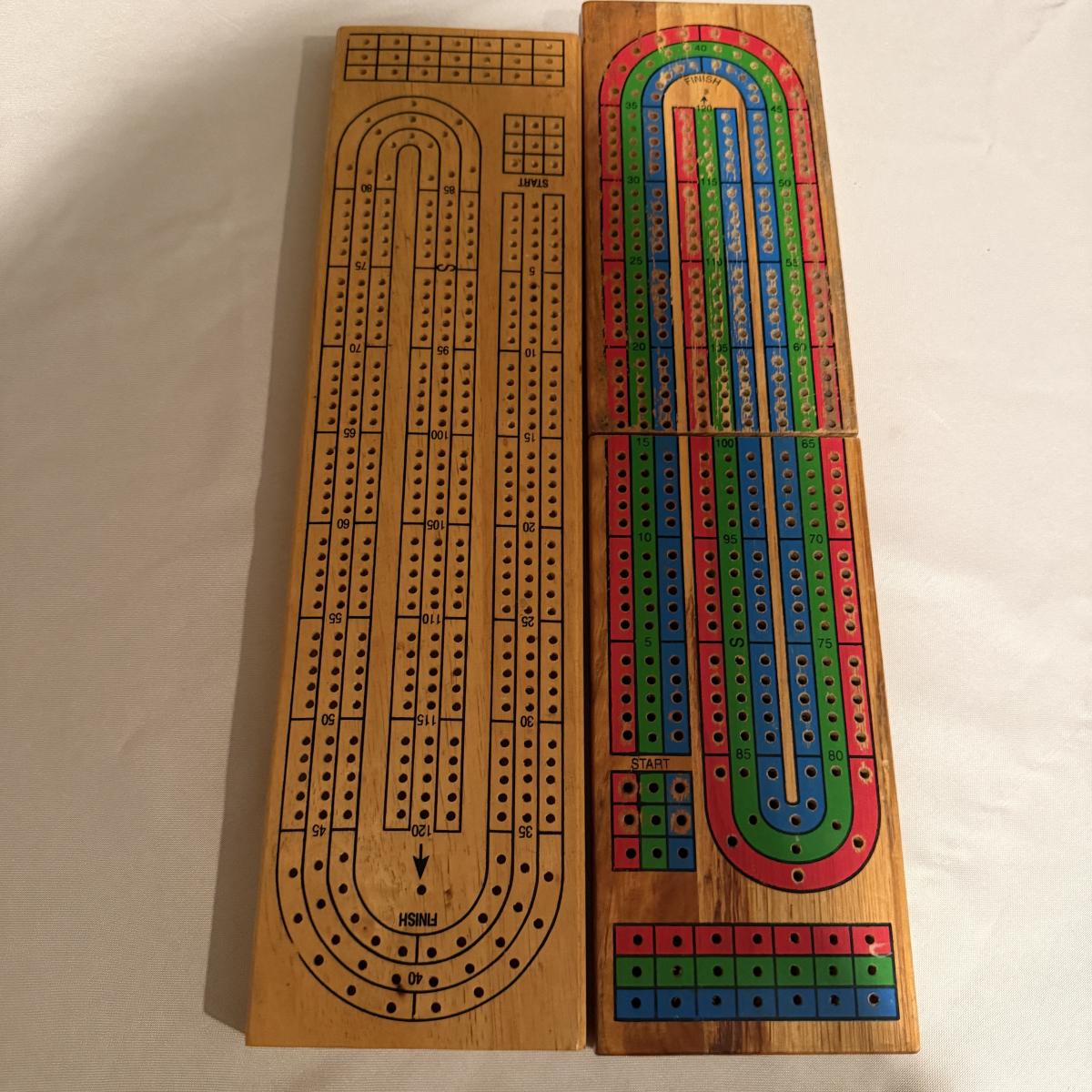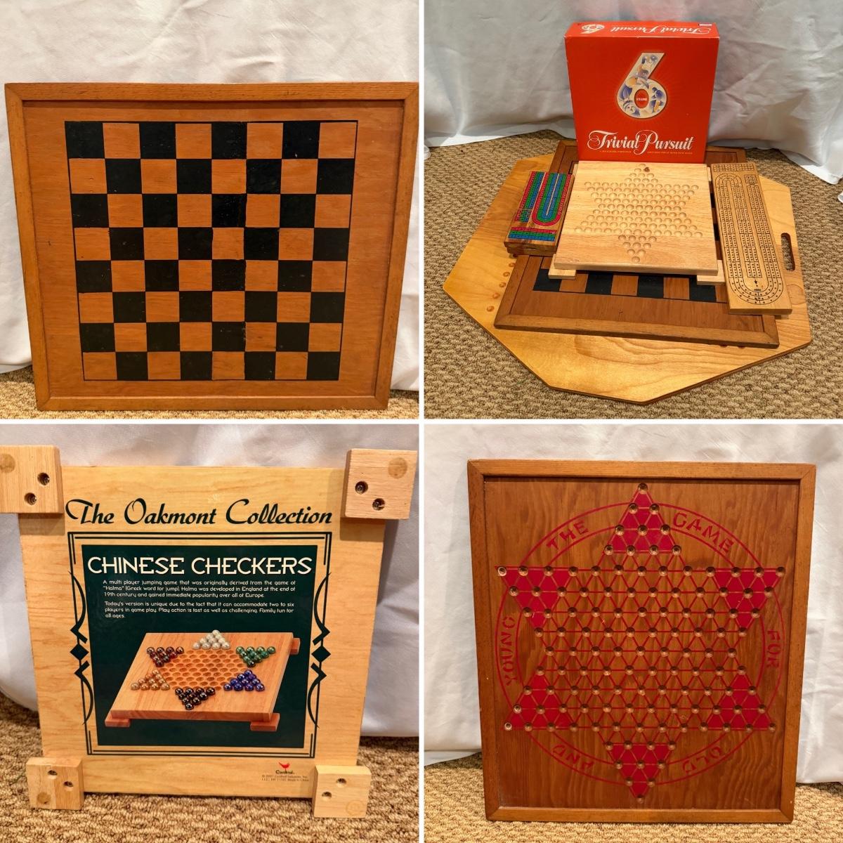 Lot includes wooden checkerboard, wooden Jackaroo board, wooden Chinese Checkers board, two wooden cribbage games and a Trivial Pursuit game. One cribbage game is coming apart at hinge, see pictures. Jackaroo board measures 23” x 24”H.