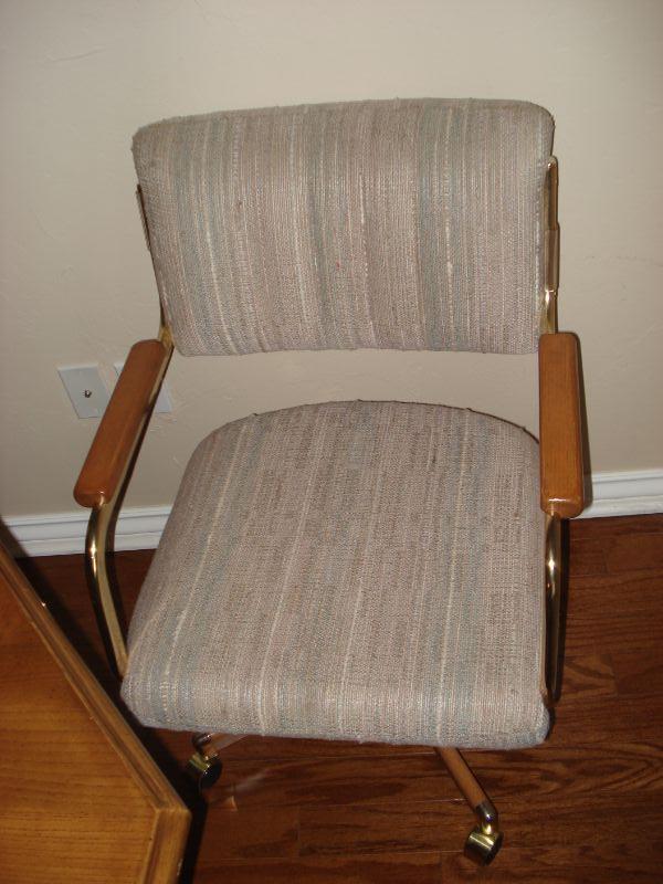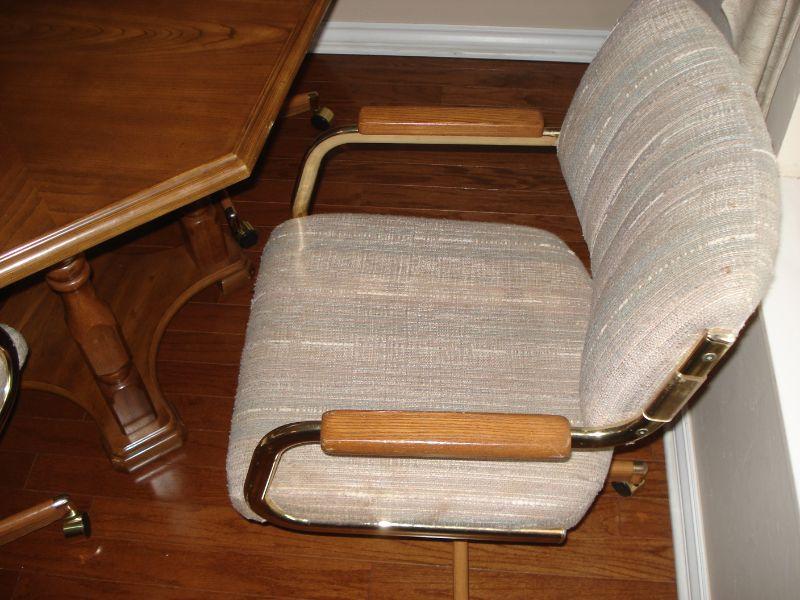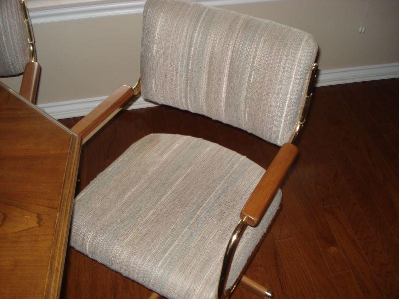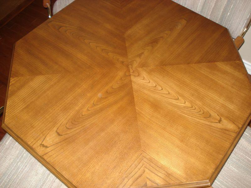 42"x 29" vintage octagonal table with 4 rolling chairs on castors. Few little scuffs around bottom of table, 1 chair has a slight stain as shown in picture. Overall a nice set for its age, would make a great Poker or game table.