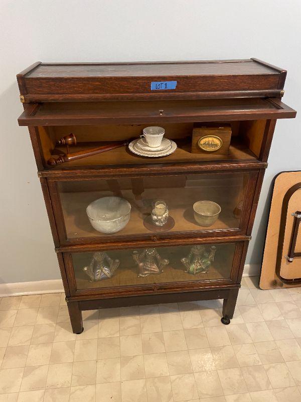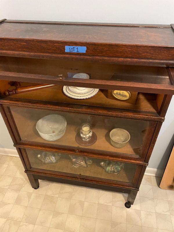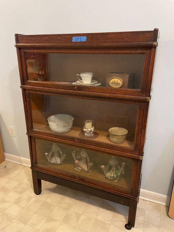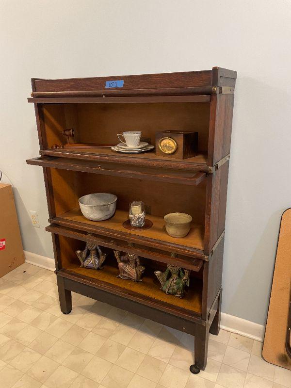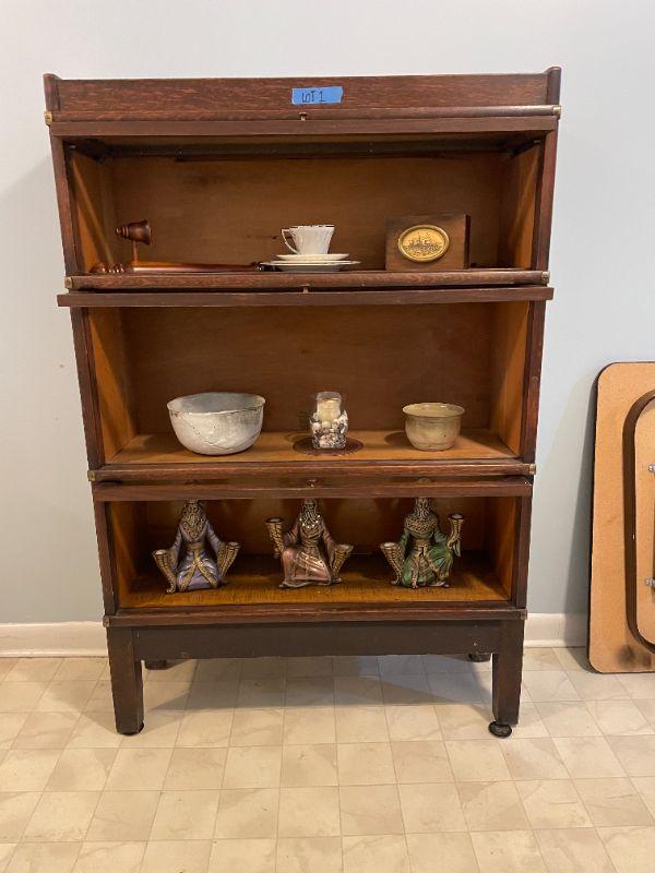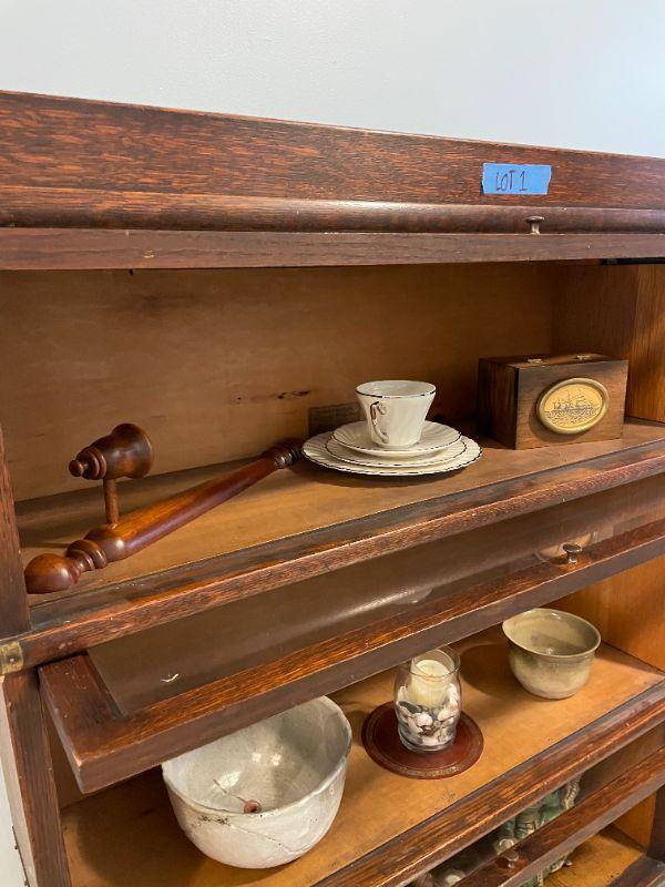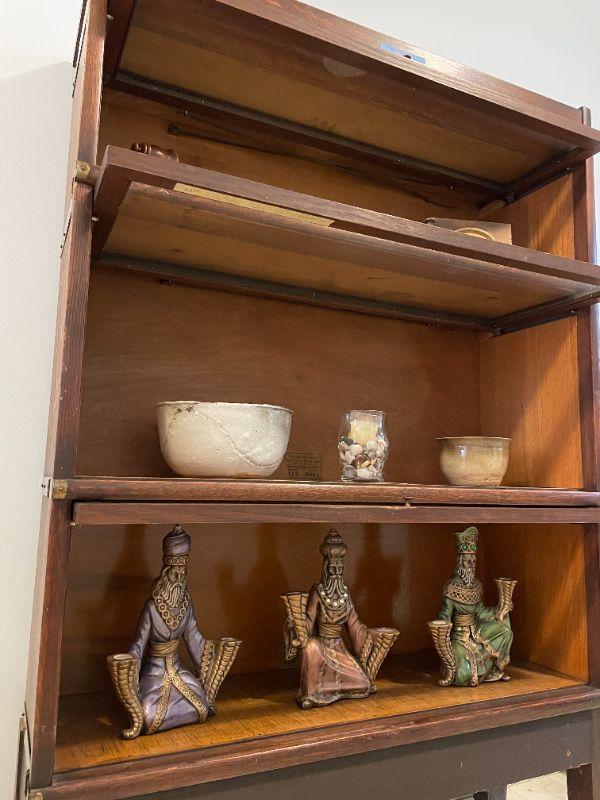 Globe Wernicke 3 Unit Antique Barrister Stacking Lawyer's Oak Bookcase, scrimshaw box, seashell candle, charm Syracuse china (Made in USA), wooden candle holder, (2) signed pottery bowls, (3) painted candle holders