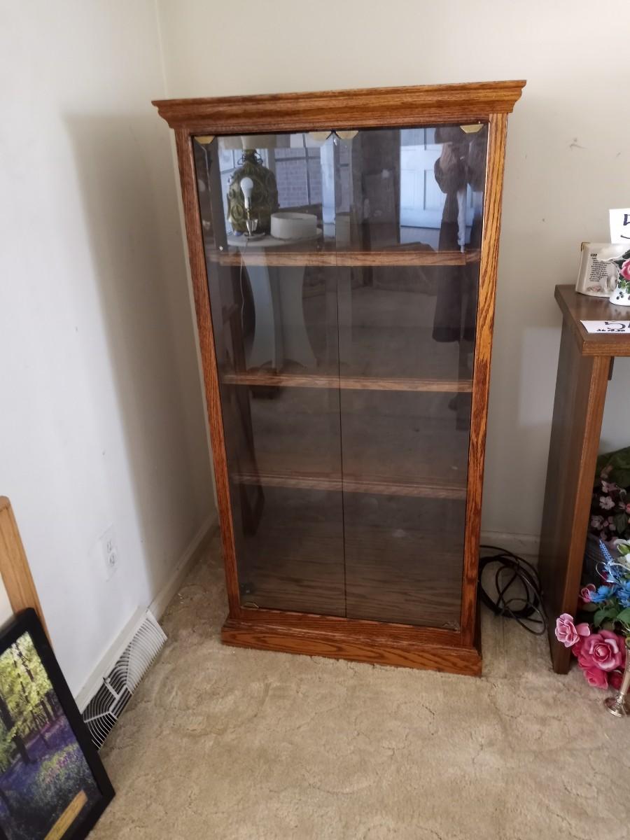 LARGE STEREO CABINET WITH GLASS FRONT FOUR SHELVES