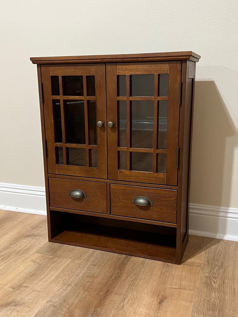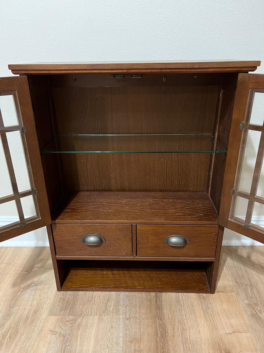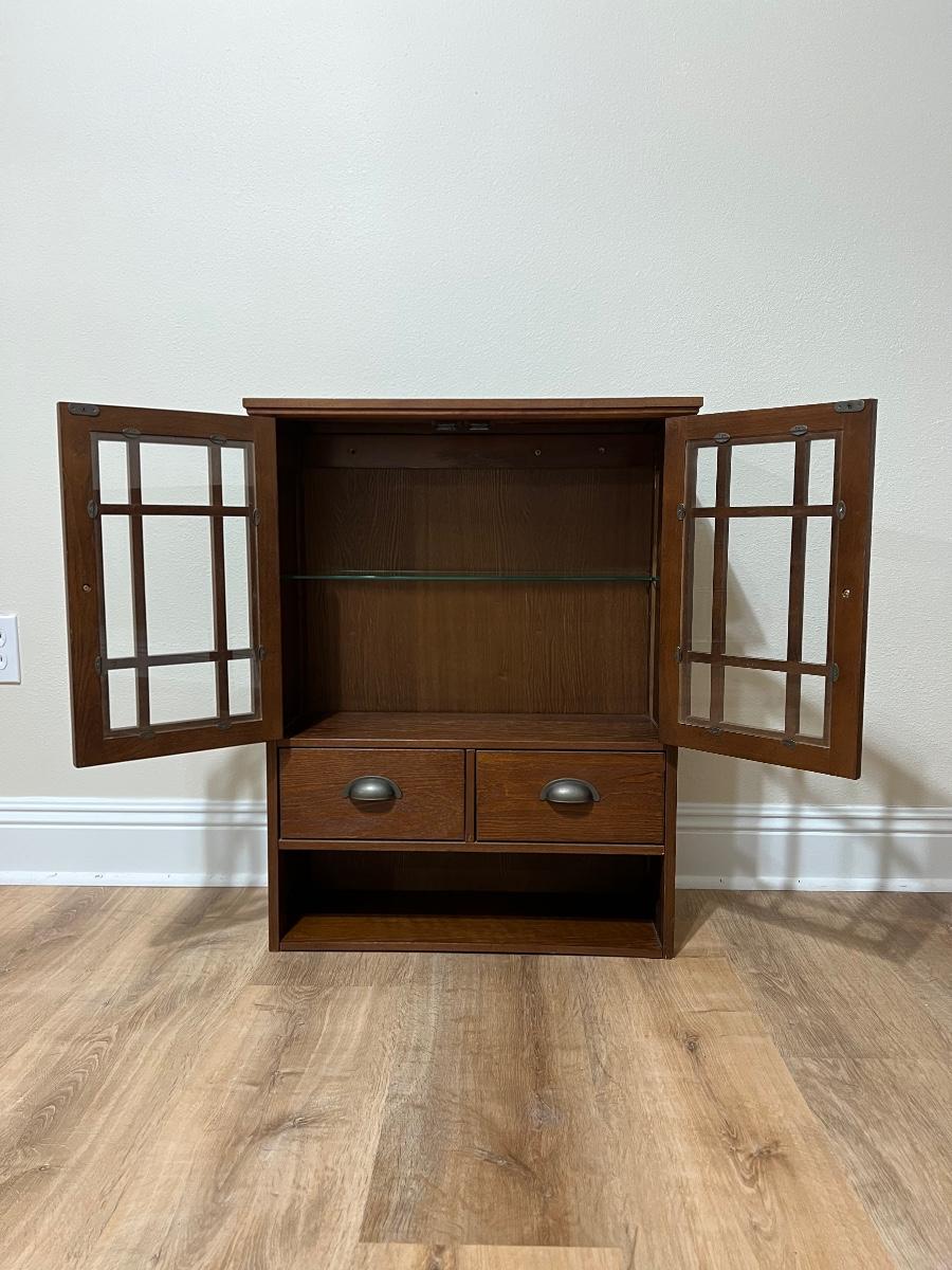 Has 2 drawers and one glass shelf with metal knobs. Can be Hung on the Wall or let sit on top a cabinet. 30” H x 24” W x 8.5” D