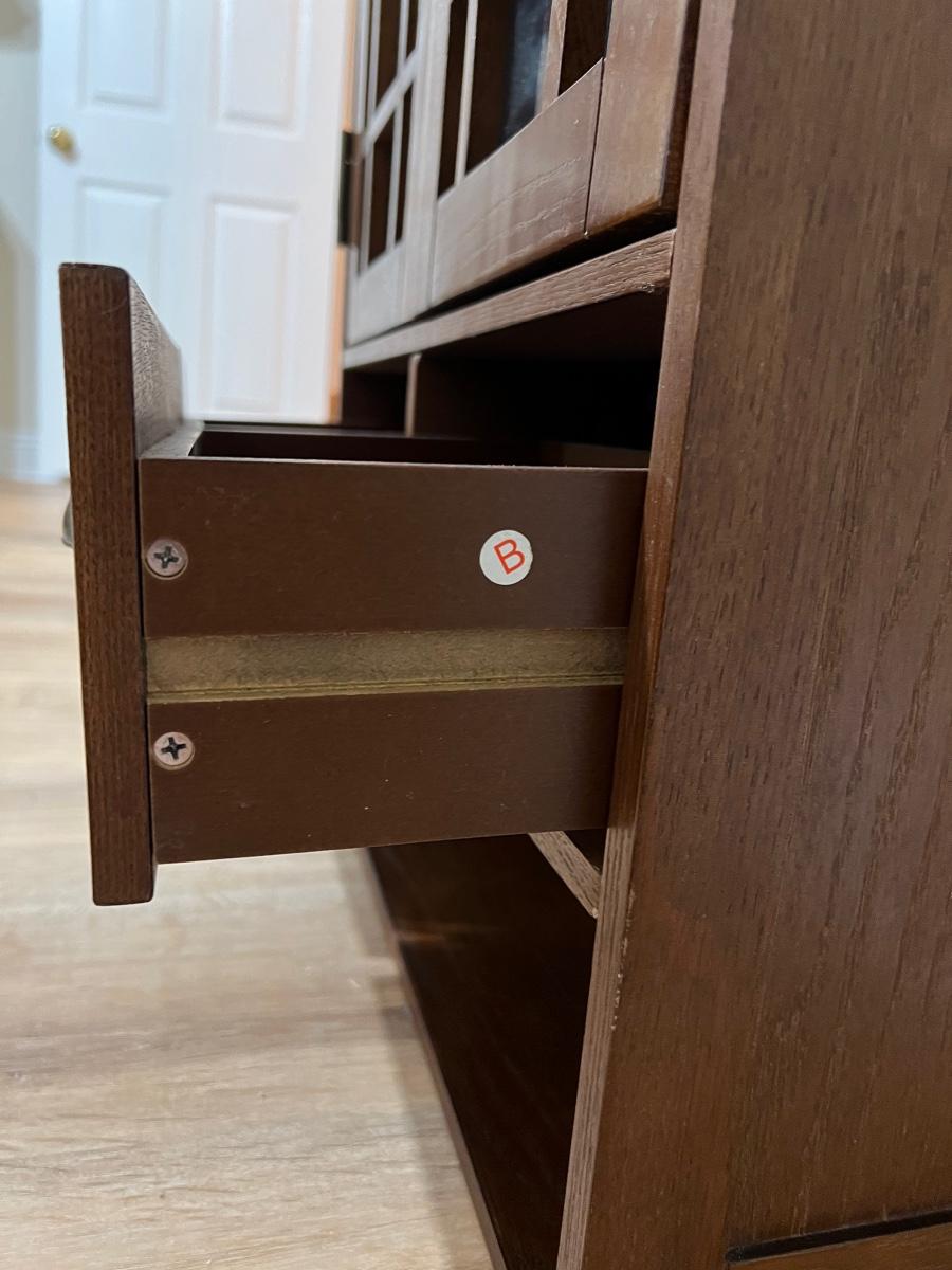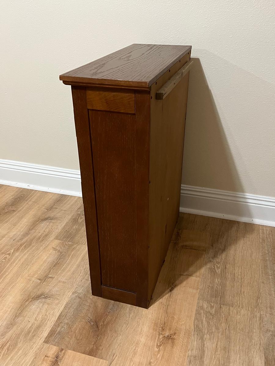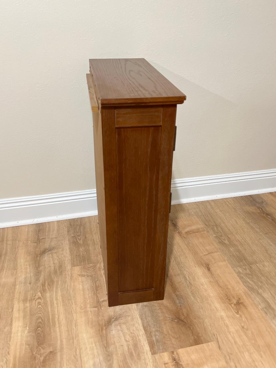 Has 2 drawers and one glass shelf with metal knobs. Can be Hung on the Wall or let sit on top a cabinet. 30” H x 24” W x 8.5” D