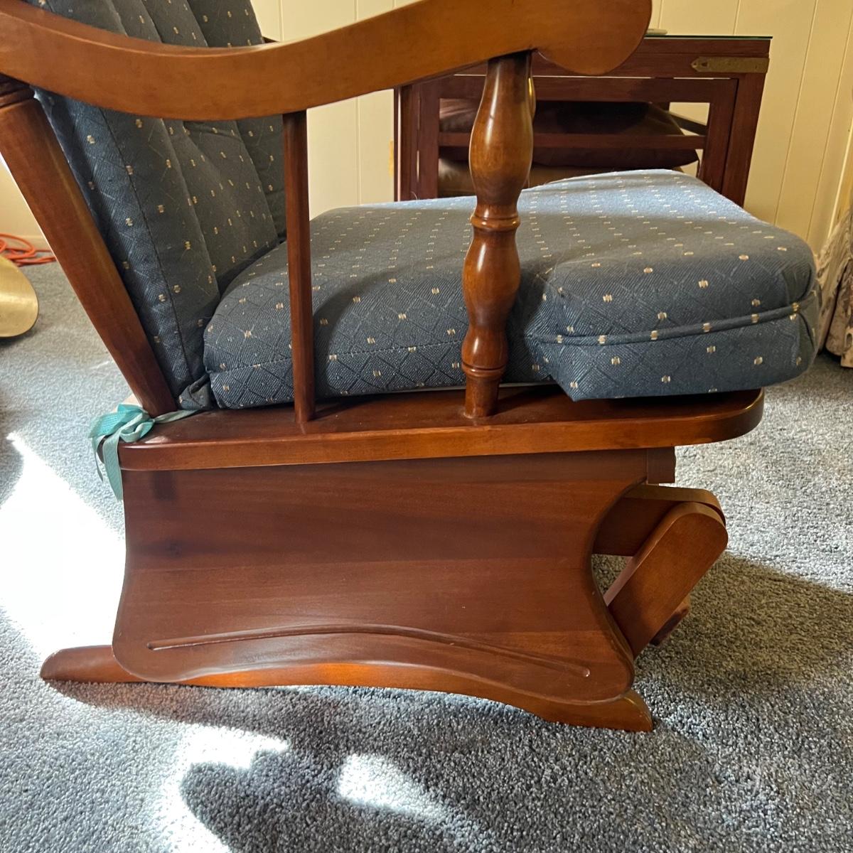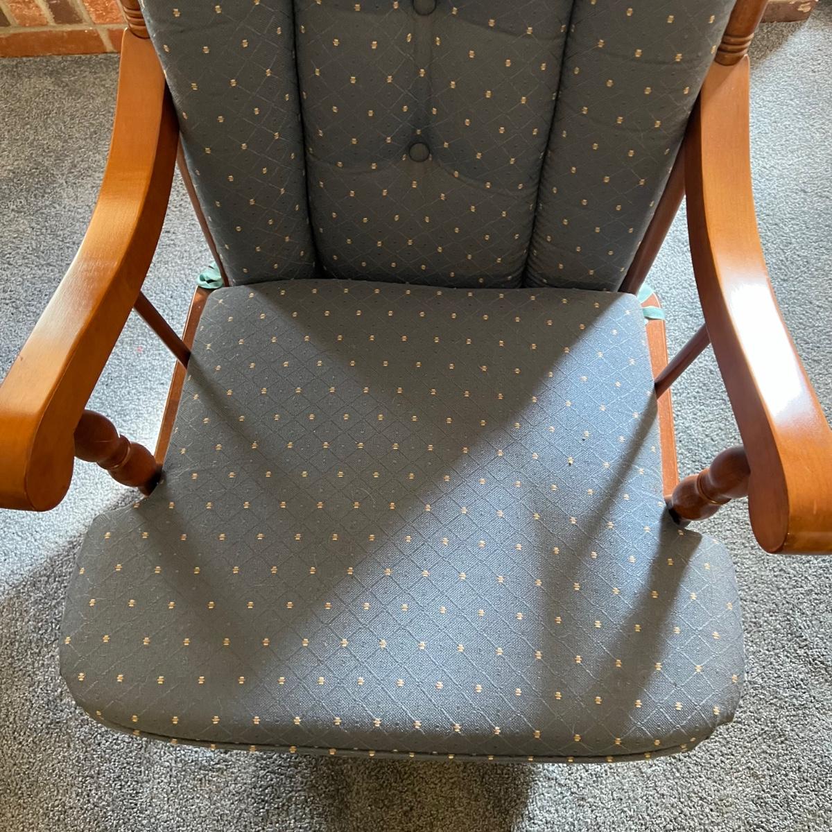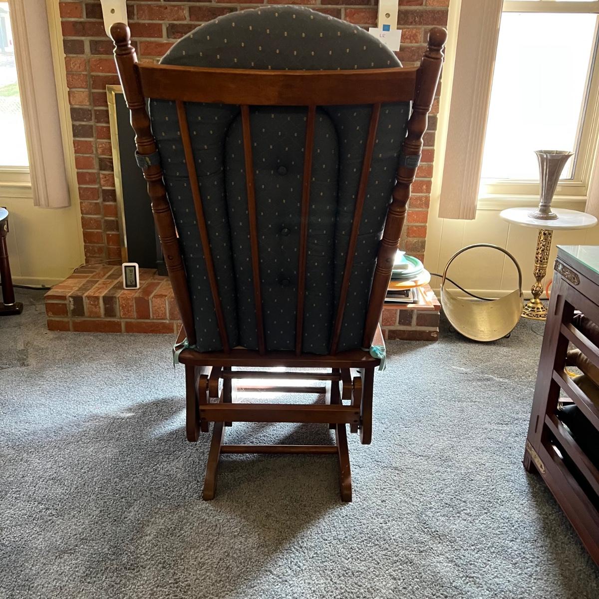 Wooden armchair glider with blue polka dot-type fabric covering. The chair measures 23.5” x 23” x 43”H. The seat height is 18”H and the back measures 18.5”H above the seat cushion. Local pick up only