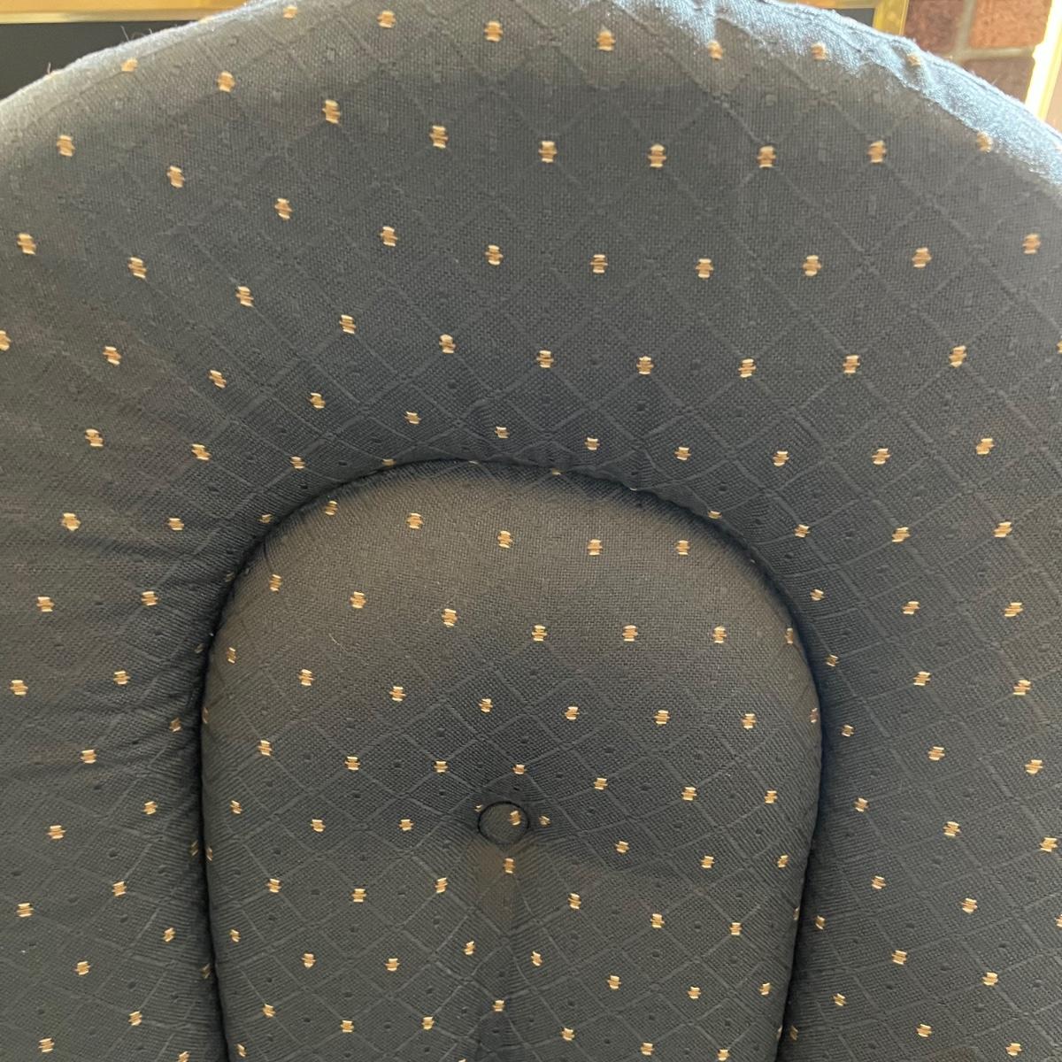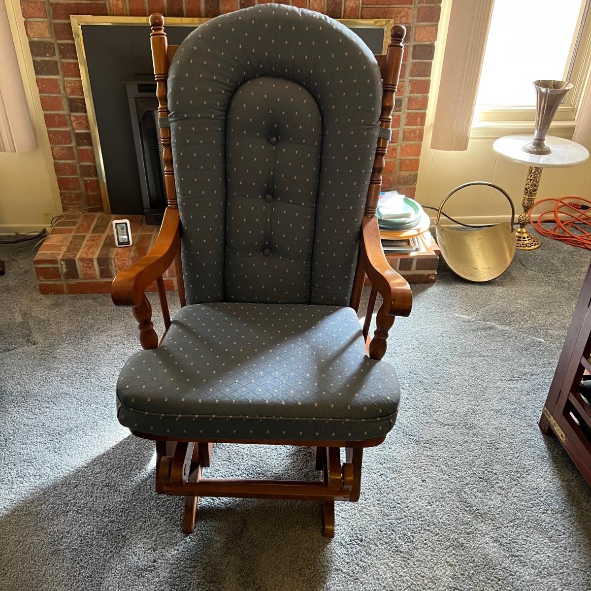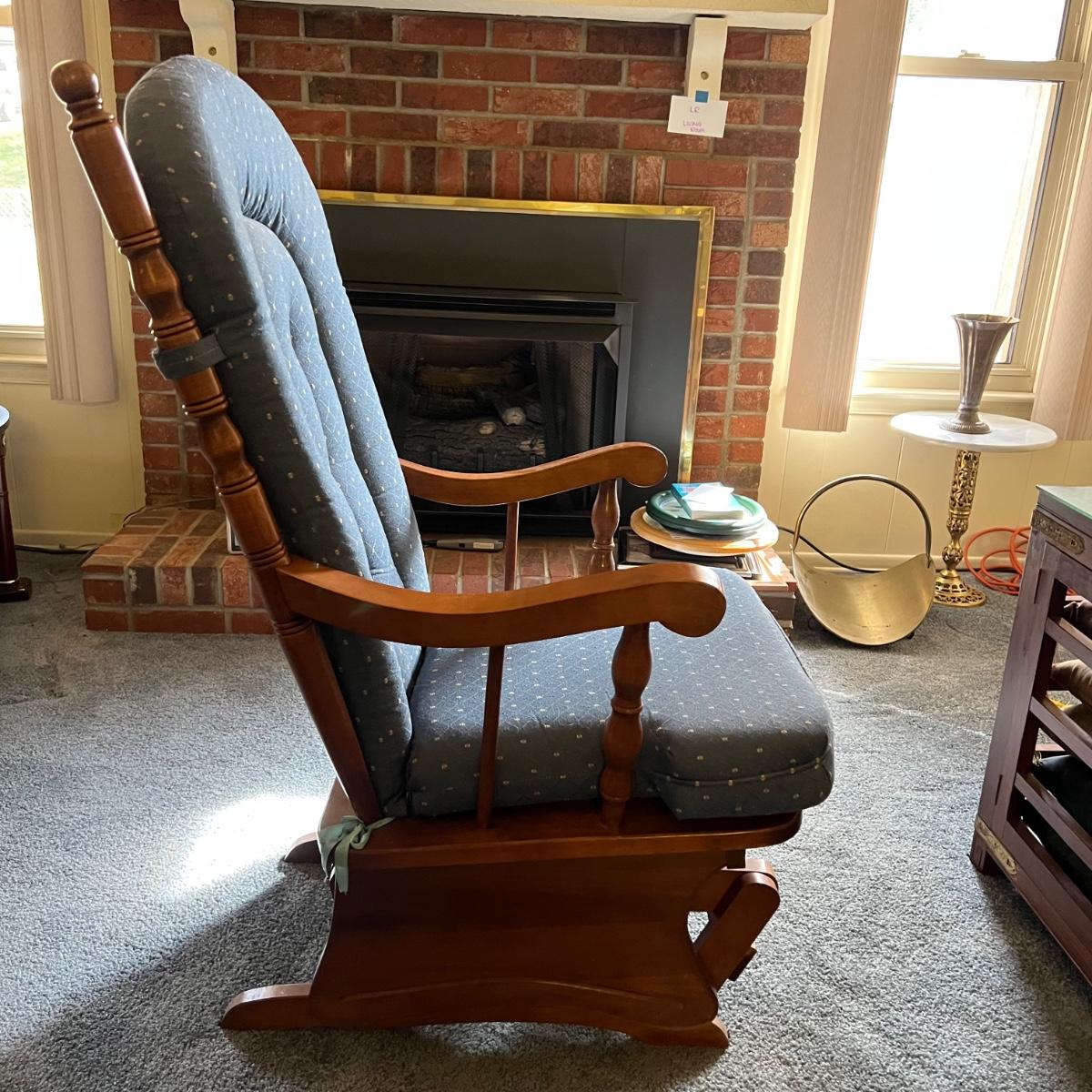 Wooden armchair glider with blue polka dot-type fabric covering. The chair measures 23.5” x 23” x 43”H. The seat height is 18”H and the back measures 18.5”H above the seat cushion. Local pick up only