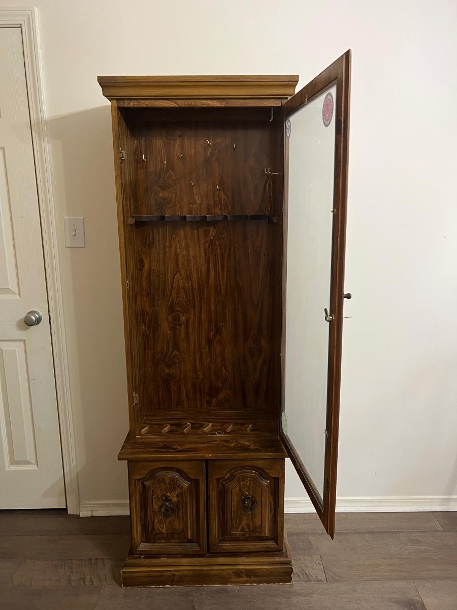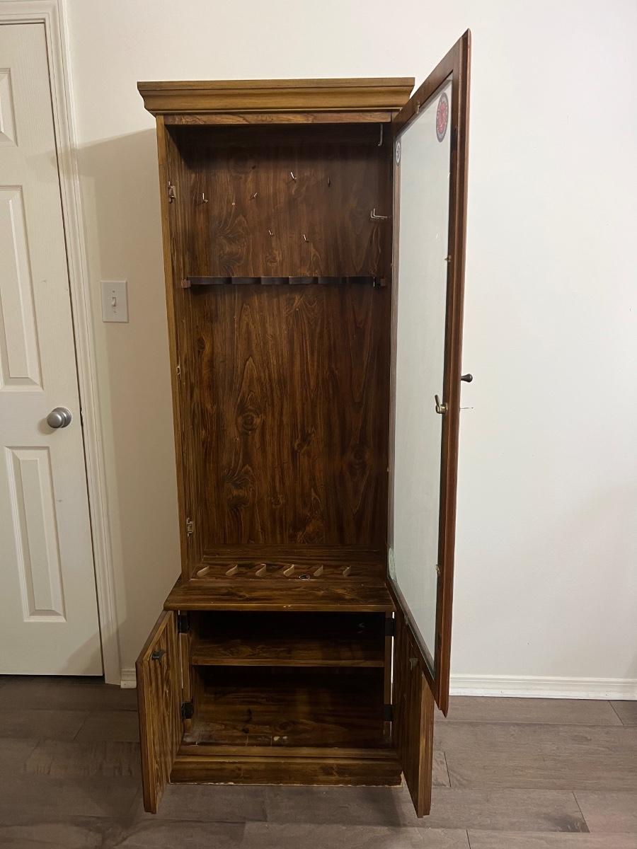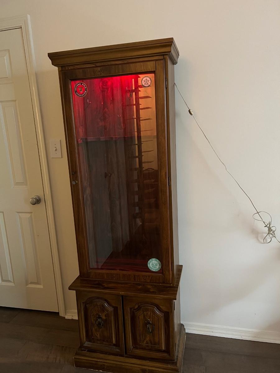 Wooden Gun Cabinet With Lock and key. Lights up. Measure 70 inches tall, 24 inches wide and 14 inches deep. See pictures for some imperfections on the bottom.