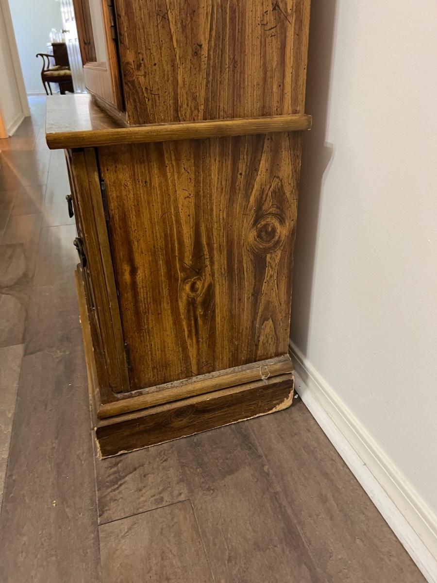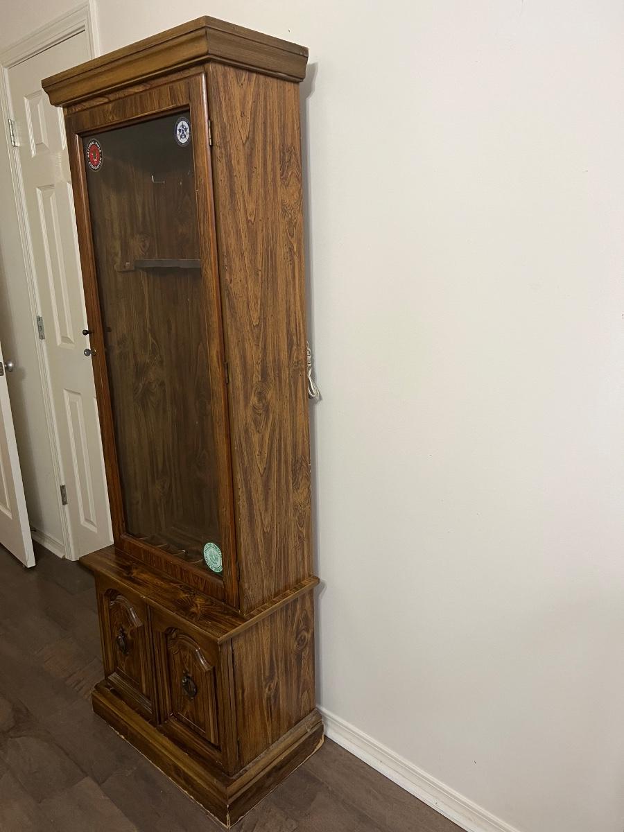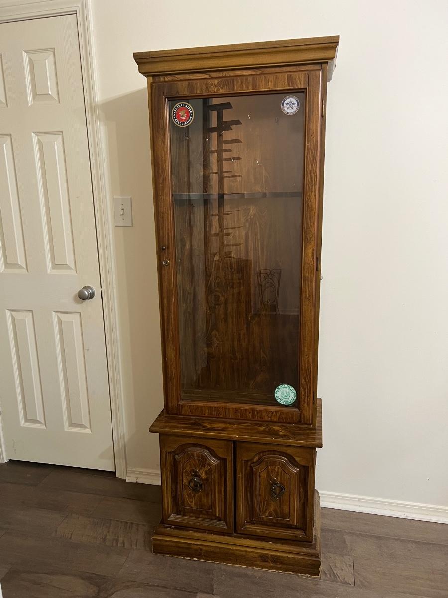 Wooden Gun Cabinet With Lock and key. Lights up. Measure 70 inches tall, 24 inches wide and 14 inches deep. See pictures for some imperfections on the bottom.