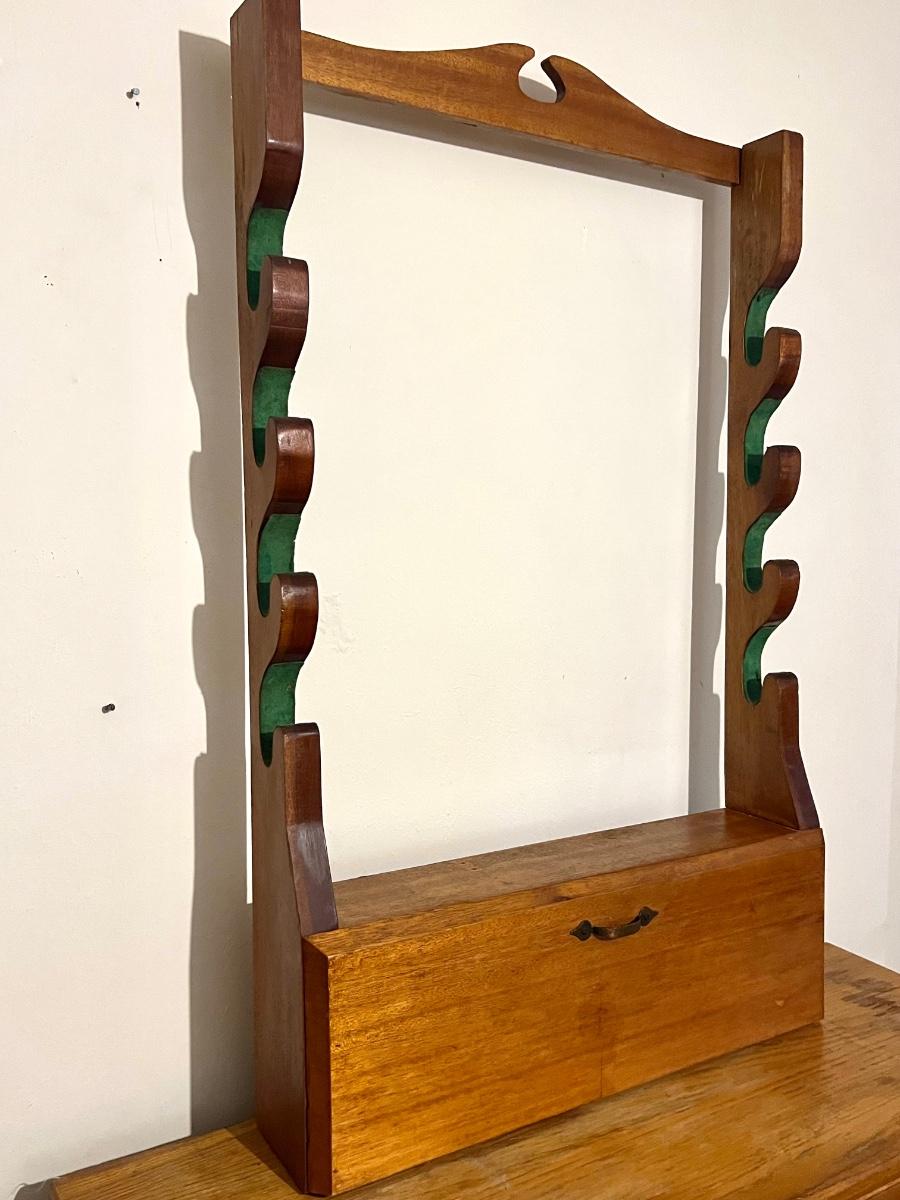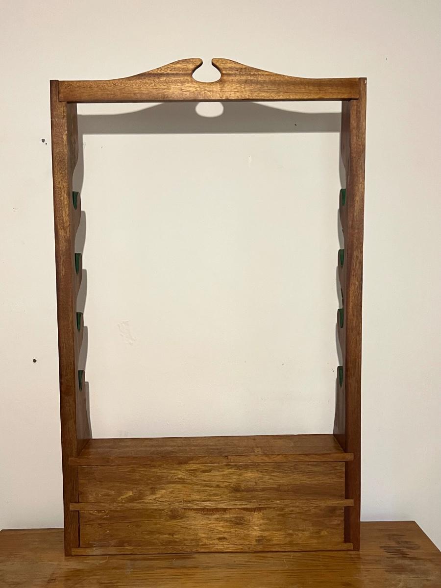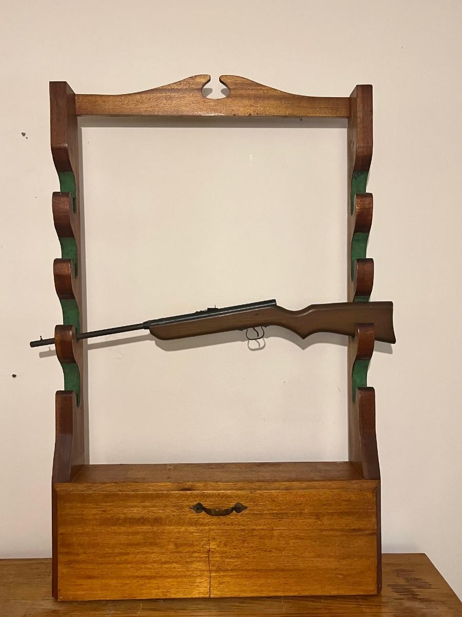 Wooden gun/ pole holder with Storage. See pictures on back as there is no mounting pieces for hanging. Measures 46 inches tall and approximately 6 1/2 inches deep. Has 4 slots. This is for the wooden rack only, not the air riffle.