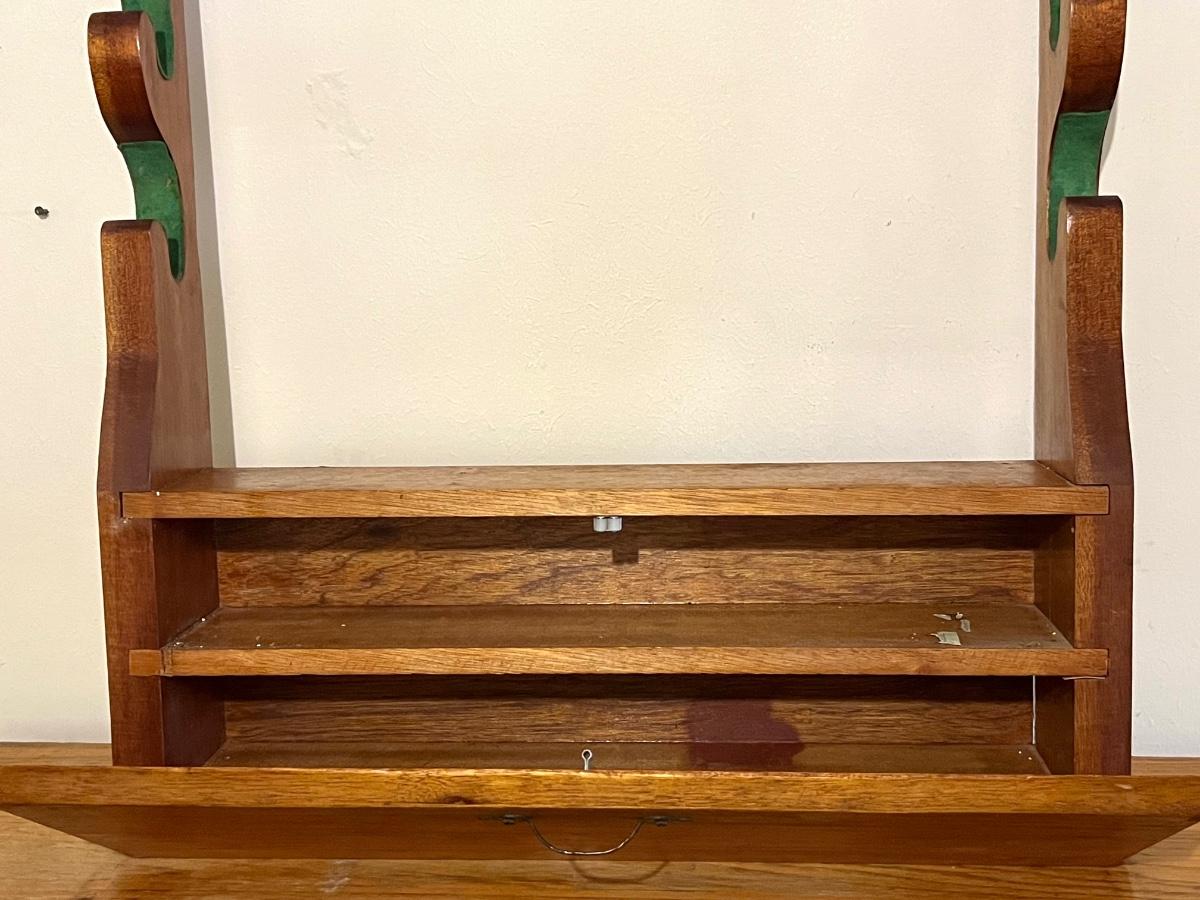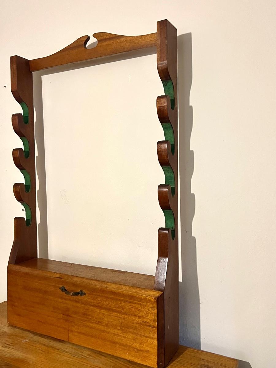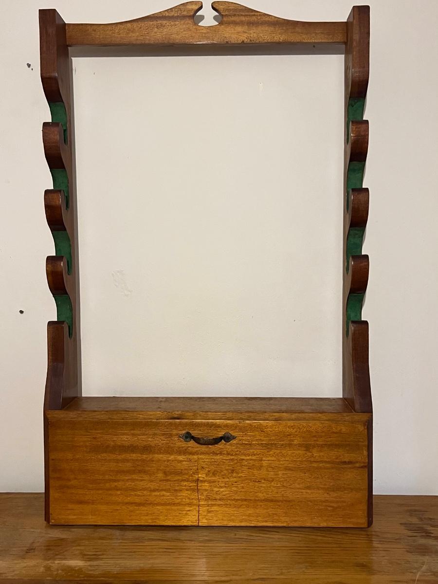Wooden gun/ pole holder with Storage. See pictures on back as there is no mounting pieces for hanging. Measures 46 inches tall and approximately 6 1/2 inches deep. Has 4 slots. This is for the wooden rack only, not the air riffle.