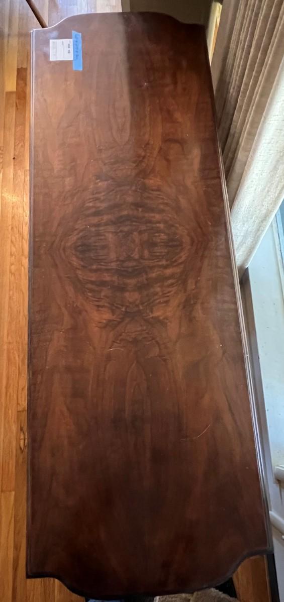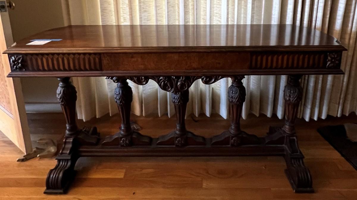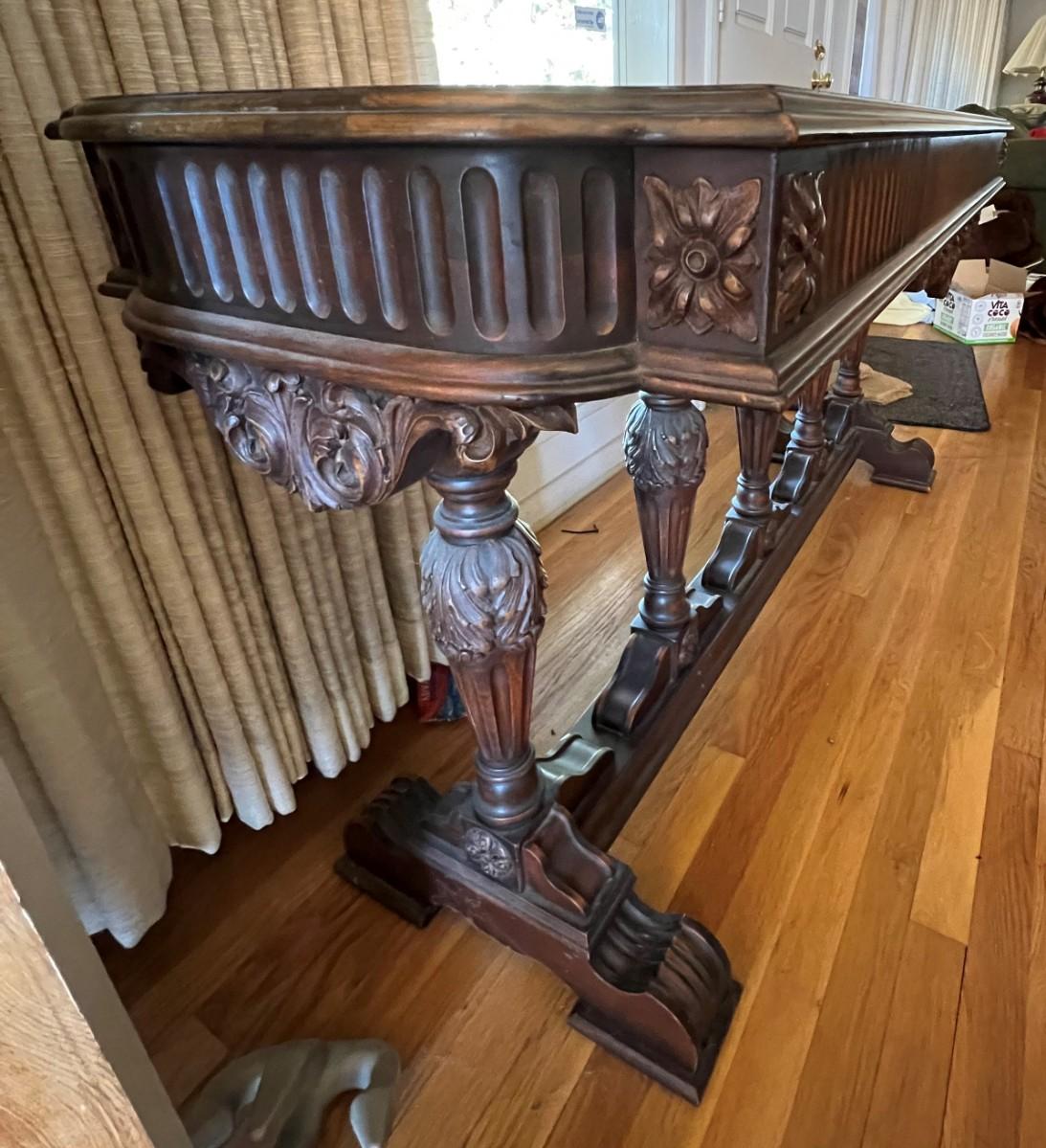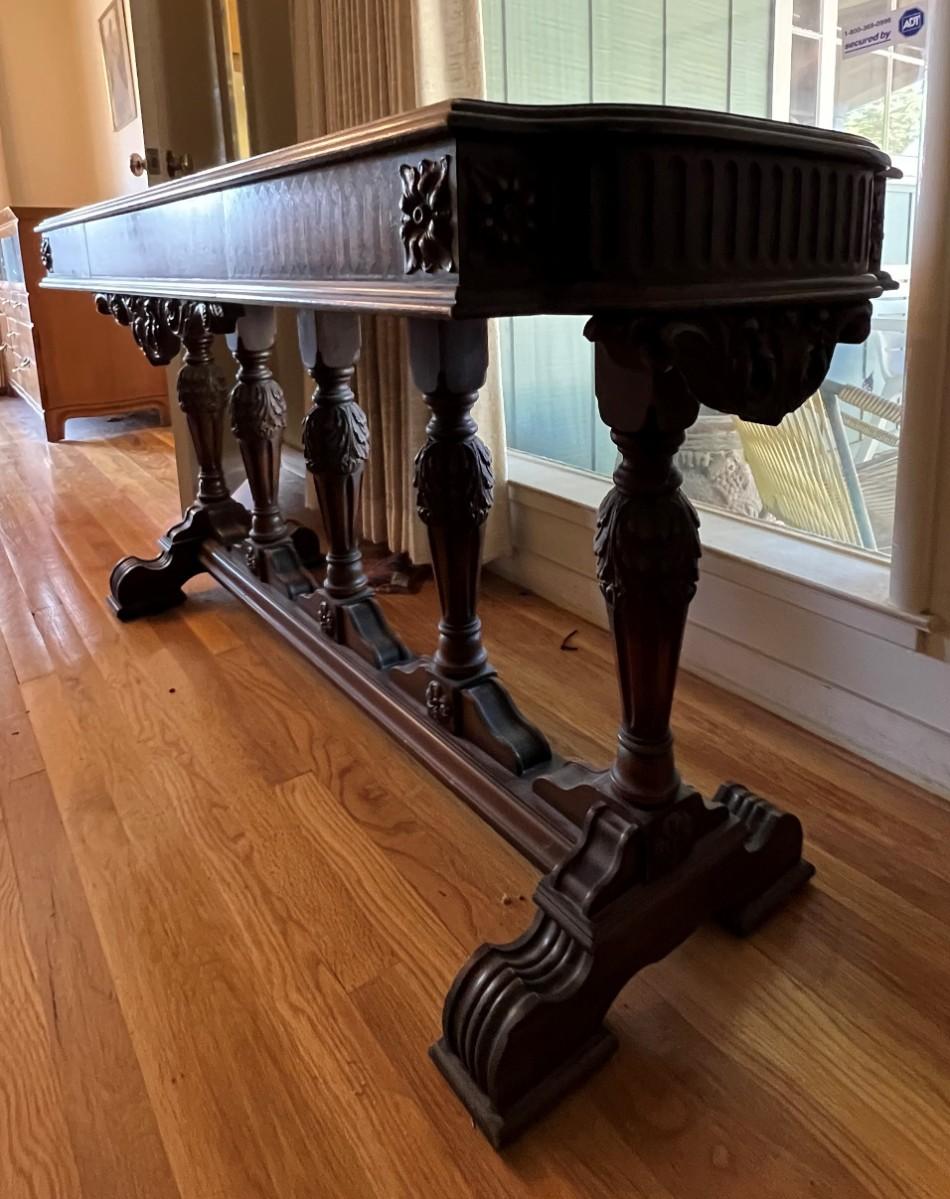 Dark wood hallway table measuring 60 x 20 x 31, with ornate pedestal legs and wood carvings.