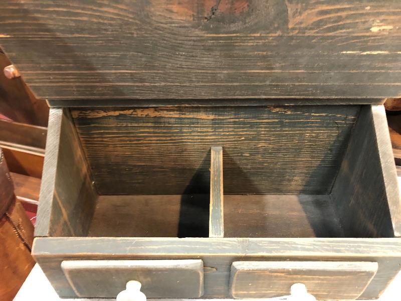 Opens up and shows two small compartments inside. Two fake drawers on outside. Fun for kitchen area or even your office