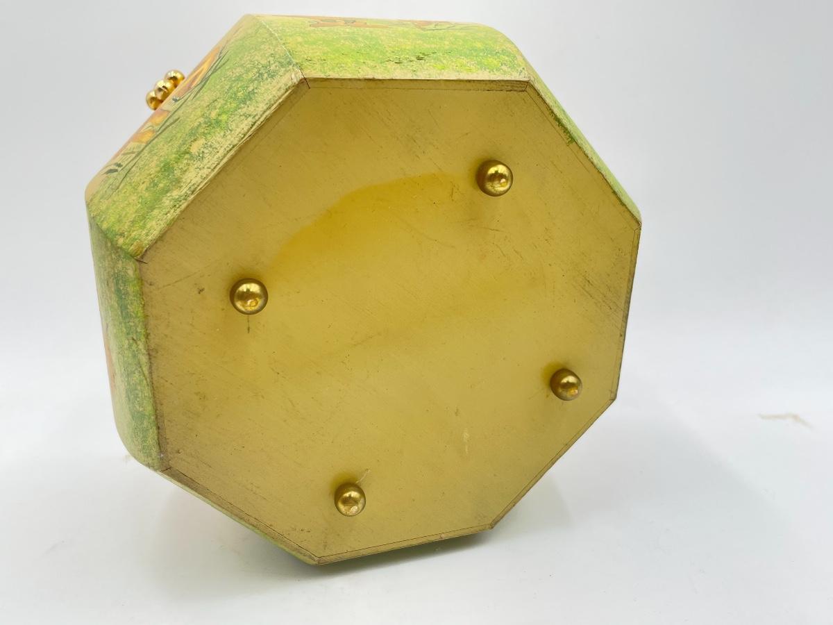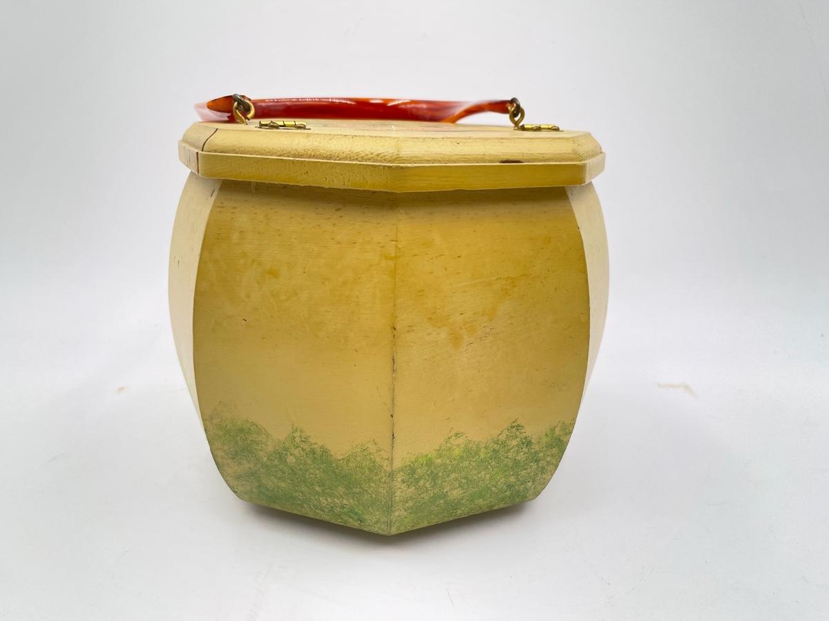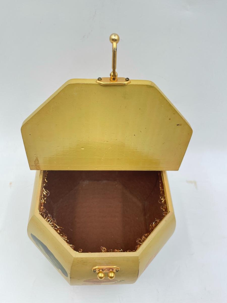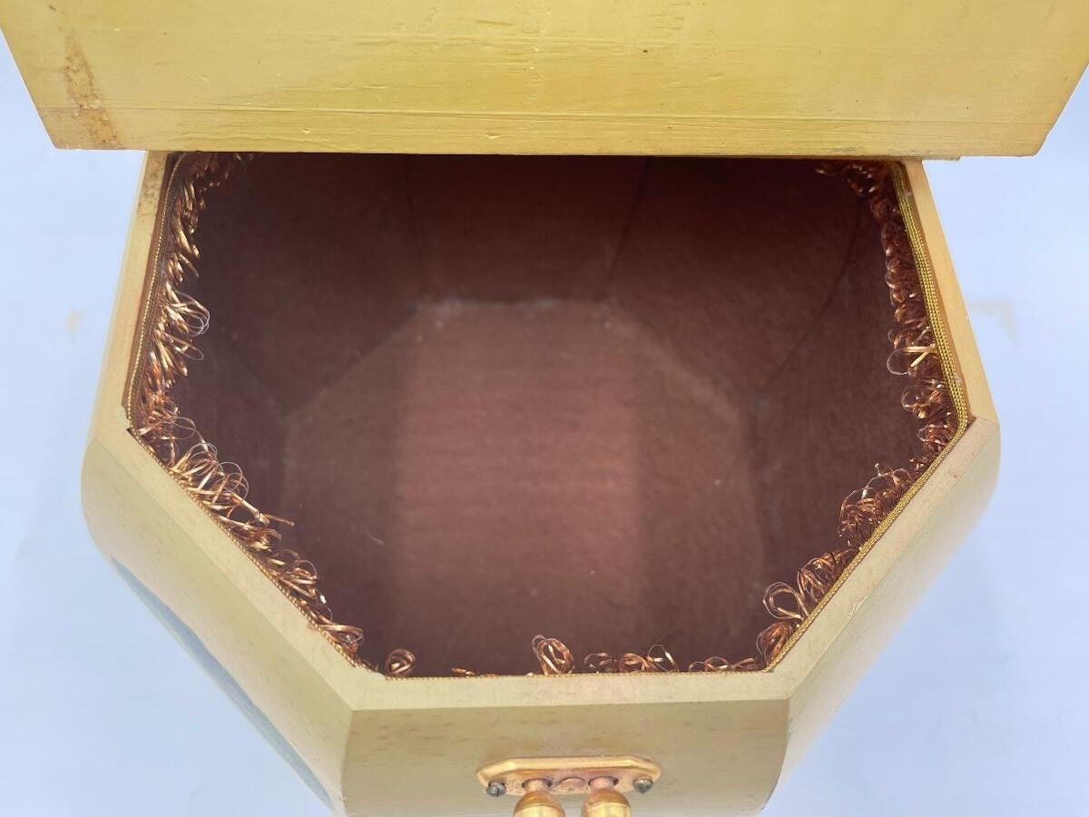 Such a unique piece! Half of the top folds back as the lid, inside is lined with fabric. May have some mild stains/discoloration. Approx 6” wide.