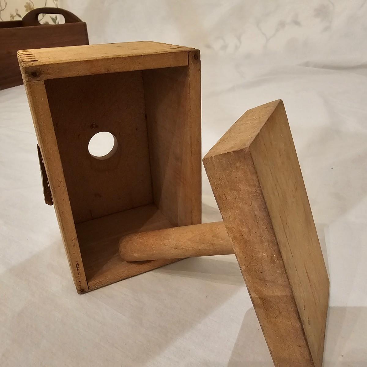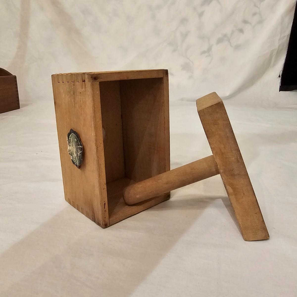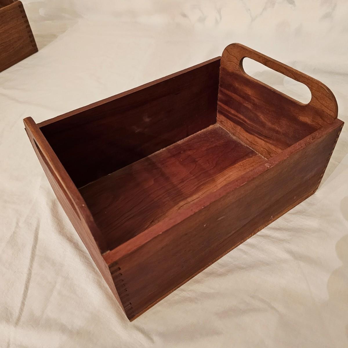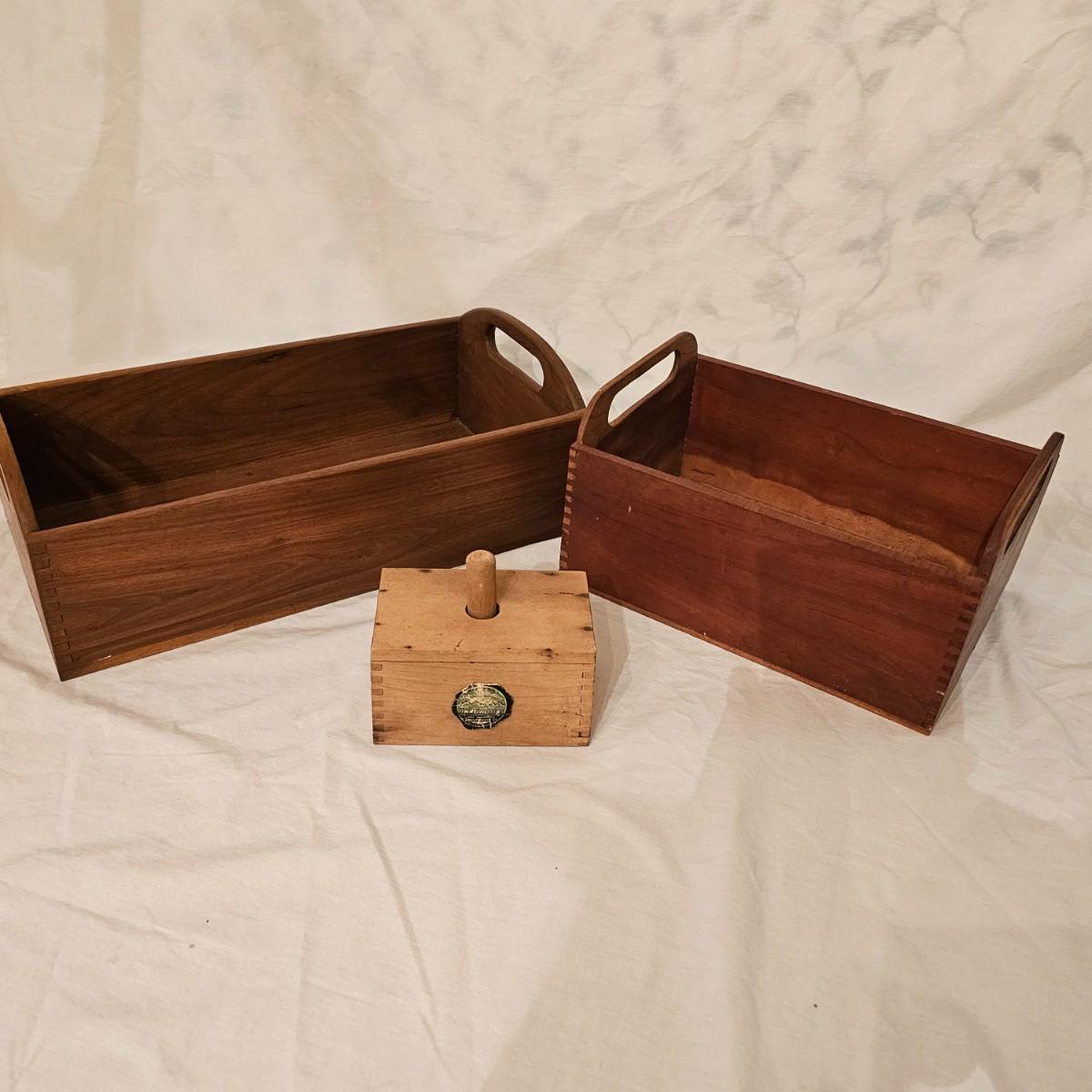 Two solid wood handled boxes/trays with dovetail corners. Larger piece is 9.5" x 17" x 6"H, smaller is 8.5" x 12" x 6"H. Also includes one hardwood butter mold with dovetail corners, 3.5" x 5.5" x 4"H. See photos for details. Shipping available.
