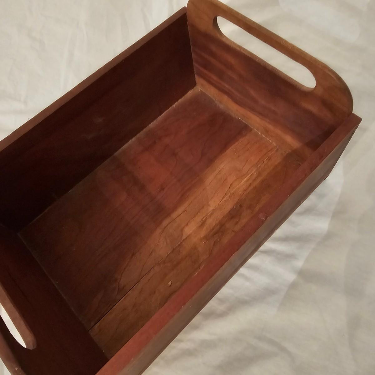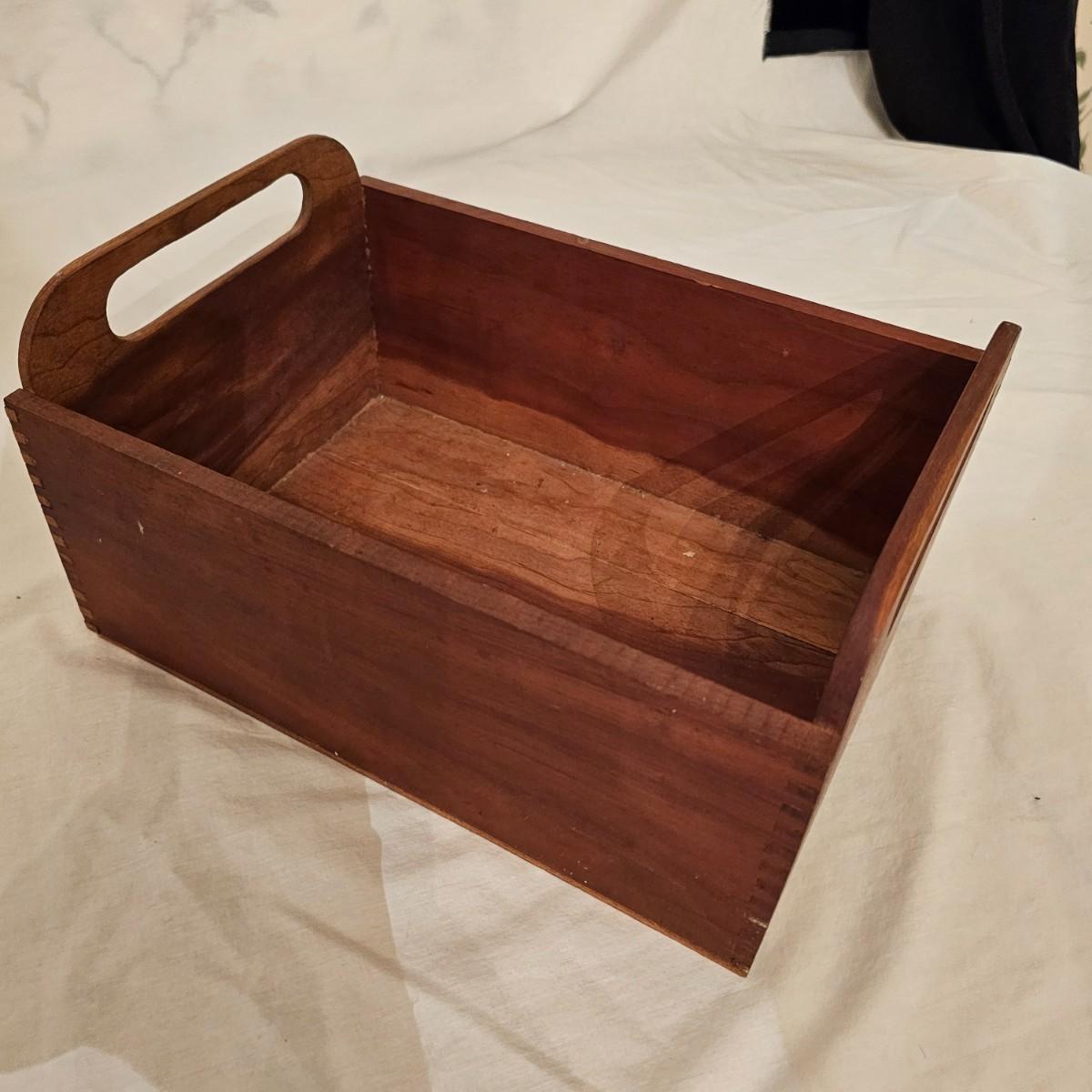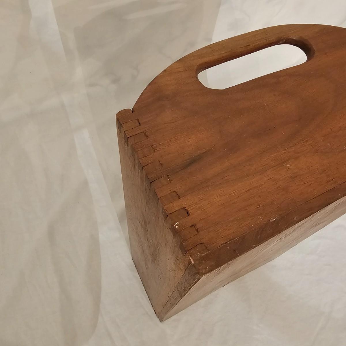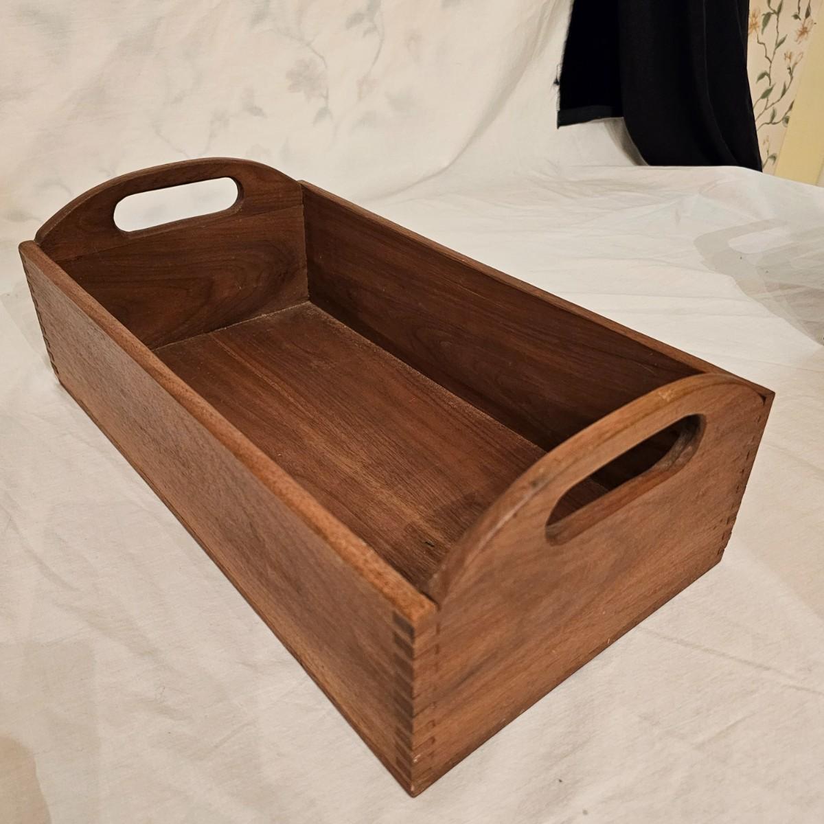 Two solid wood handled boxes/trays with dovetail corners. Larger piece is 9.5" x 17" x 6"H, smaller is 8.5" x 12" x 6"H. Also includes one hardwood butter mold with dovetail corners, 3.5" x 5.5" x 4"H. See photos for details. Shipping available.