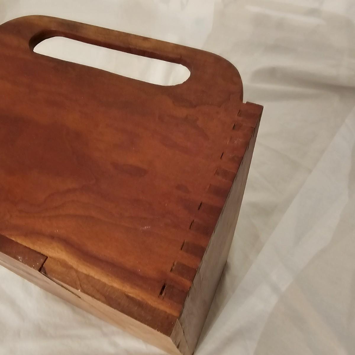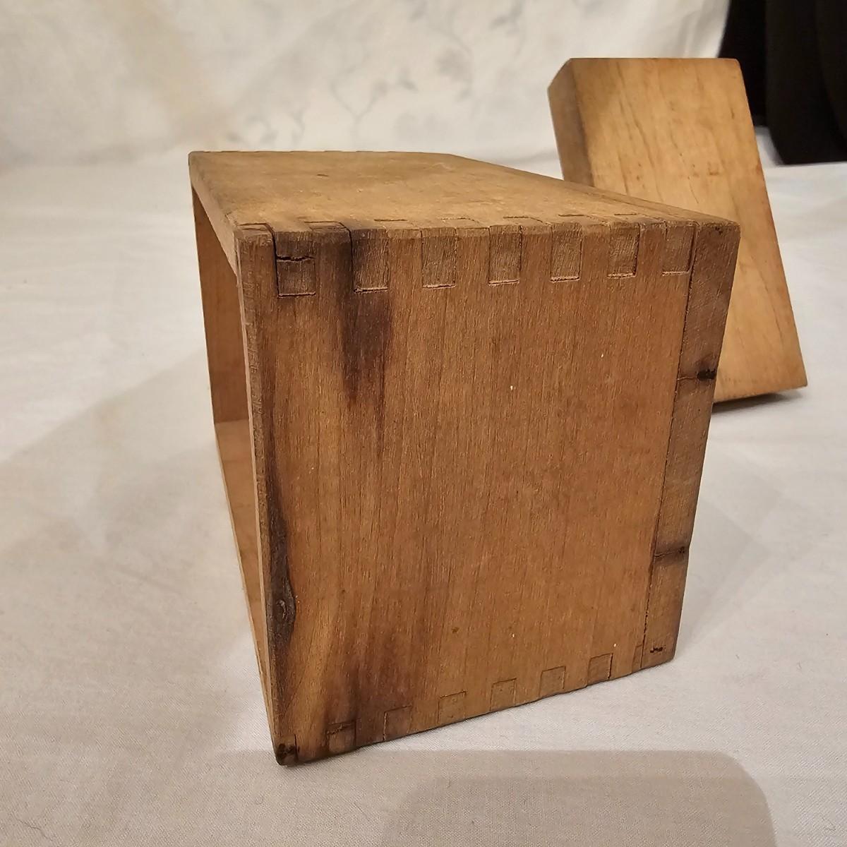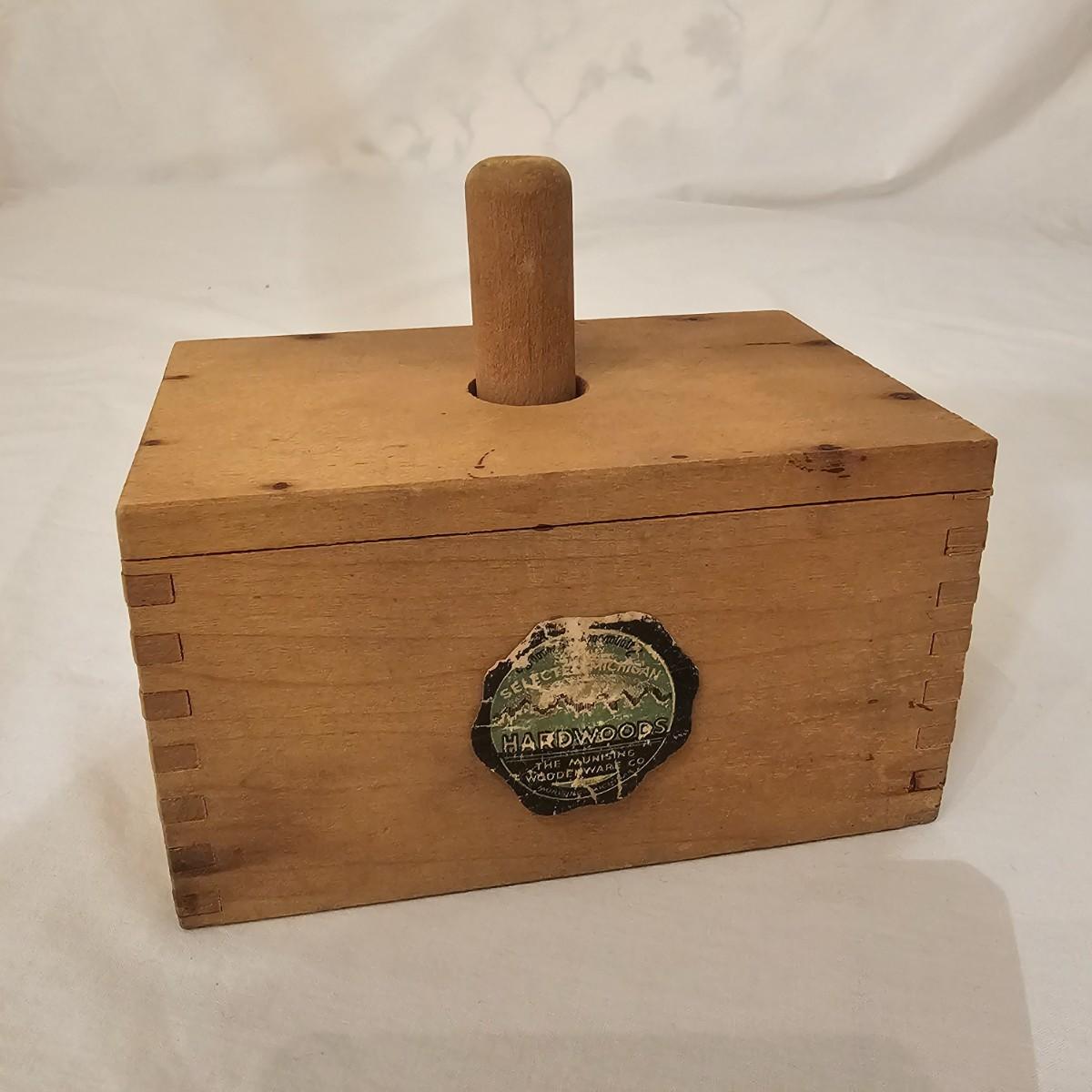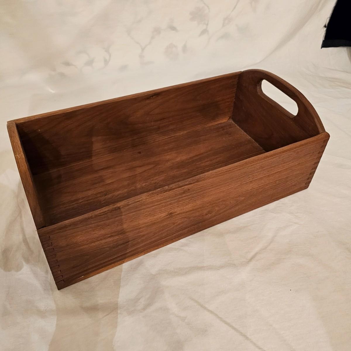 Two solid wood handled boxes/trays with dovetail corners. Larger piece is 9.5" x 17" x 6"H, smaller is 8.5" x 12" x 6"H. Also includes one hardwood butter mold with dovetail corners, 3.5" x 5.5" x 4"H. See photos for details. Shipping available.