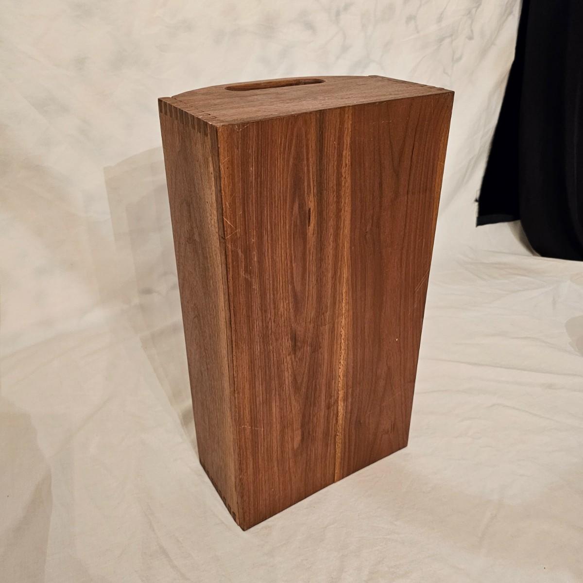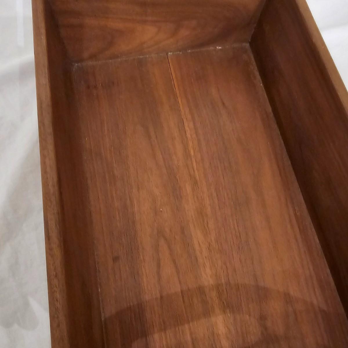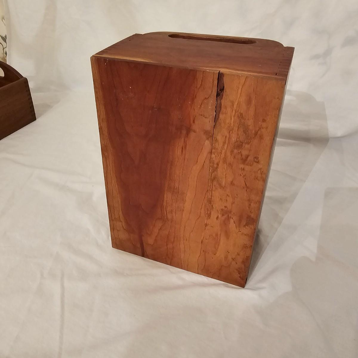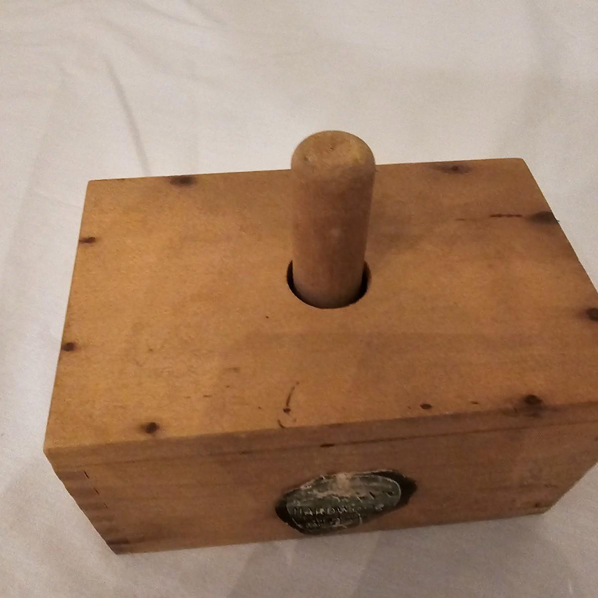 Two solid wood handled boxes/trays with dovetail corners. Larger piece is 9.5" x 17" x 6"H, smaller is 8.5" x 12" x 6"H. Also includes one hardwood butter mold with dovetail corners, 3.5" x 5.5" x 4"H. See photos for details. Shipping available.