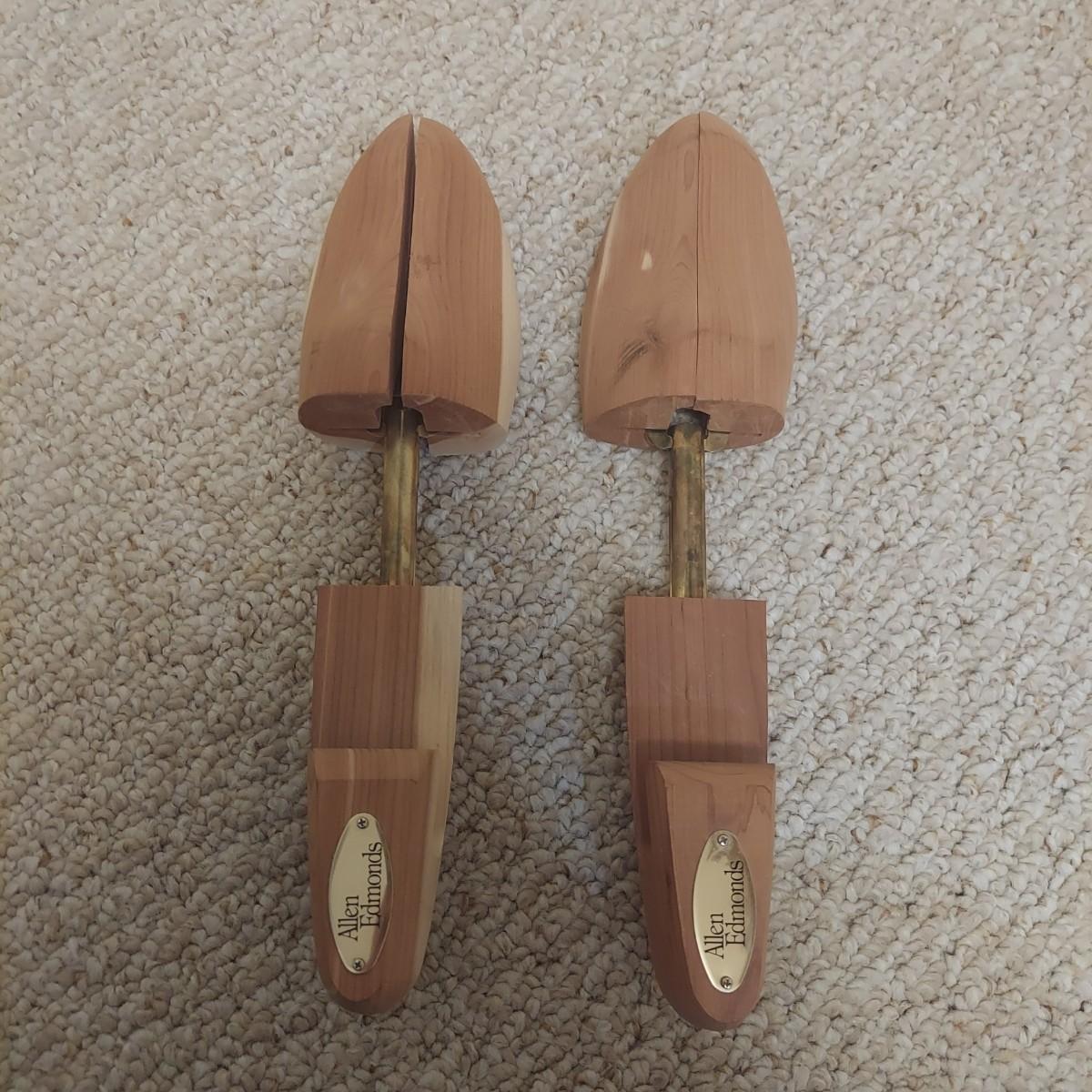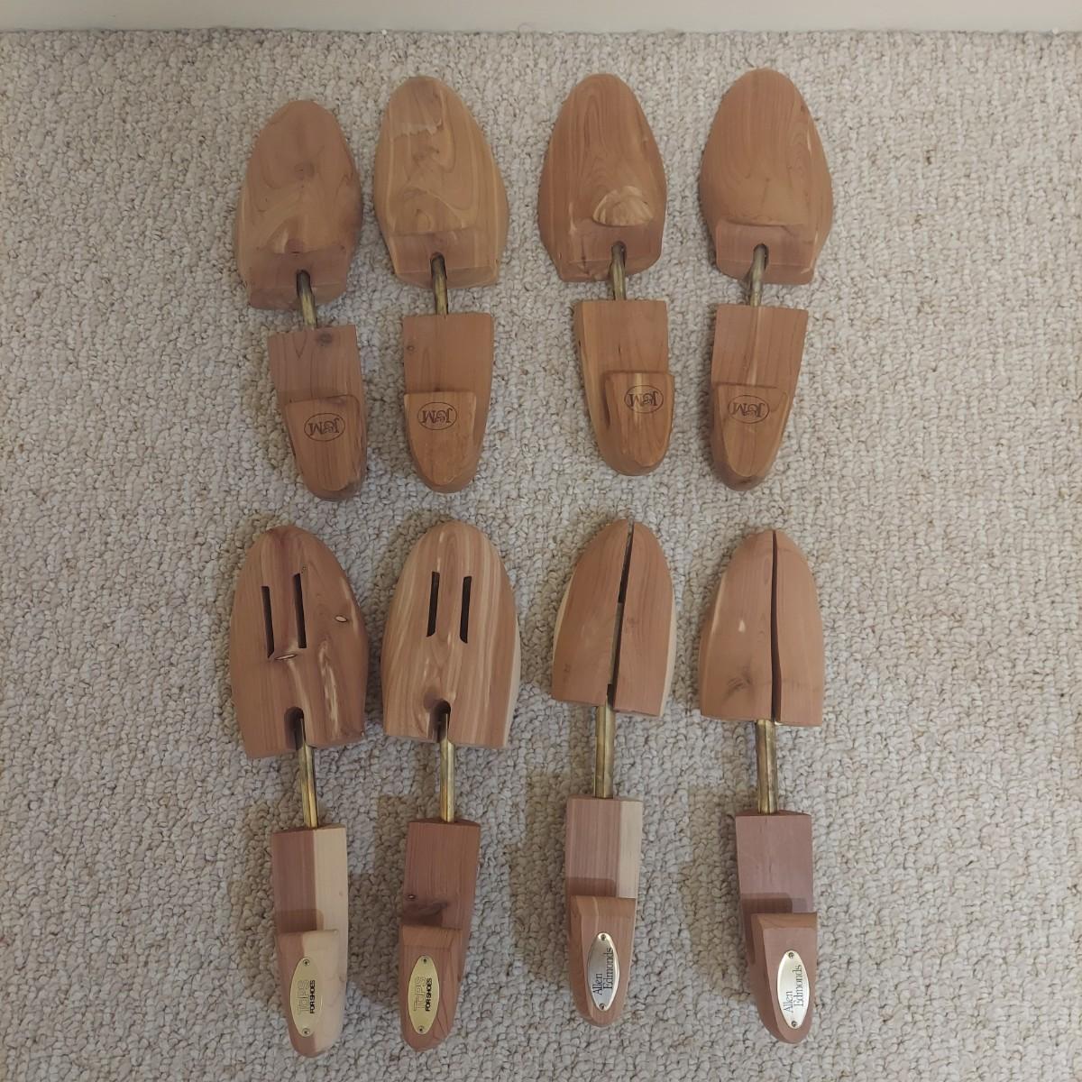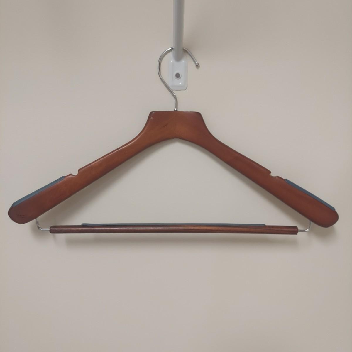 Lot contains several wooden hangers for tops and bottoms, plus four pairs of wooden shoe stretchers and a garment bag. The top hangers do not appear to have hotels, etc printed on them. Please see photos for details. Shipping available