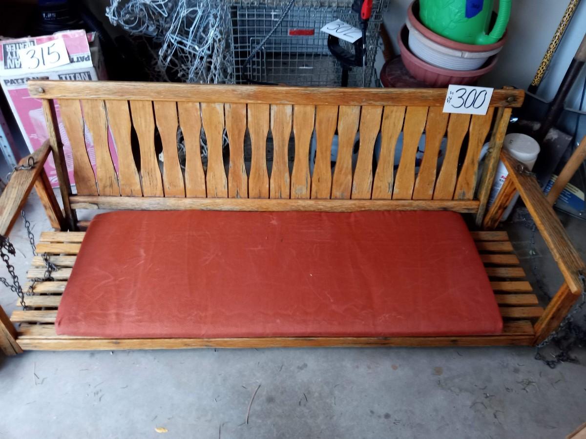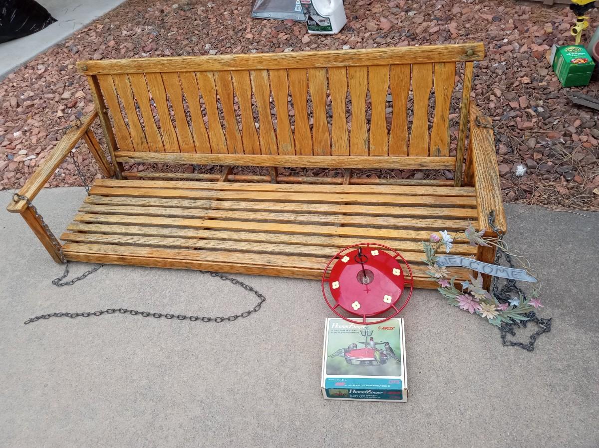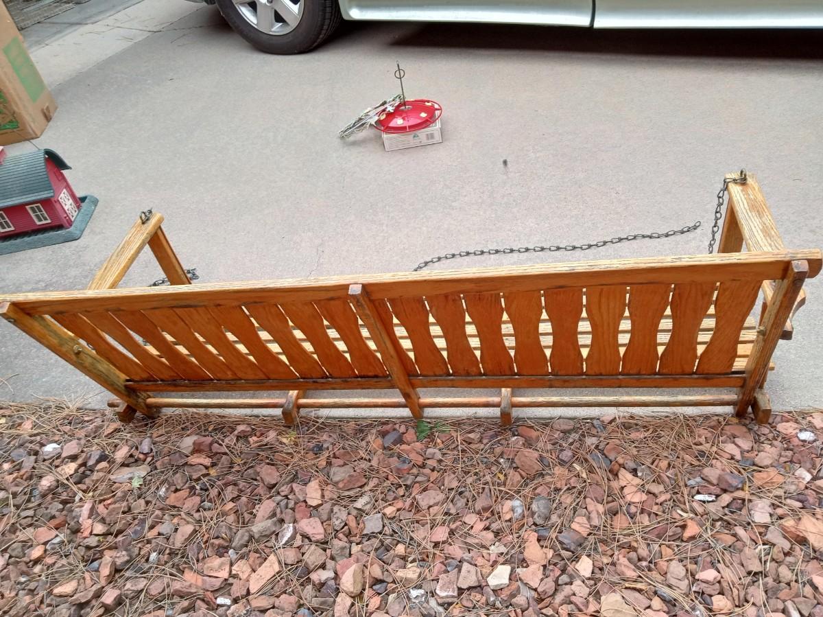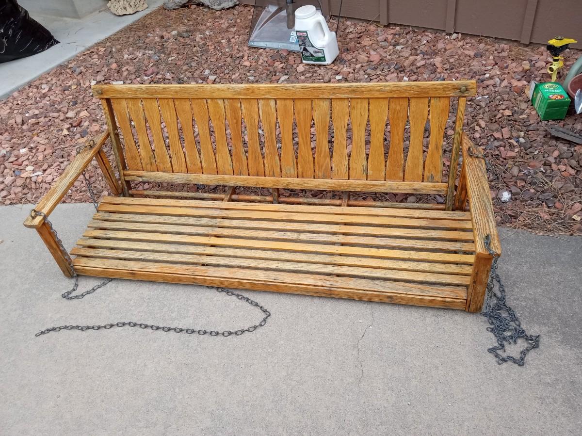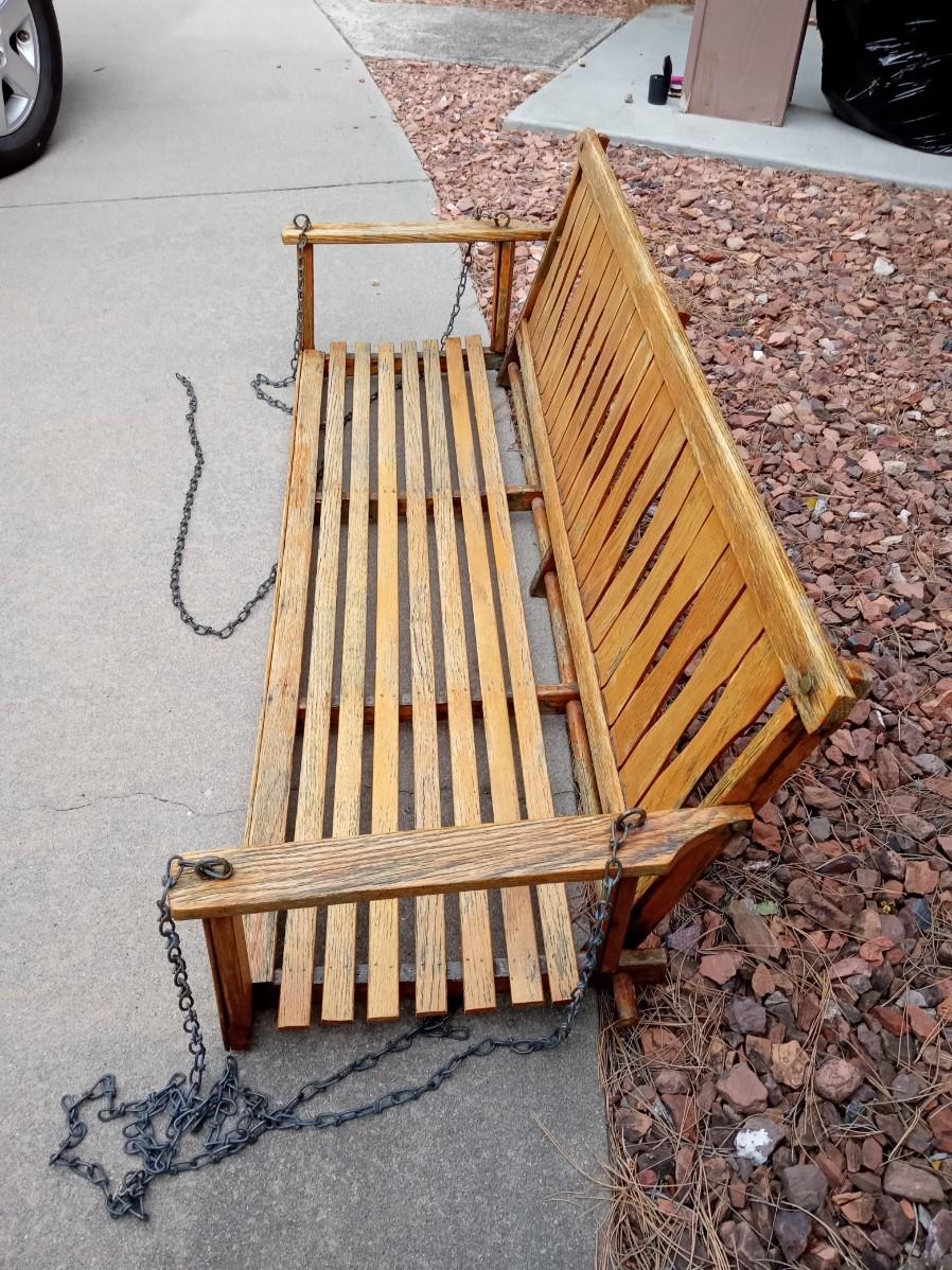 THE SWING IS 56.5" LONG, IT IS STRUCTURALLY GOOD BUT NEEDS TO HAVE A FRESH COAT OF POLY
