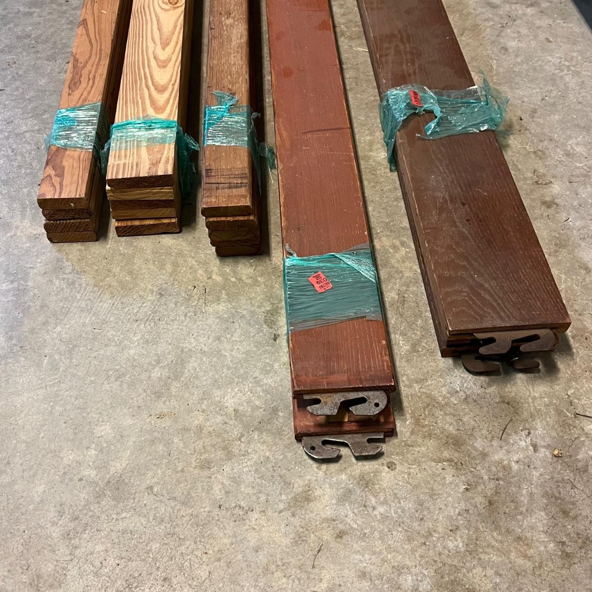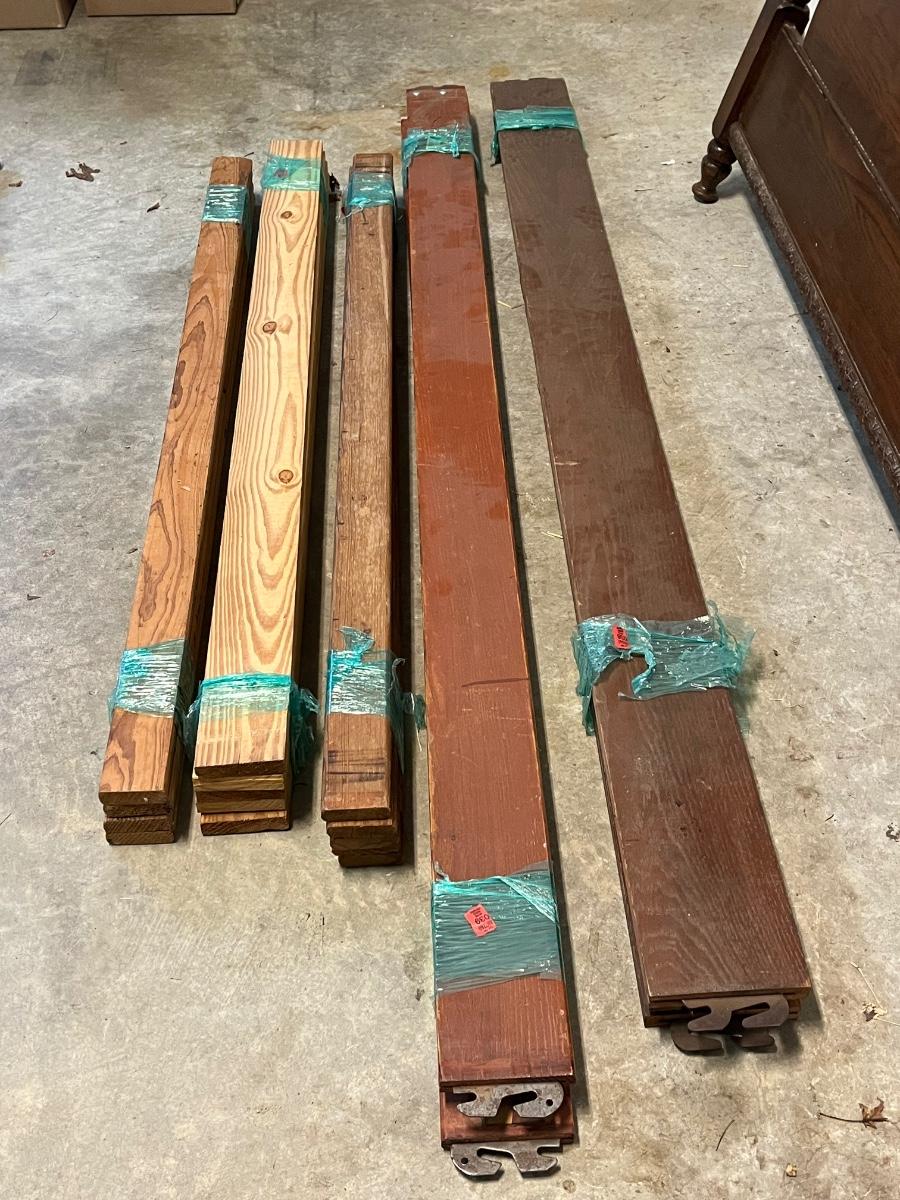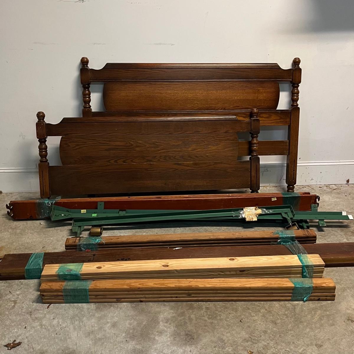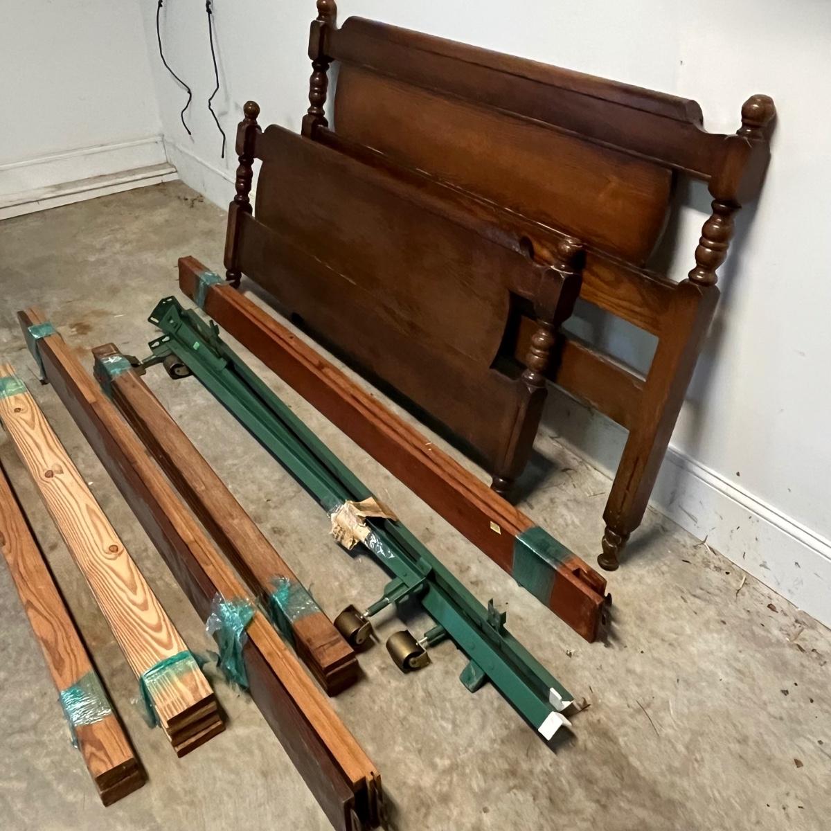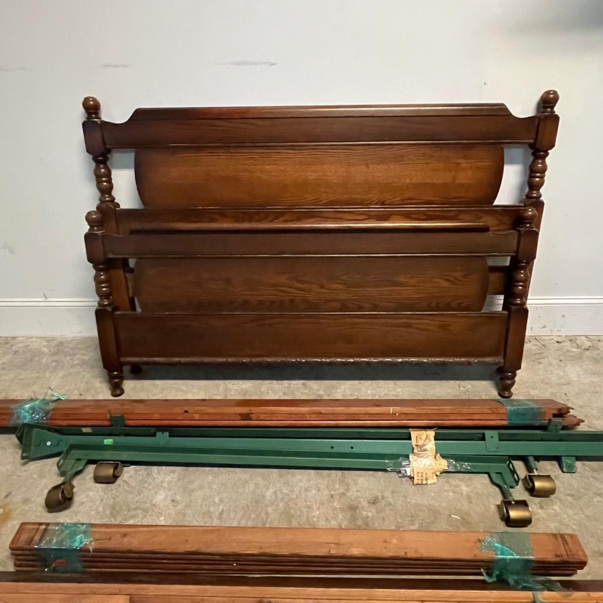 This includes the headboard, footboard and five sets of various slats, as well as a wheeled, foldable metal mattress frame. Based on the slat openings the bed appears to be a full size.