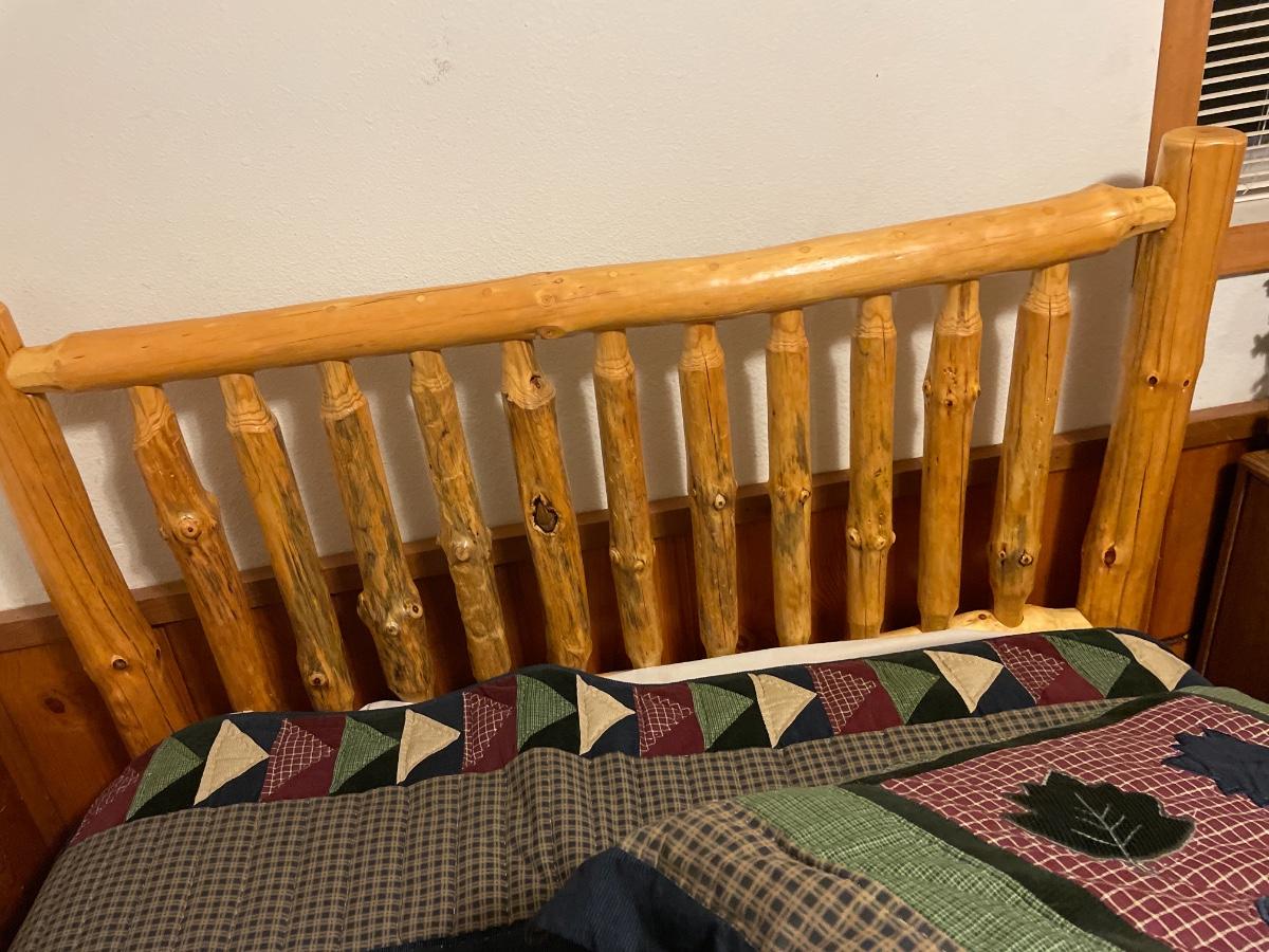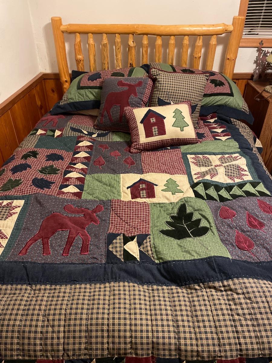 Wood headboard, full size mattress and box spring and Bedding set all INCLUDED