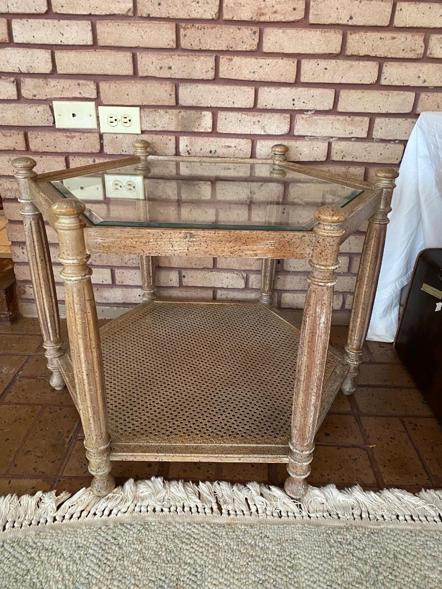 Wooden hexagonal table with beveled glass top and cane shelf. Exc condition. Approx 23”h x 32”w