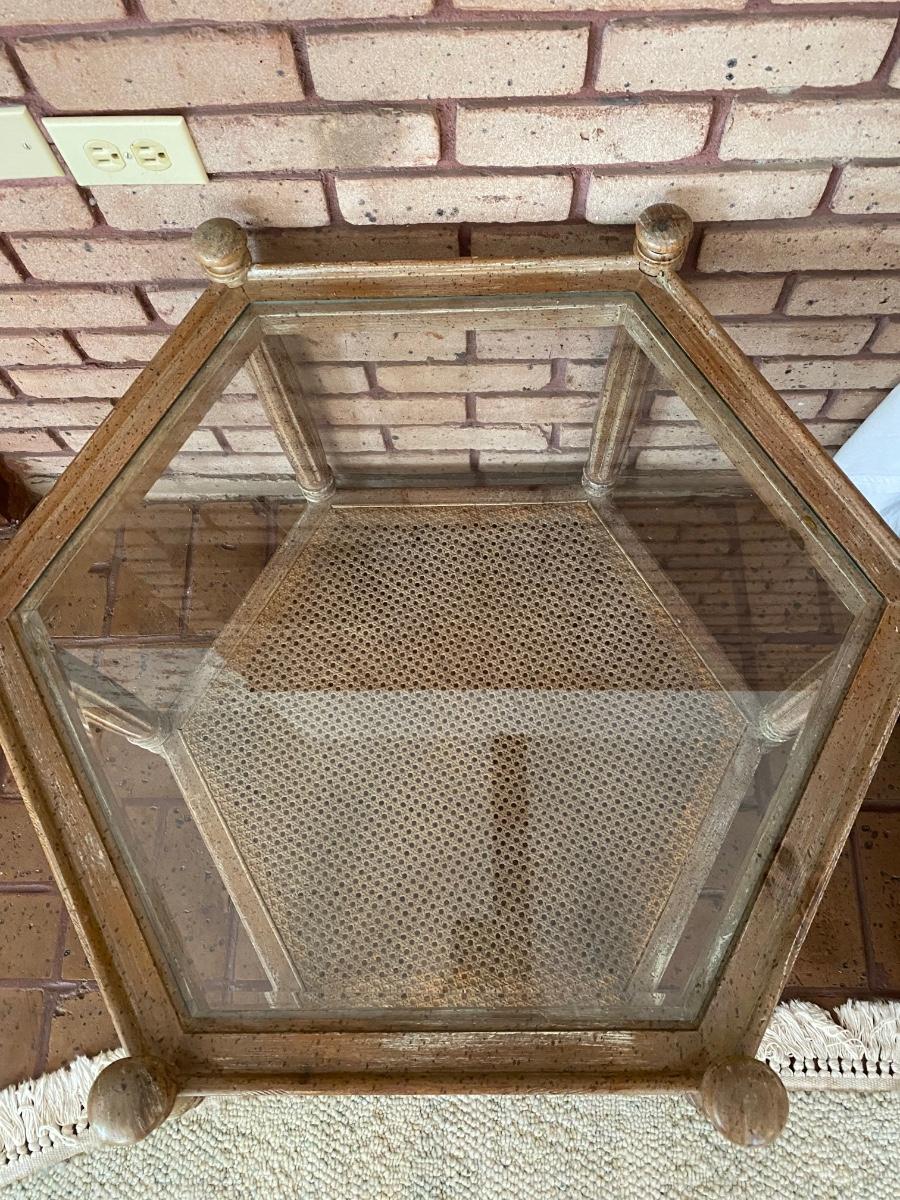 Wooden hexagonal table with glass top and cane shelf