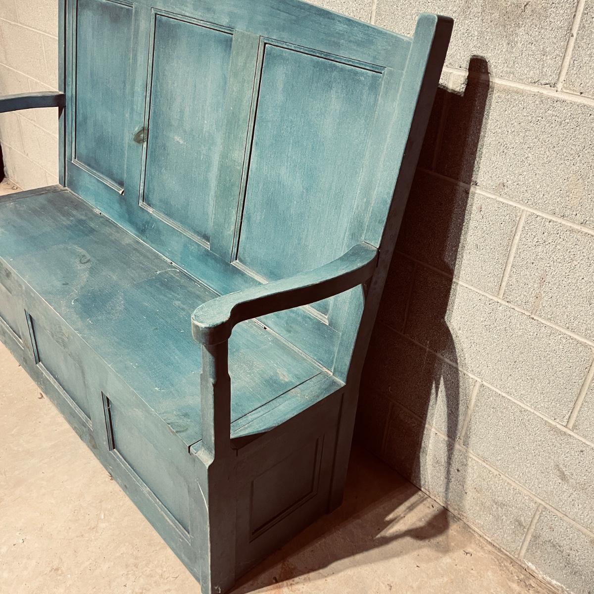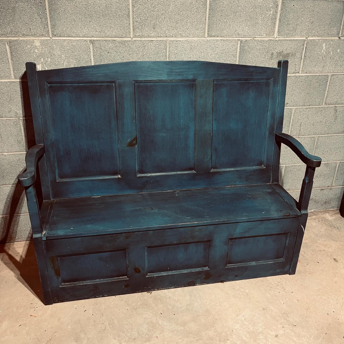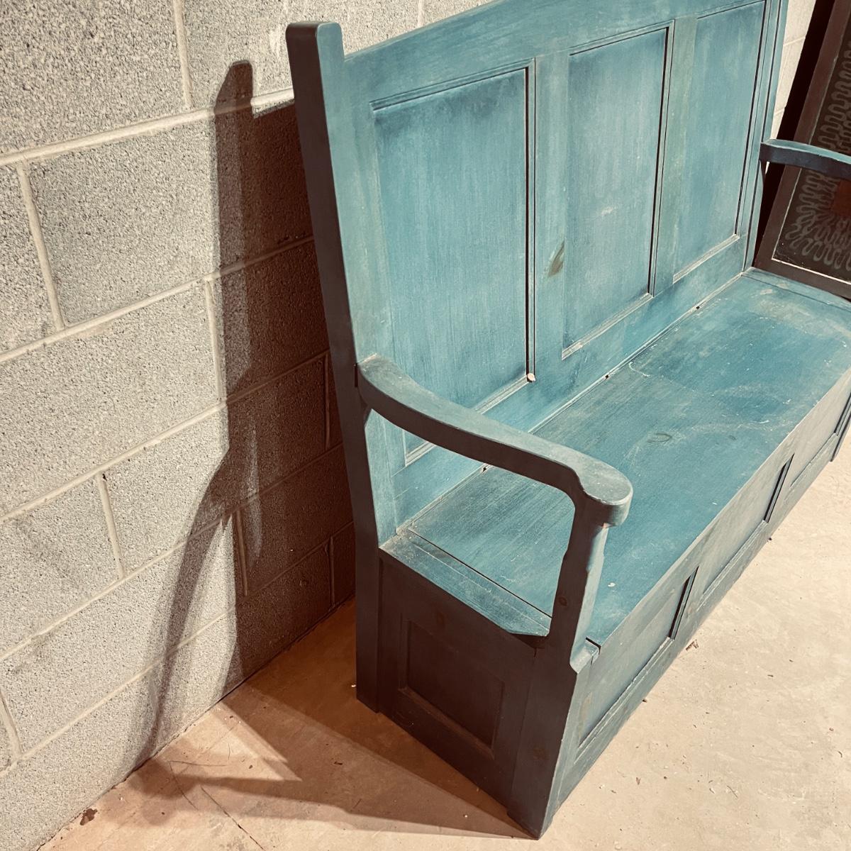 This wooden high back bench has storage underneath the seat. Bench measures 55” x 20" x 44”H with a 16” seat height. The first two pictures are the true color of the item. Item has scratches and nicks, see pictures.