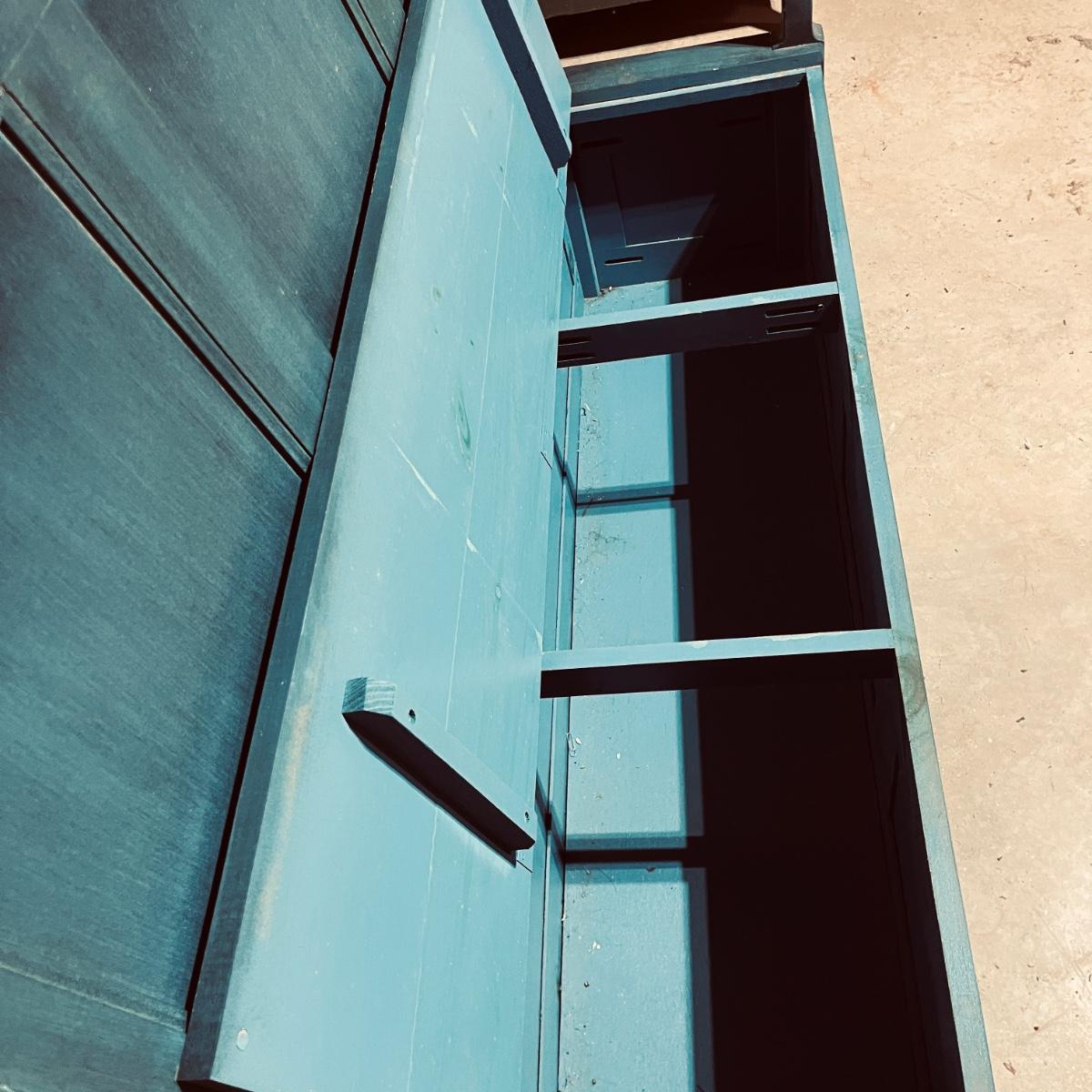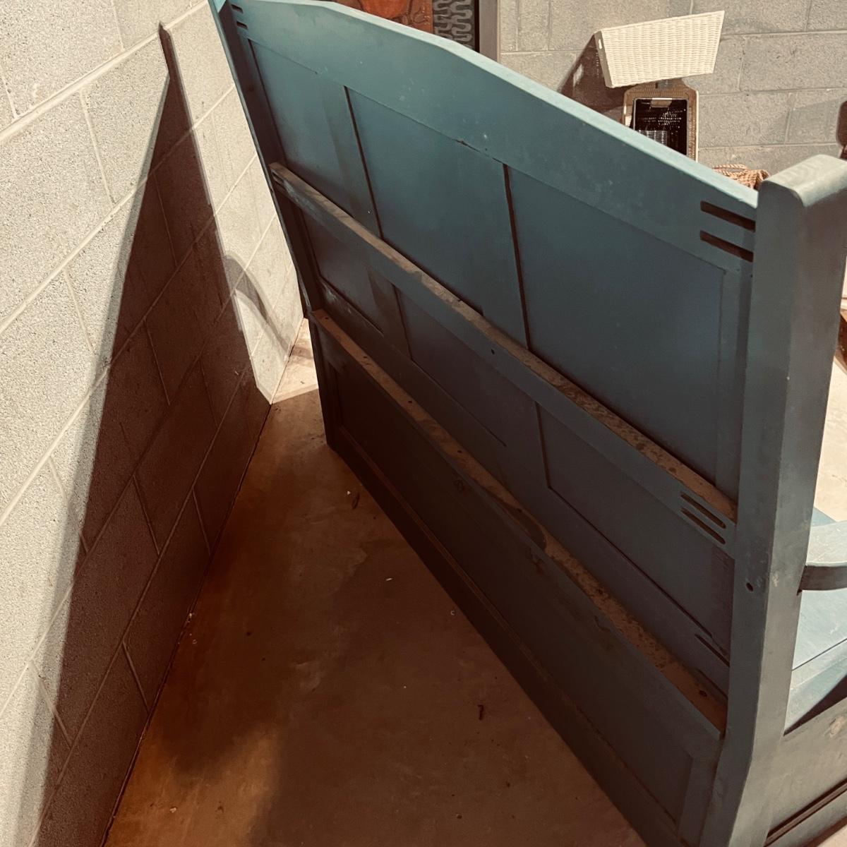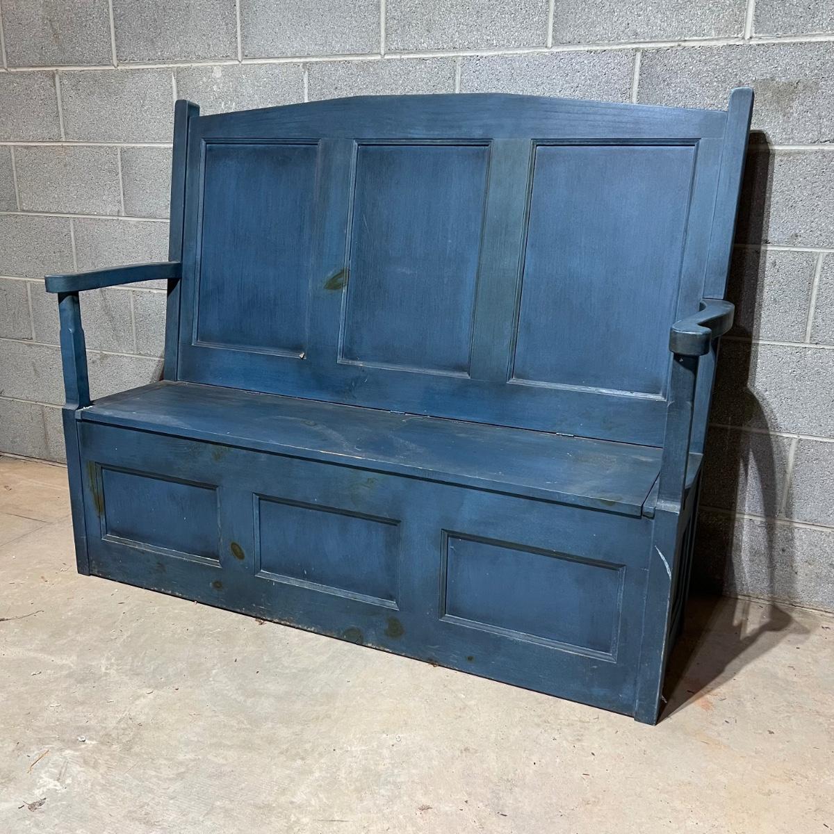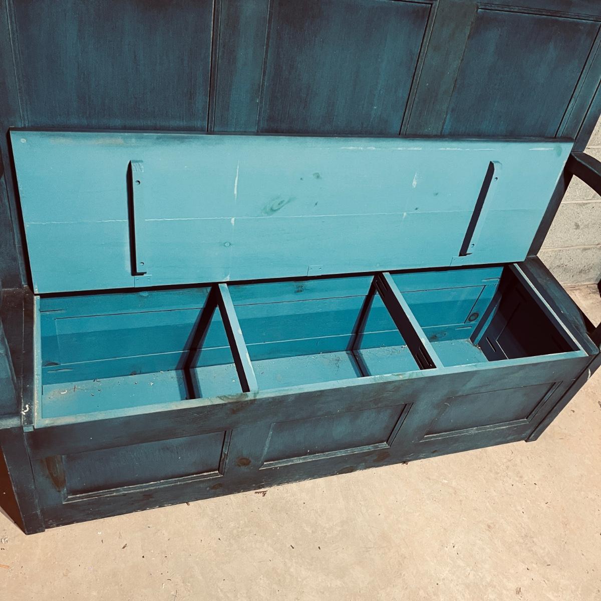This wooden high back bench has storage underneath the seat. Bench measures 55” x 20" x 44”H with a 16” seat height. The first two pictures are the true color of the item. Item has scratches and nicks, see pictures.