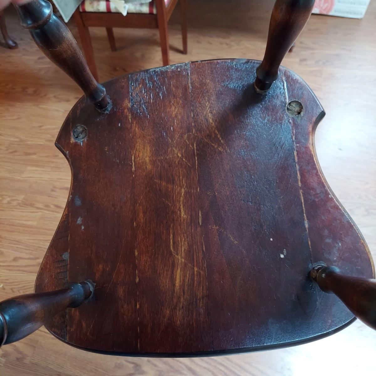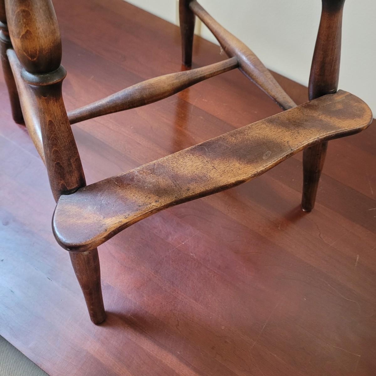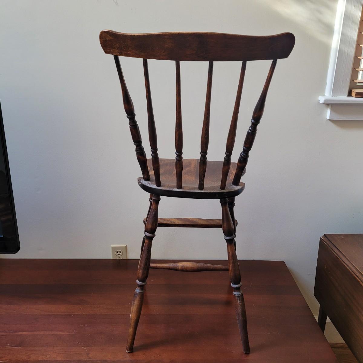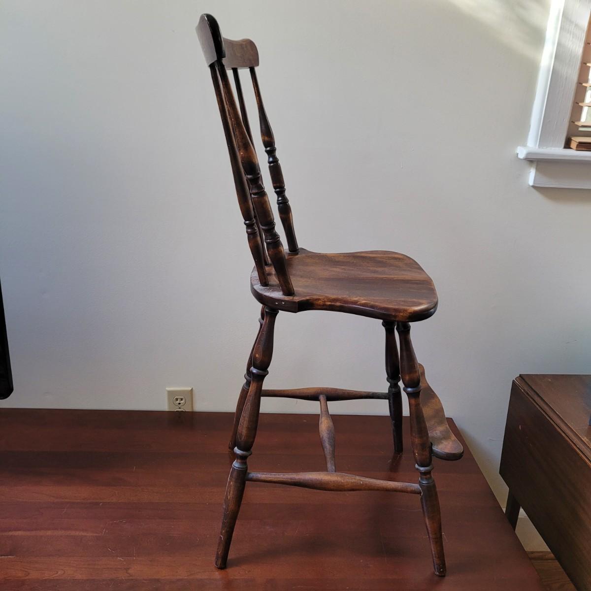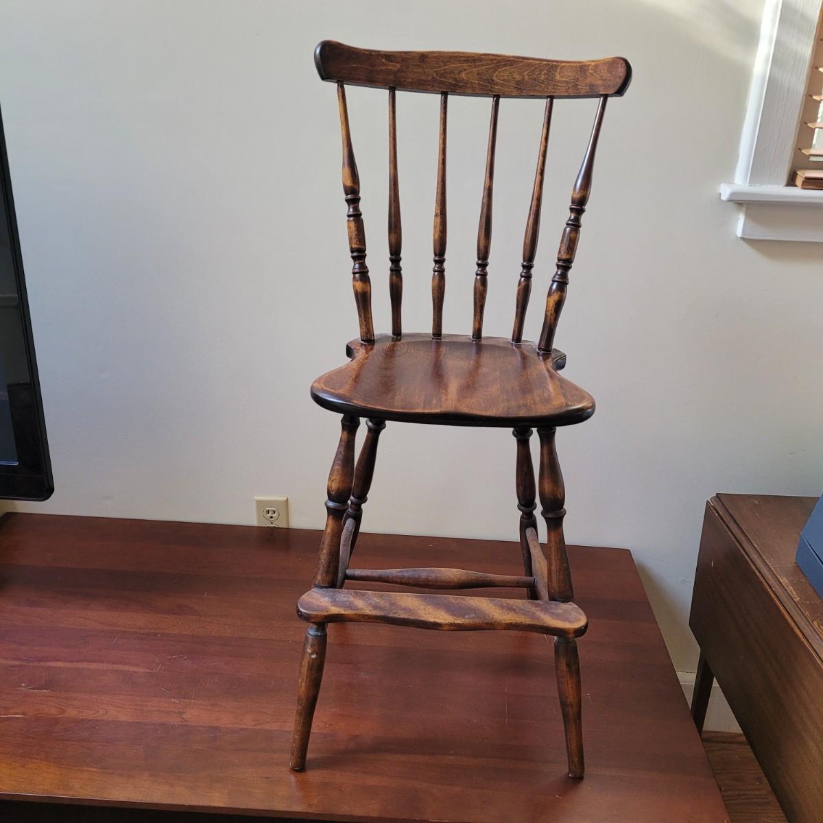This vintage wooden high chair measures approximately 18" x 17.5" x 38"H, with a seat height of 21." Local pickup only.