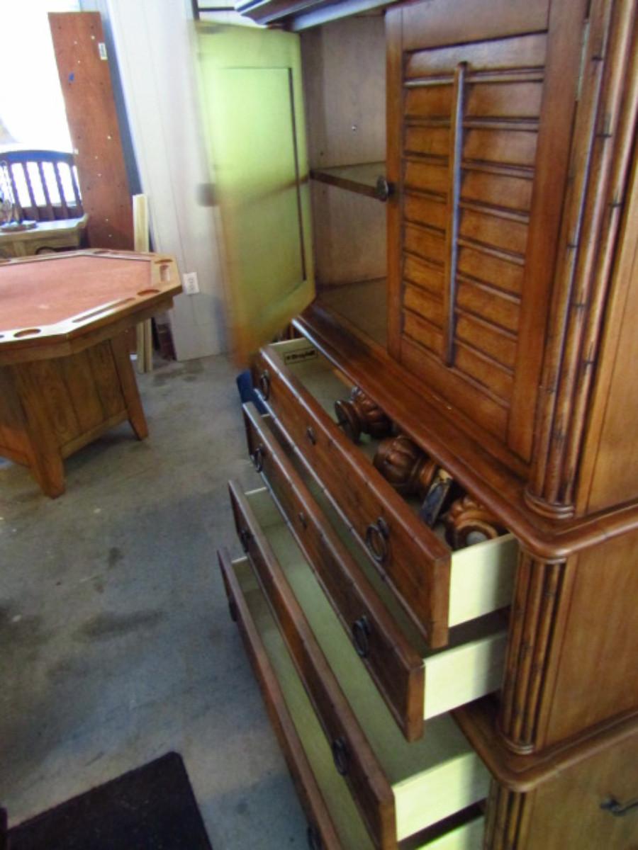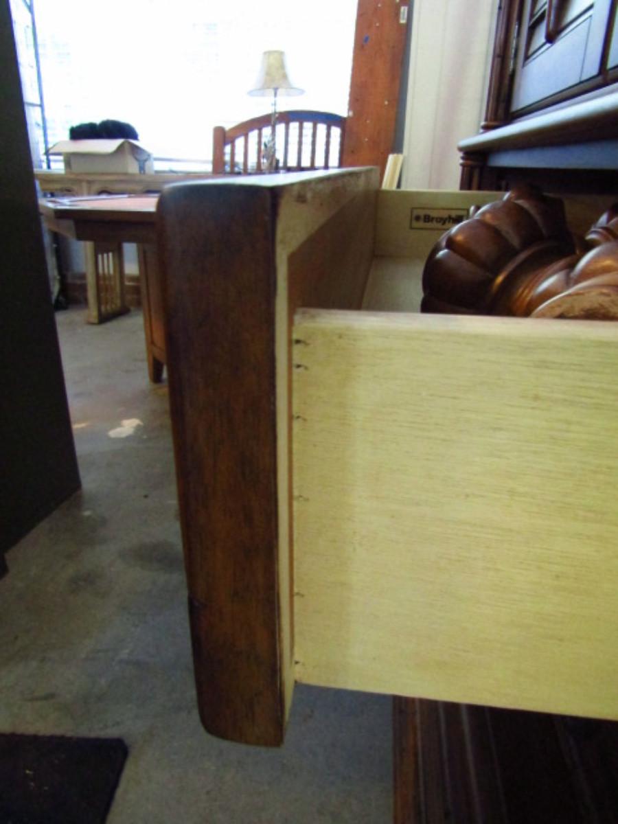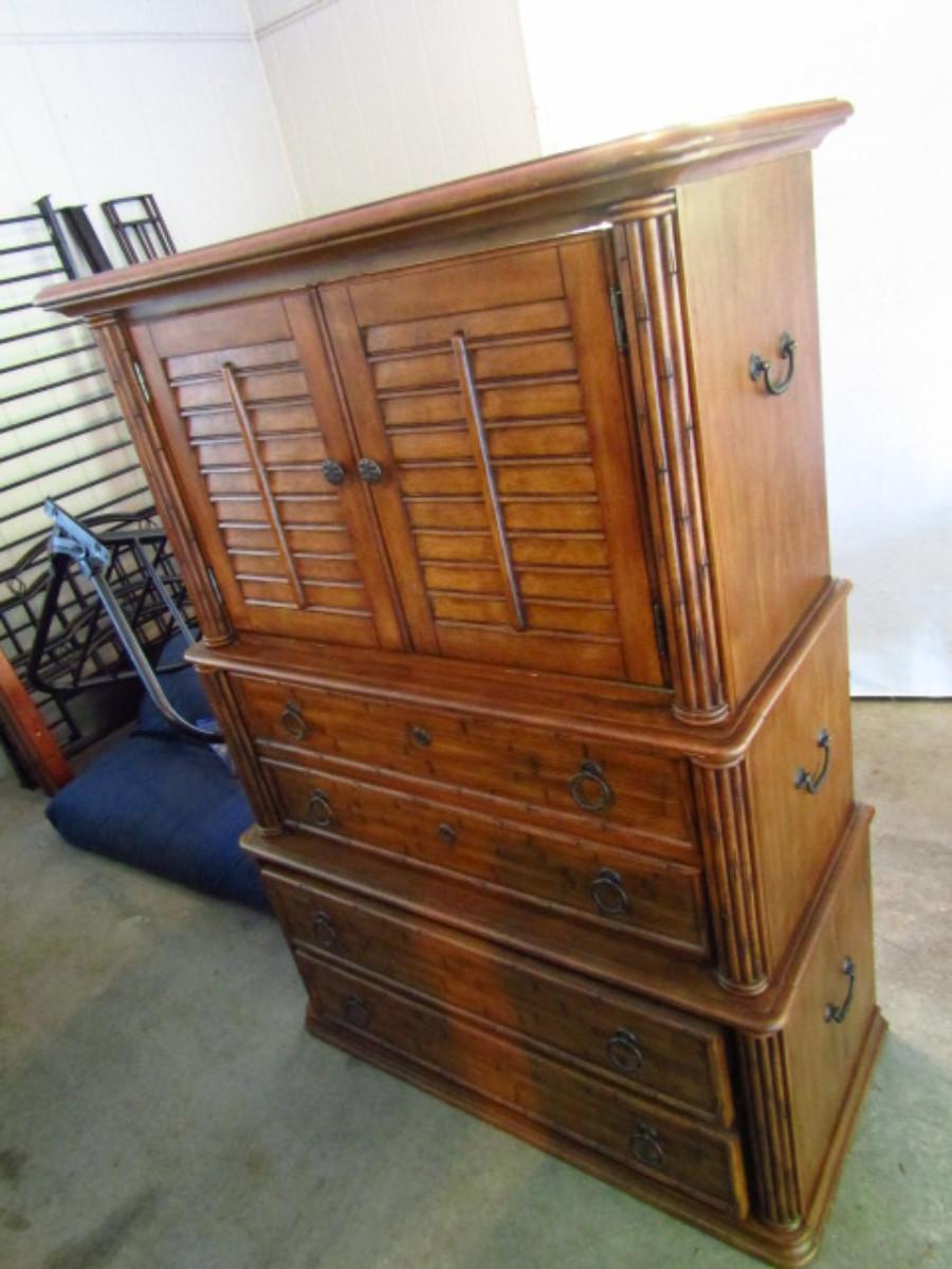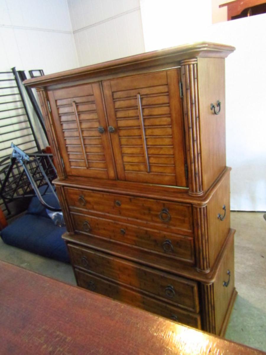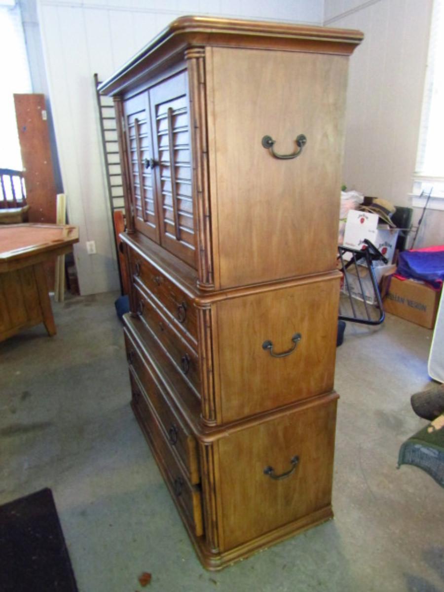 Wooden Highboy Dresser by Broyhill- Needs Repair. Please see all pictures- legs are present, but need reattaching. Top cabinet portion has no backing.