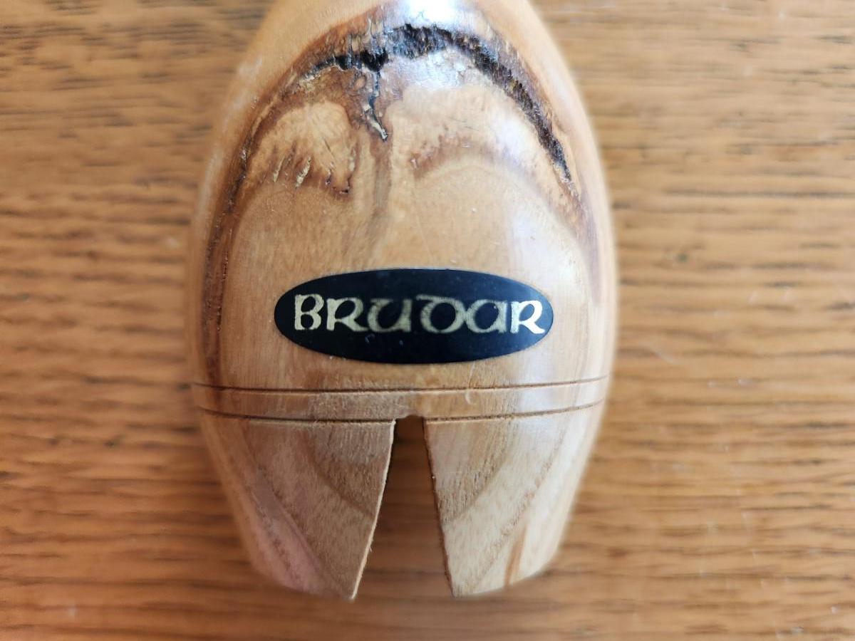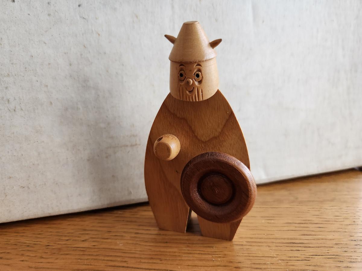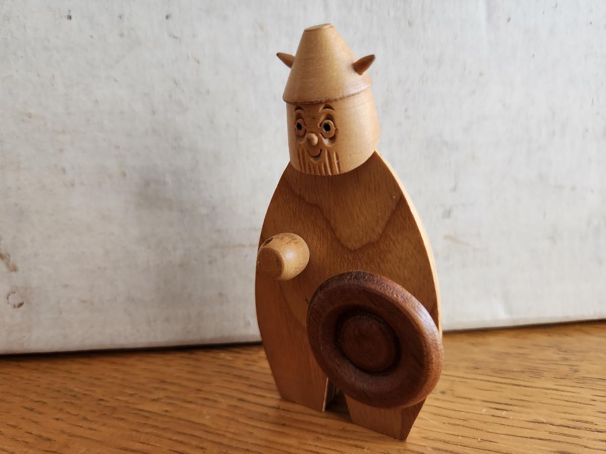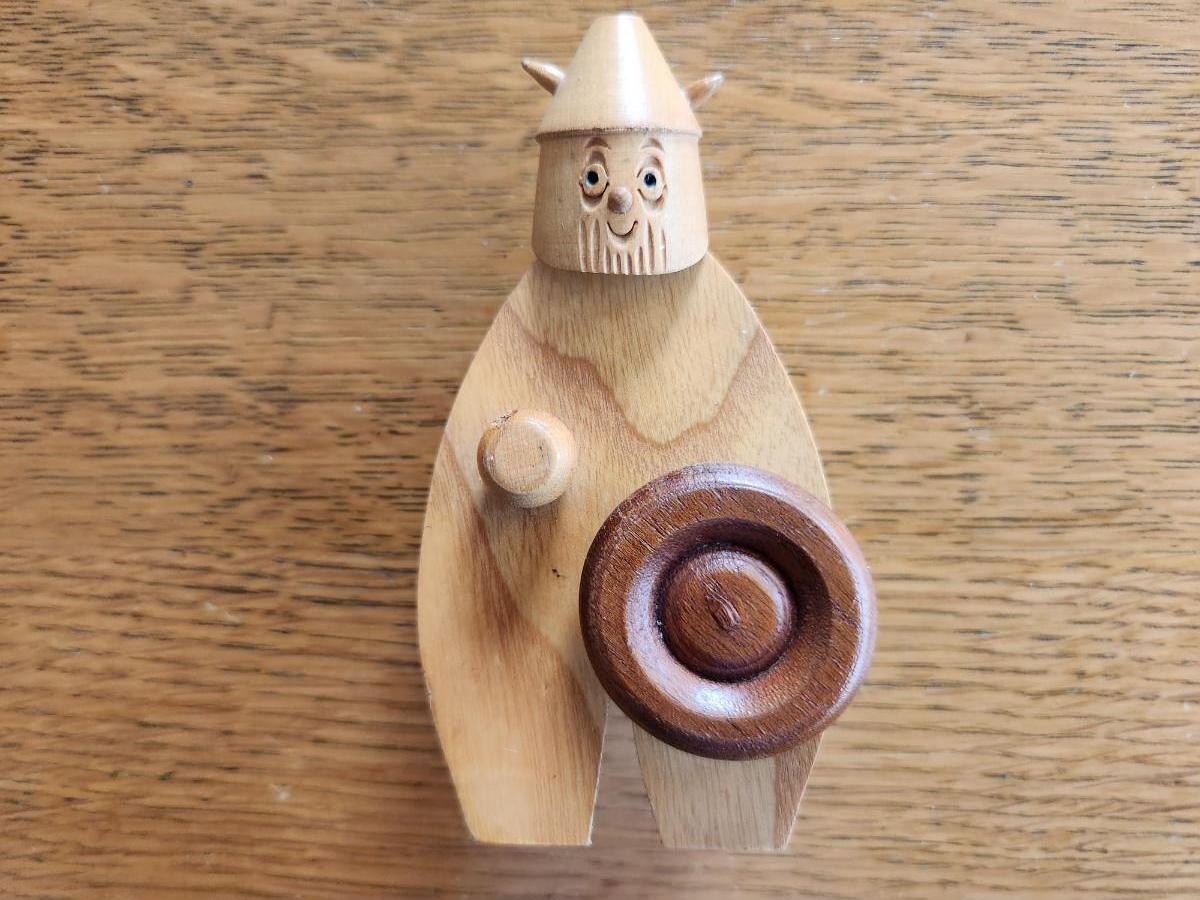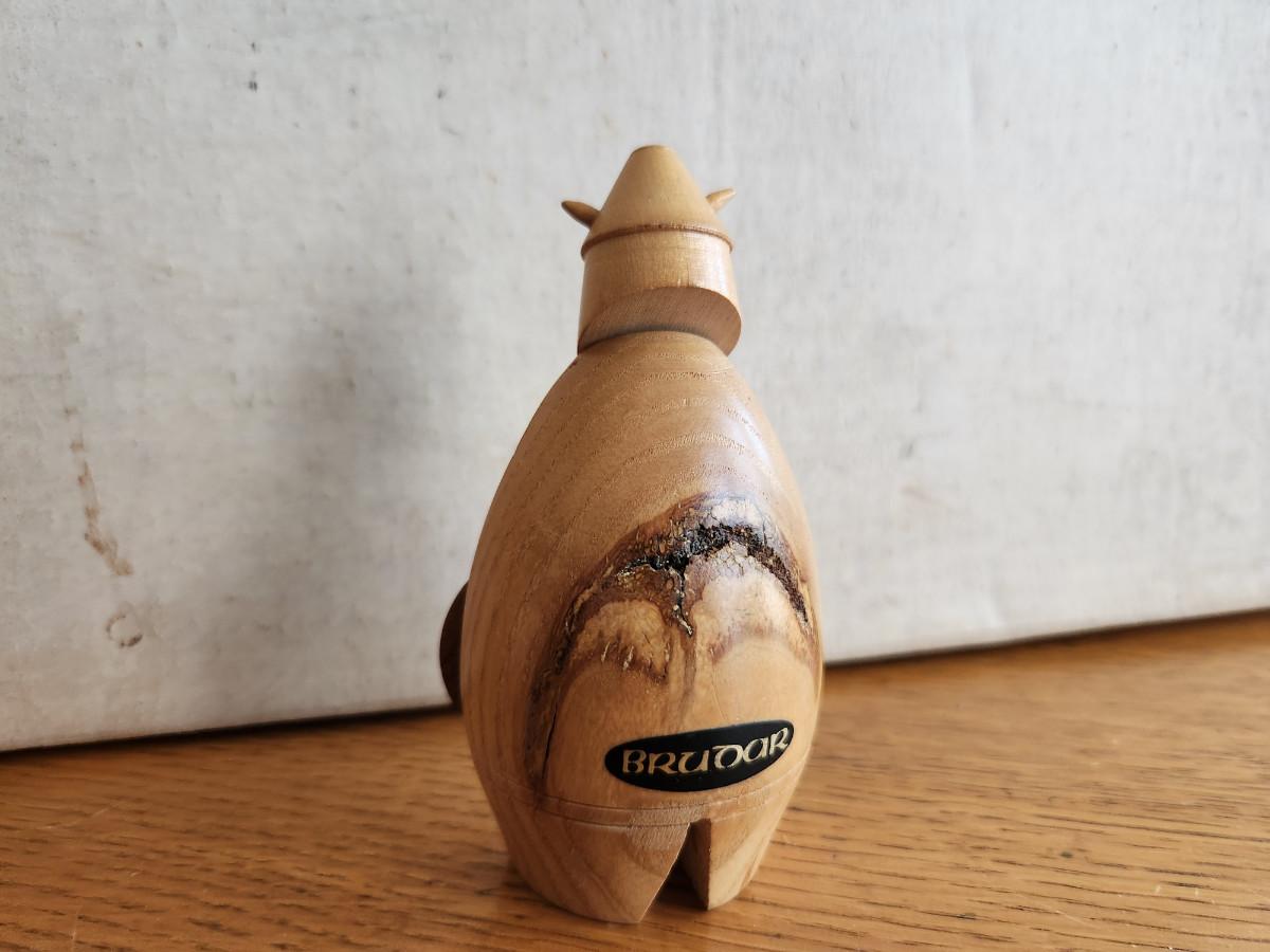 This auction lot is for a nifty Wooden Irish Warrior Statue. This unusual statue has an unusual branding across it's rear, but a clear mark on the feet that is was made in Ireland. Nice statue that stands about 5-inches tall. Made with various types of wood - very handsome. appears to missing the spear or other weapon that would be inserted into the protruding hand.