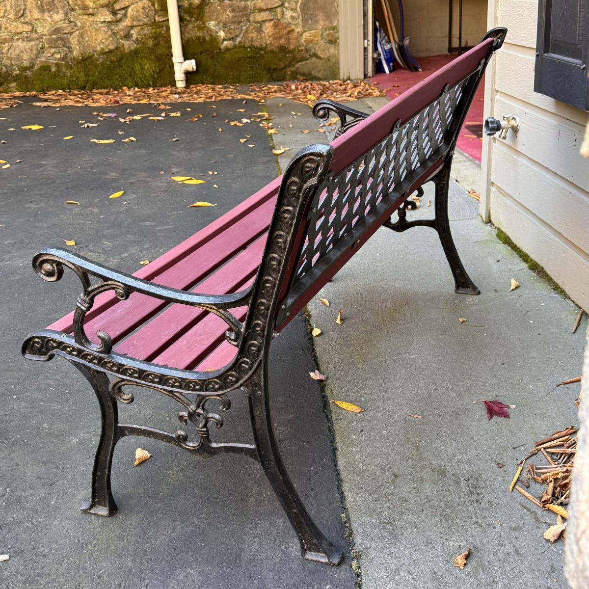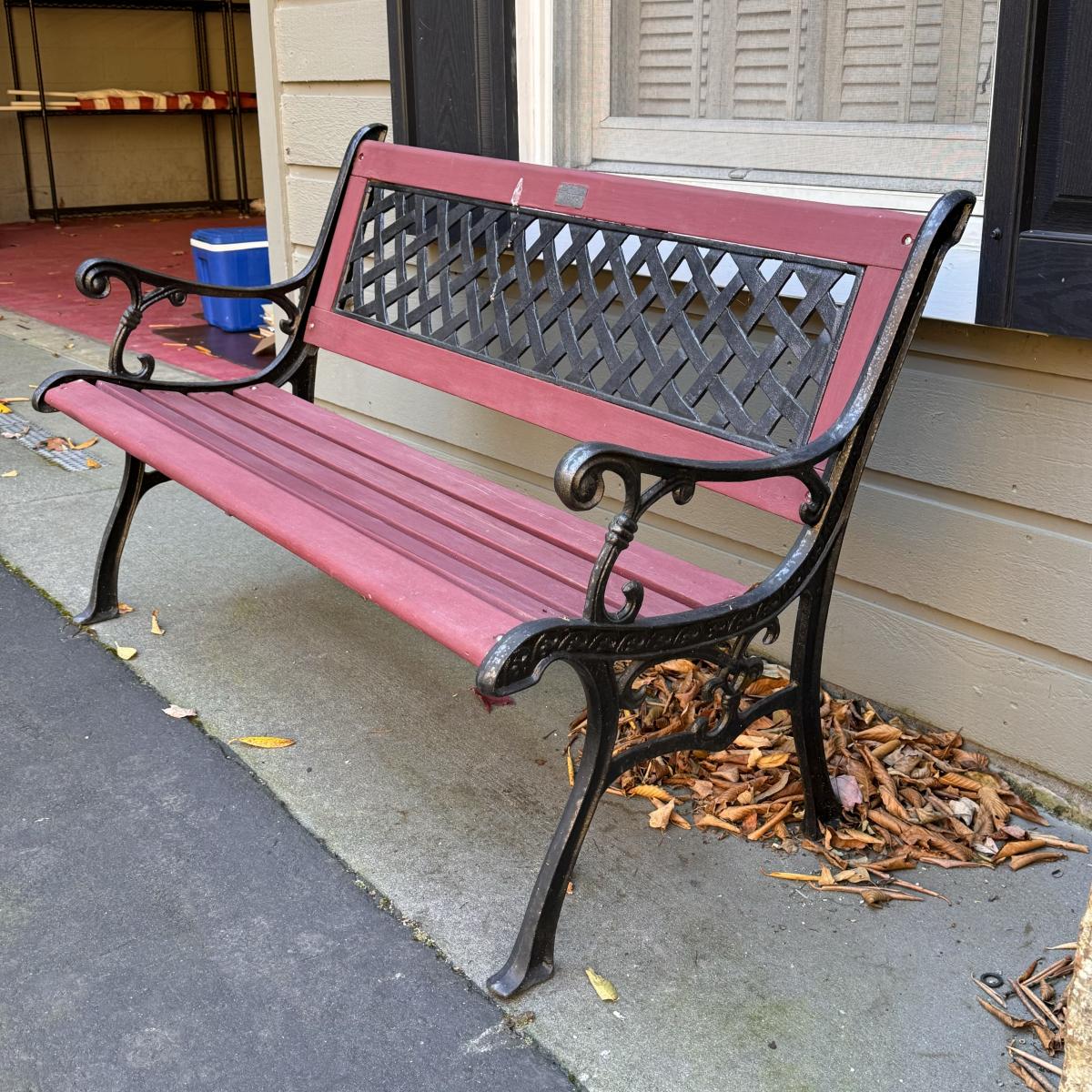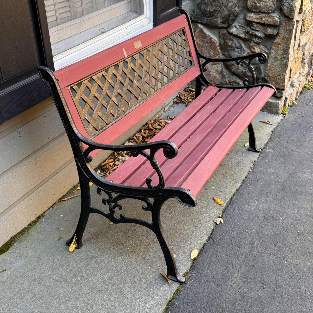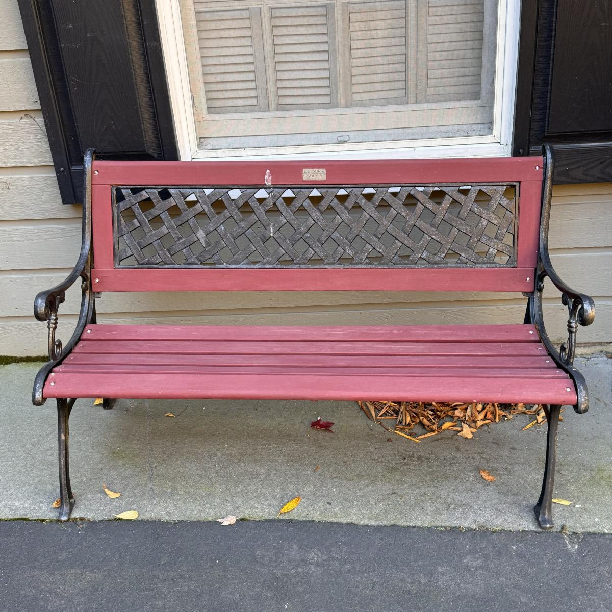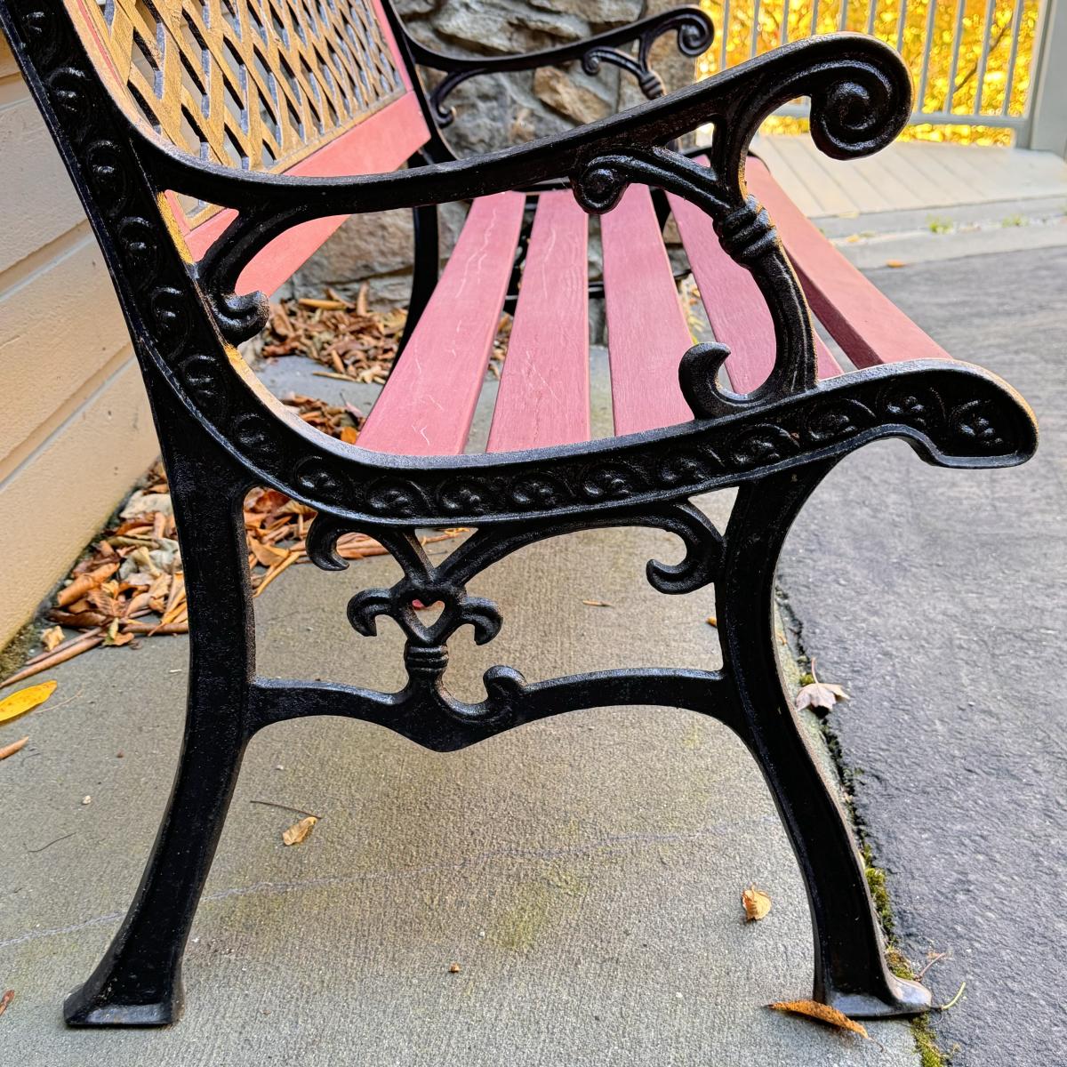 Lot includes a wooden slatted bench with iron sides. Bench measures 50” x 23” x 32”H with a 16.5” seat height. Winner will need to bring assistance due to weight of the item. Local Pickup Only.