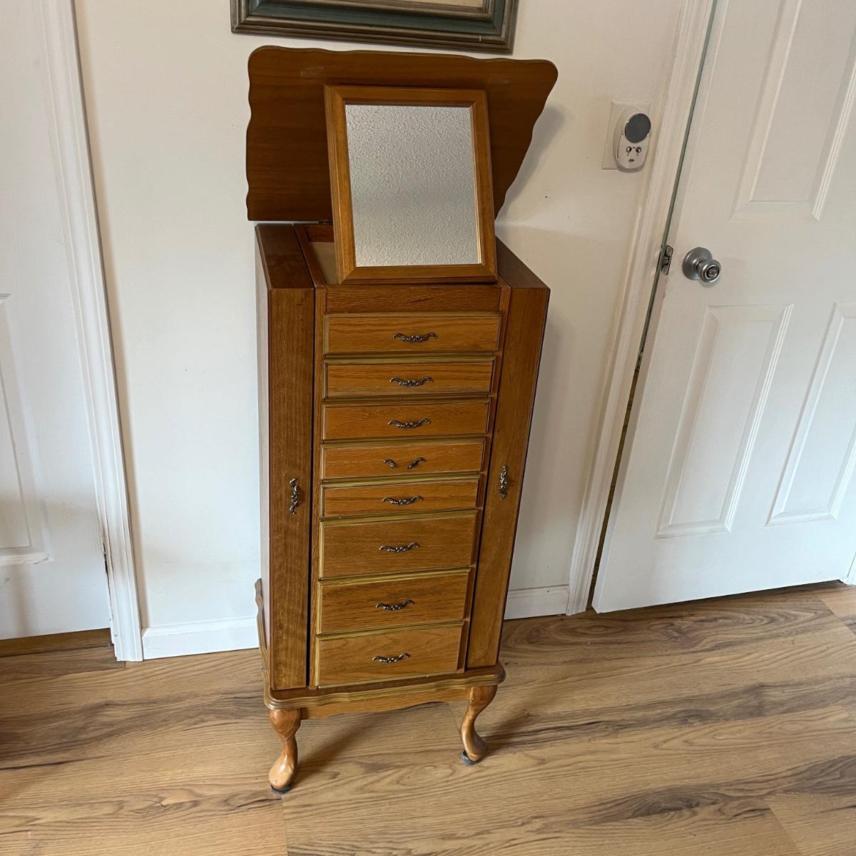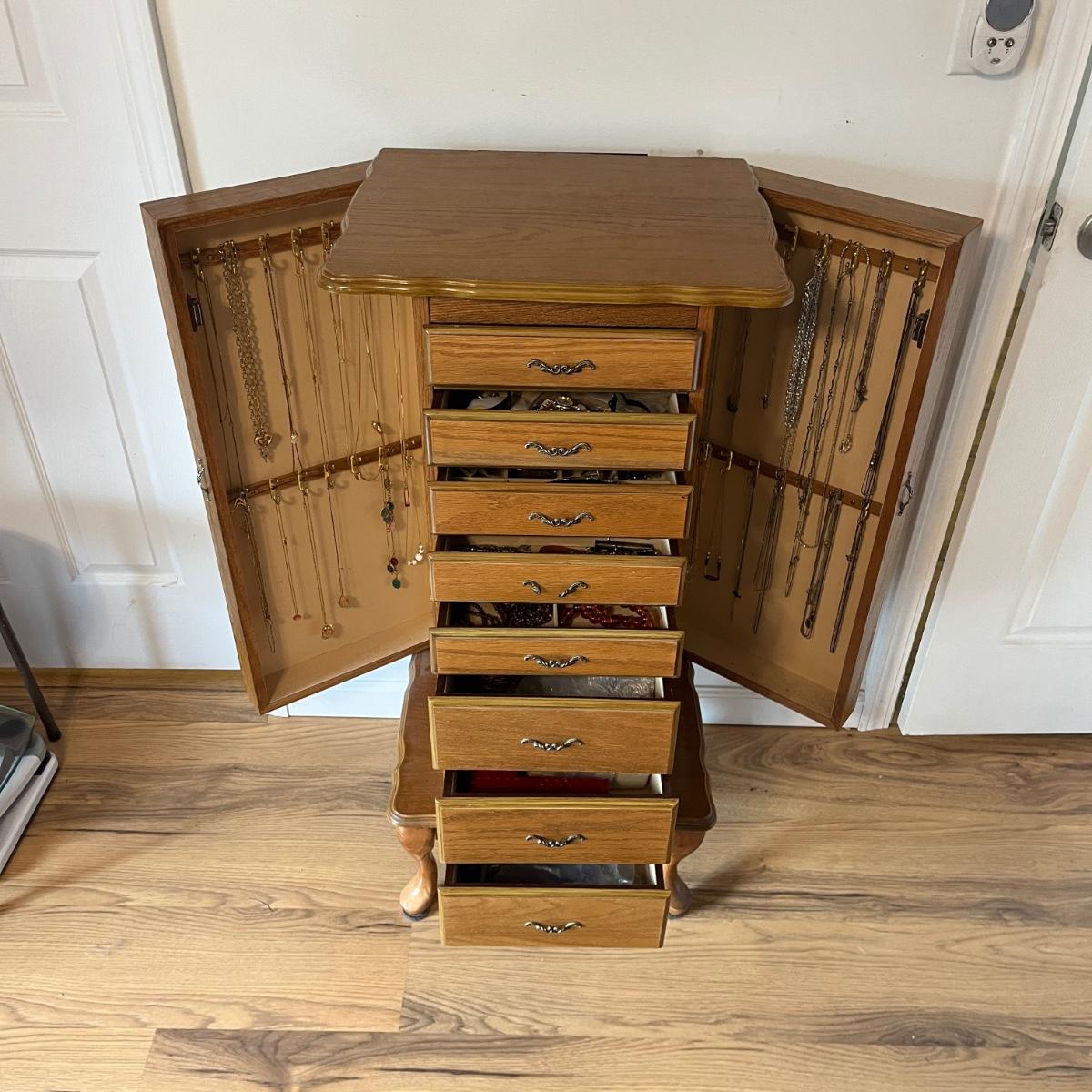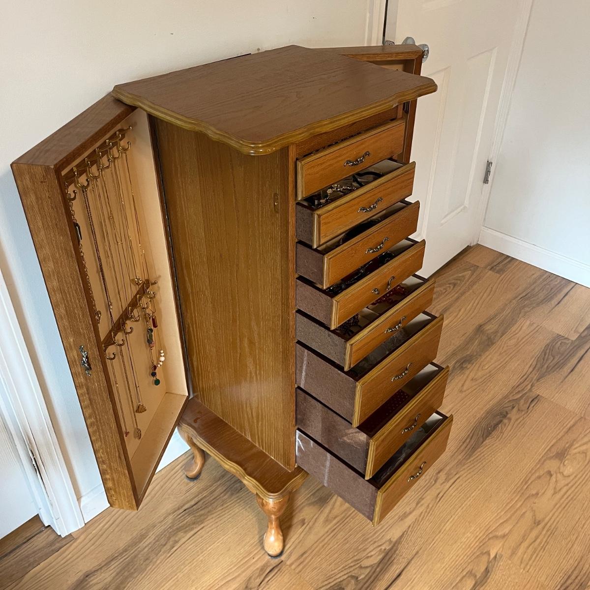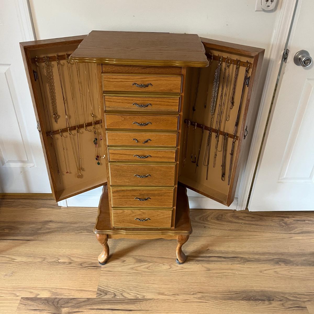 This wooden jewelry armoire has eight drawers and both sides swing open and the top opens to reveal a mirror and more storage. Armoire measures 18” 14.75” x 41”H. Top is loose and has a spot see photos. The top bracket could be better secured and needs one more screw.. Jewelry not Included but available in auction. One drawer has broken handle.