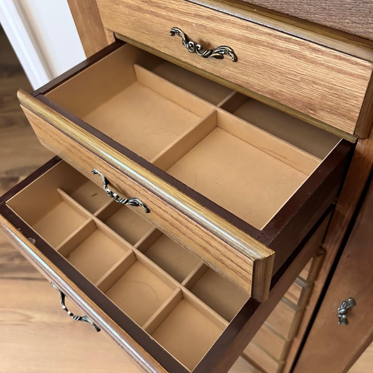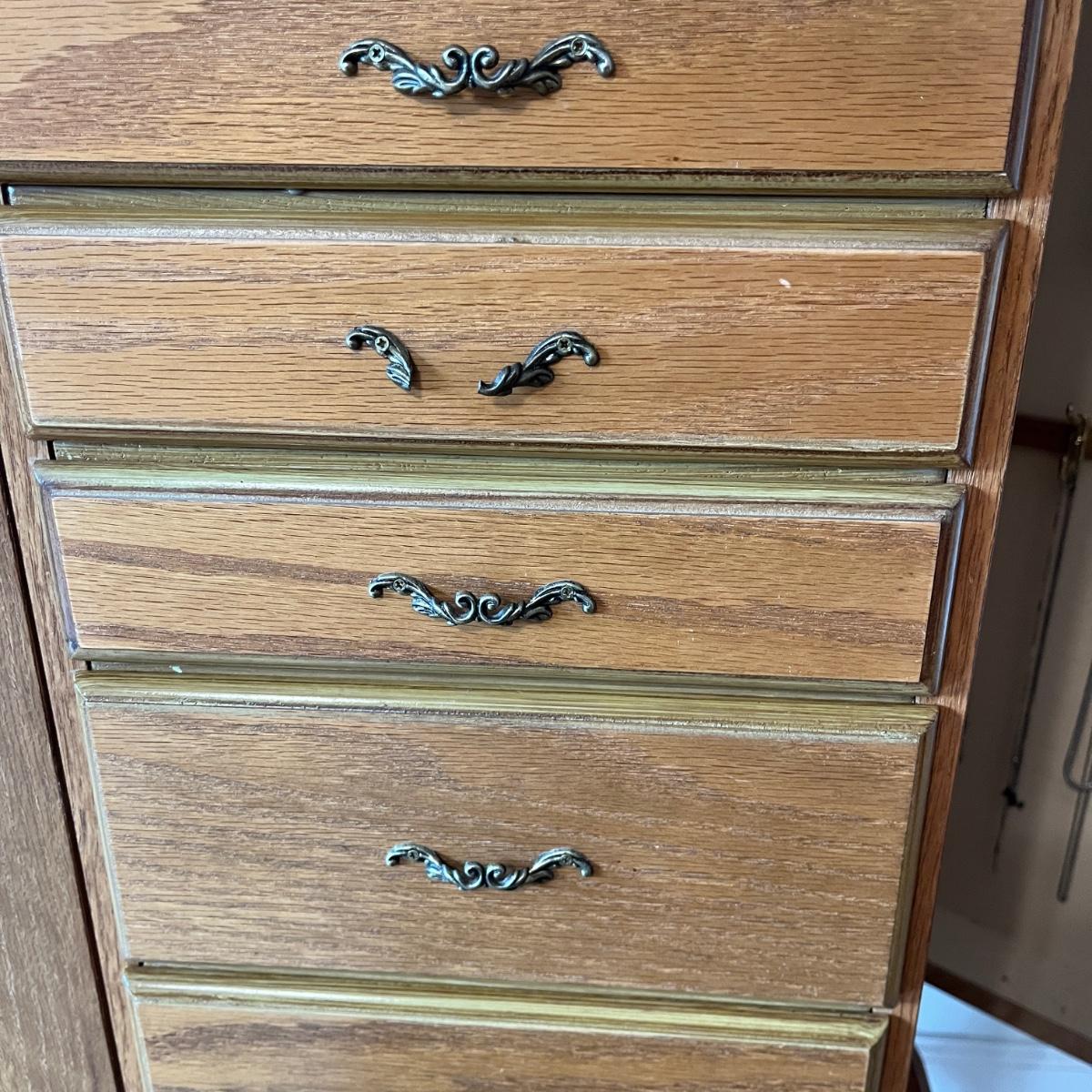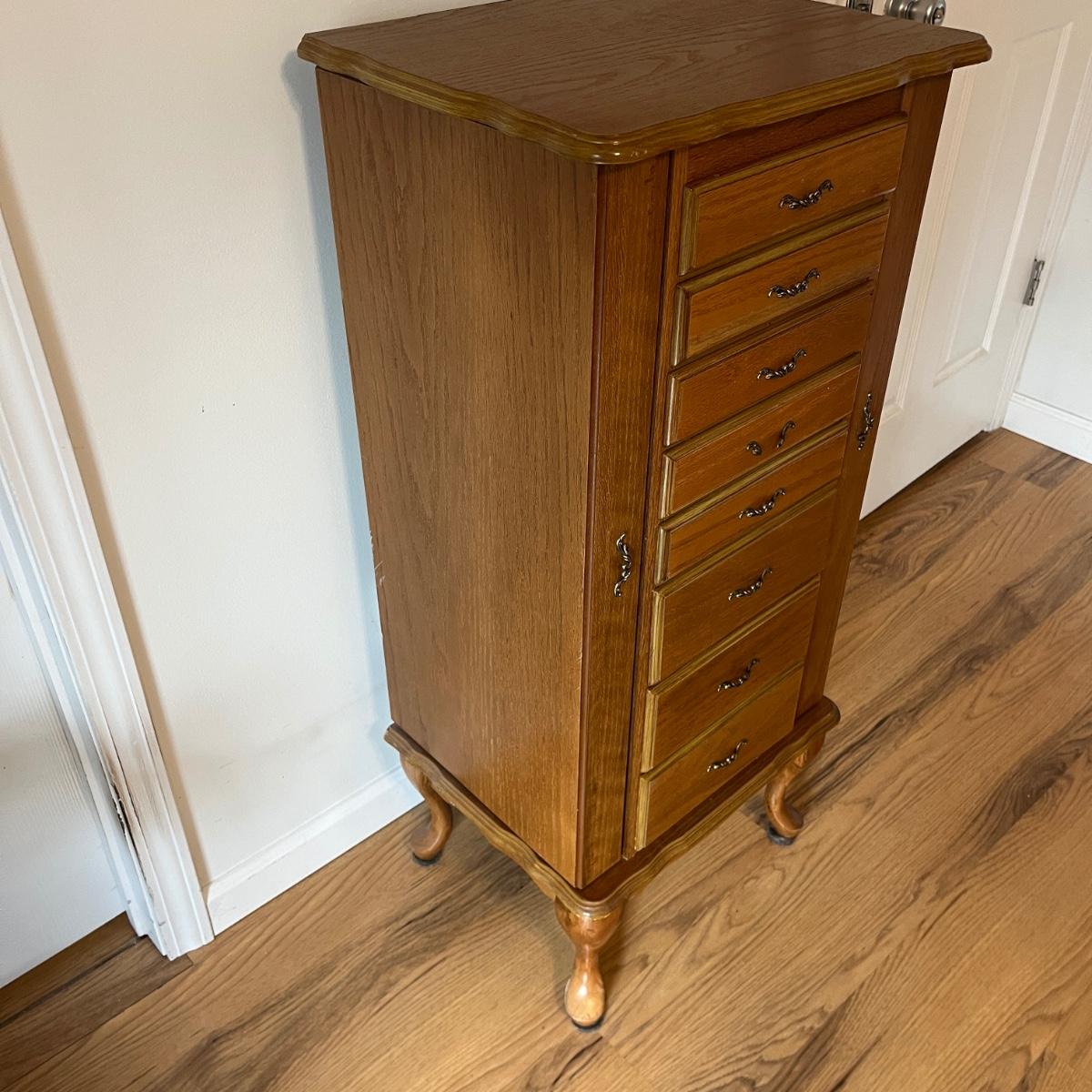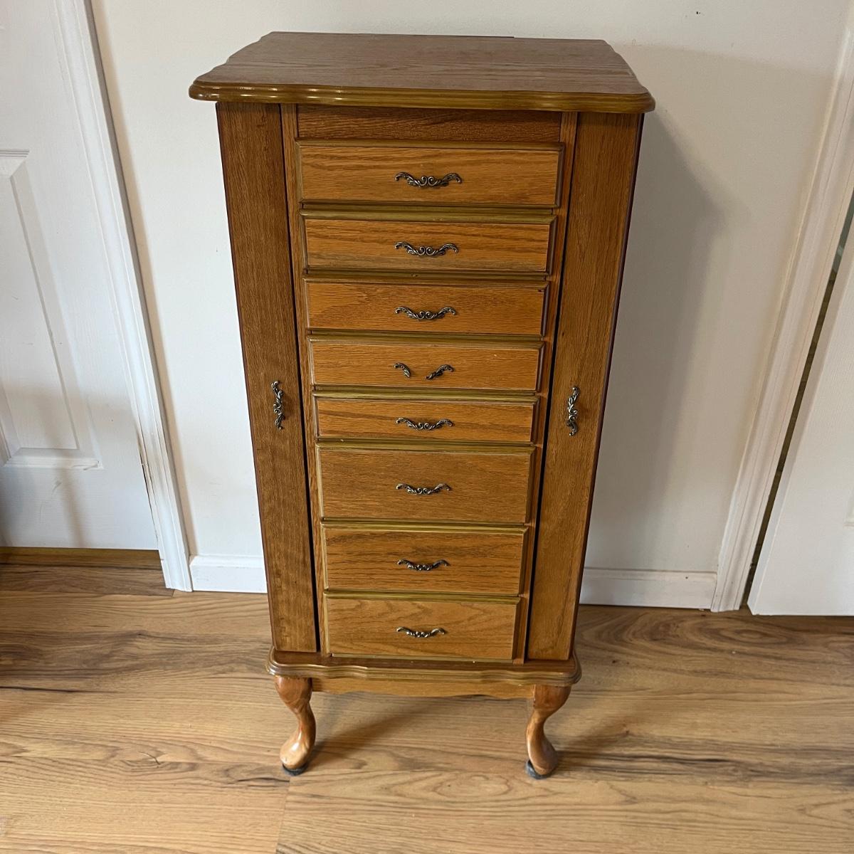 This wooden jewelry armoire has eight drawers and both sides swing open and the top opens to reveal a mirror and more storage. Armoire measures 18” 14.75” x 41”H. Top is loose and has a spot see photos. The top bracket could be better secured and needs one more screw.. Jewelry not Included but available in auction. One drawer has broken handle.