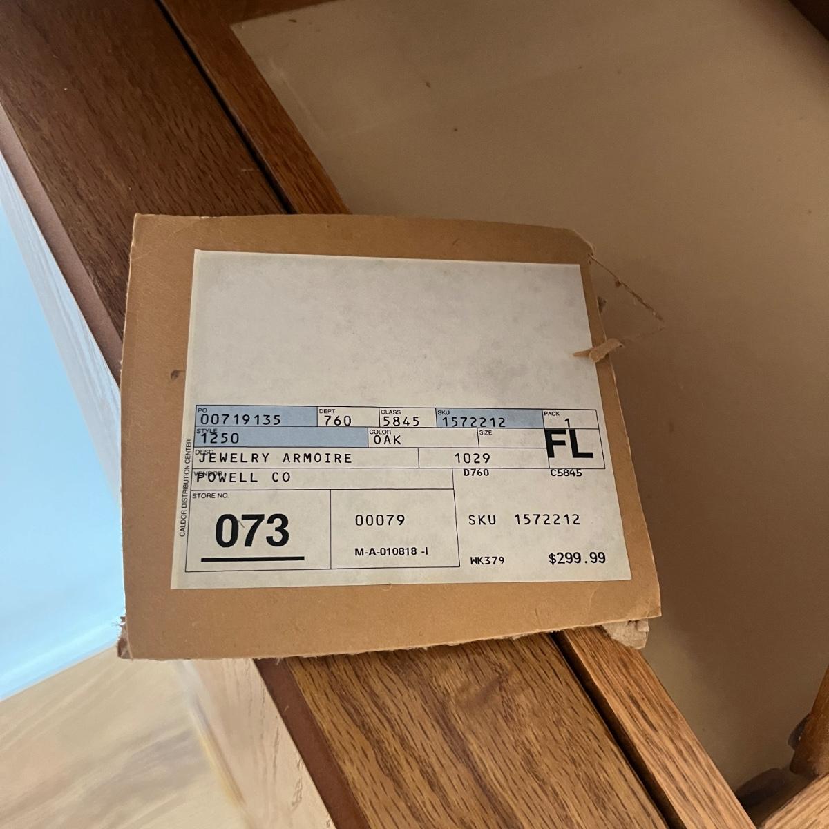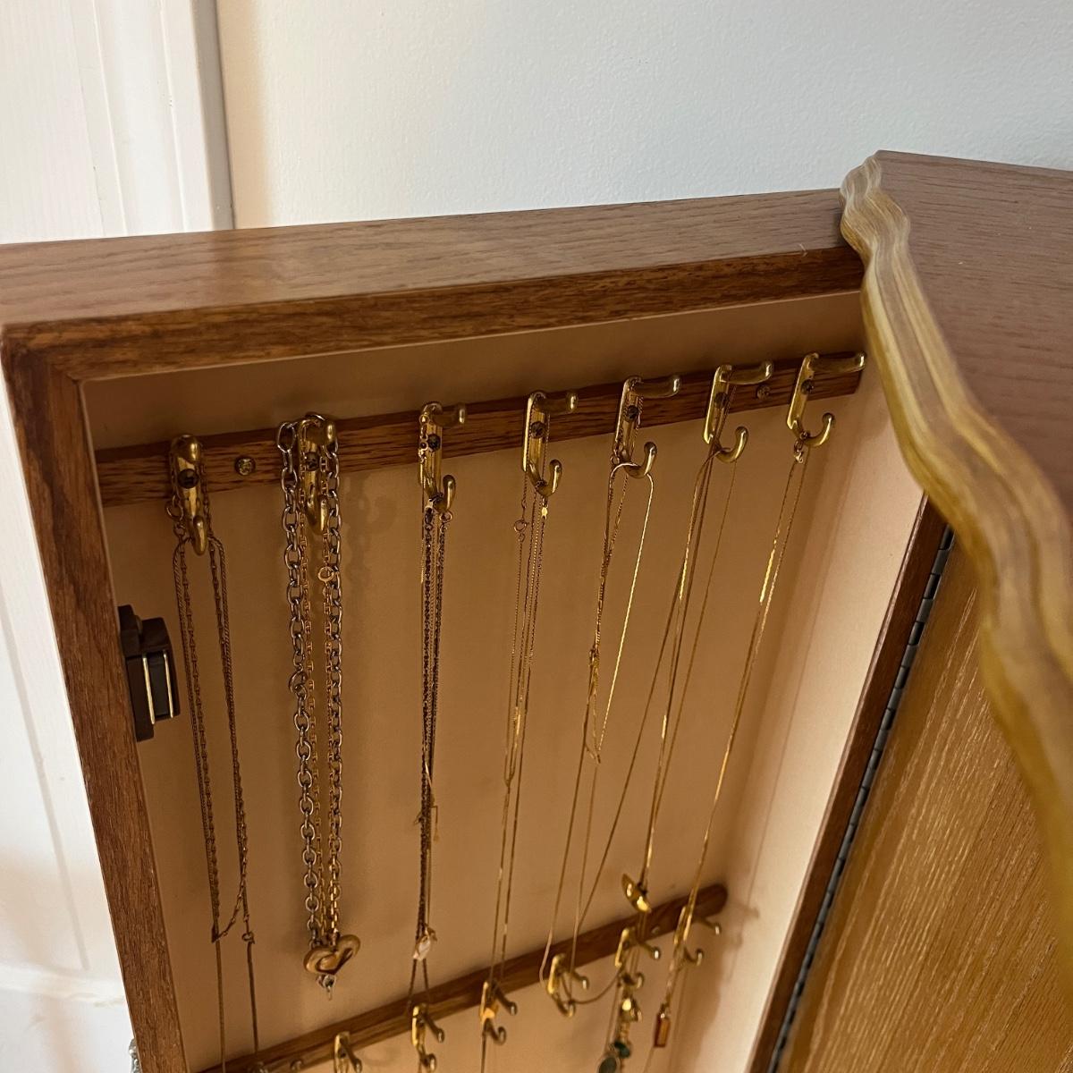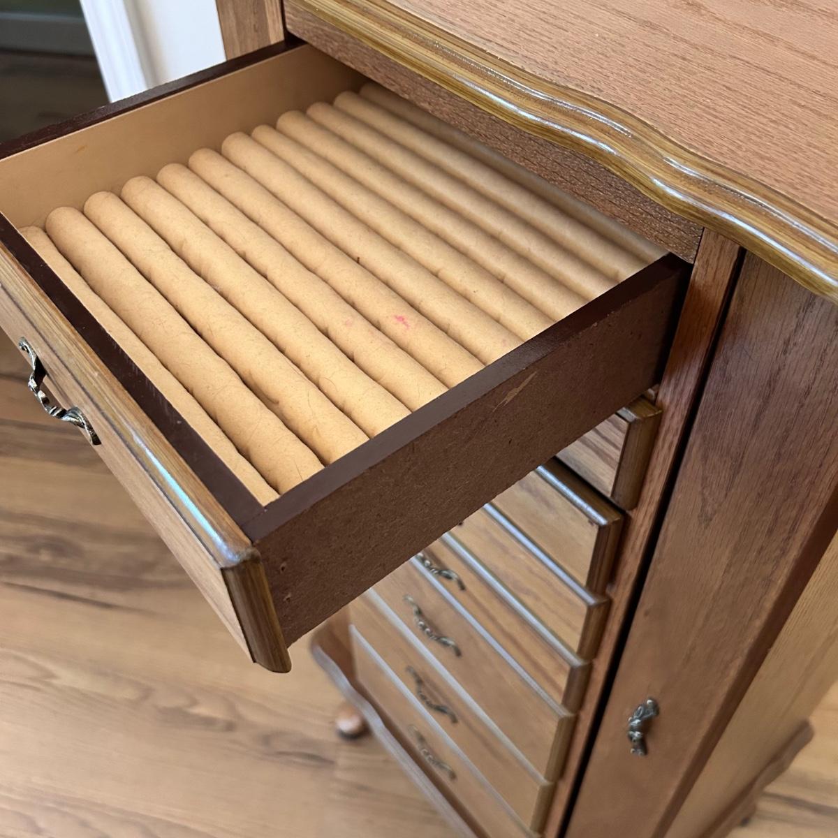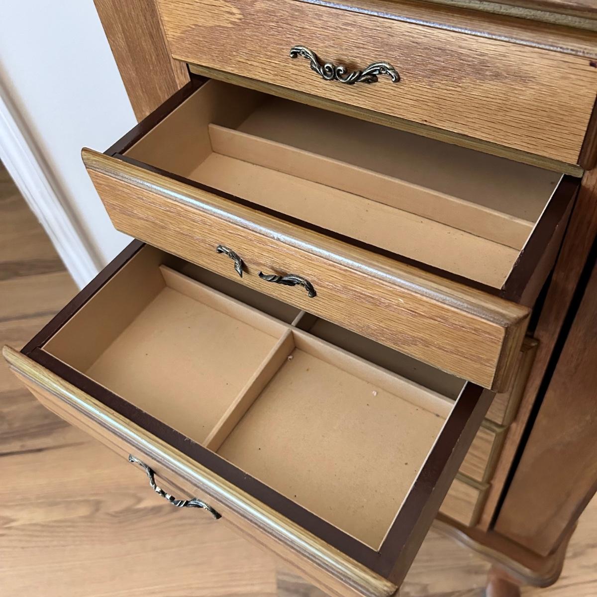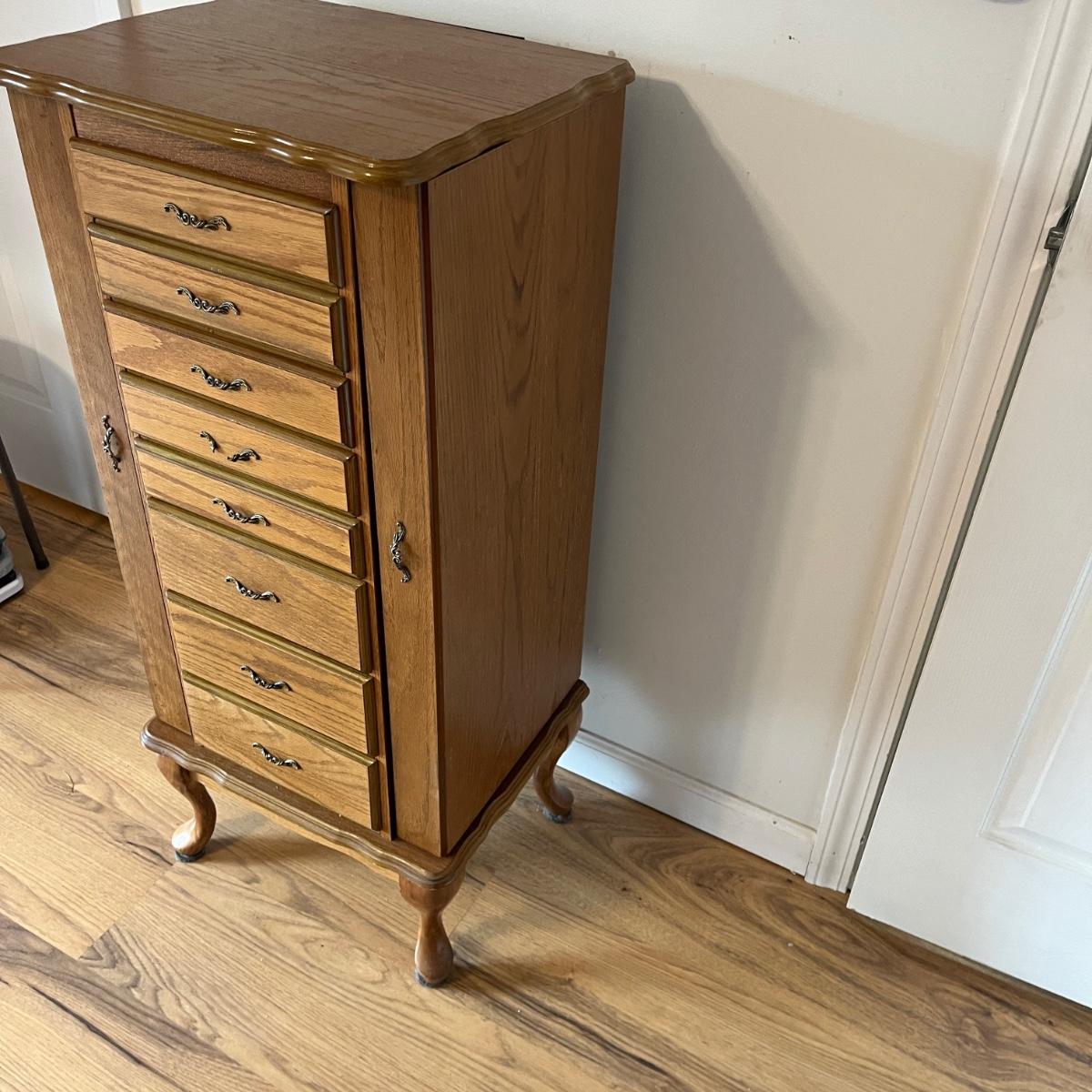 This wooden jewelry armoire has eight drawers and both sides swing open and the top opens to reveal a mirror and more storage. Armoire measures 18” 14.75” x 41”H. Top is loose and has a spot see photos. The top bracket could be better secured and needs one more screw.. Jewelry not Included but available in auction. One drawer has broken handle.