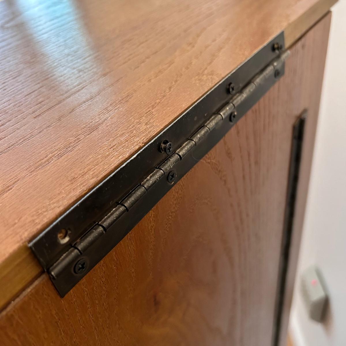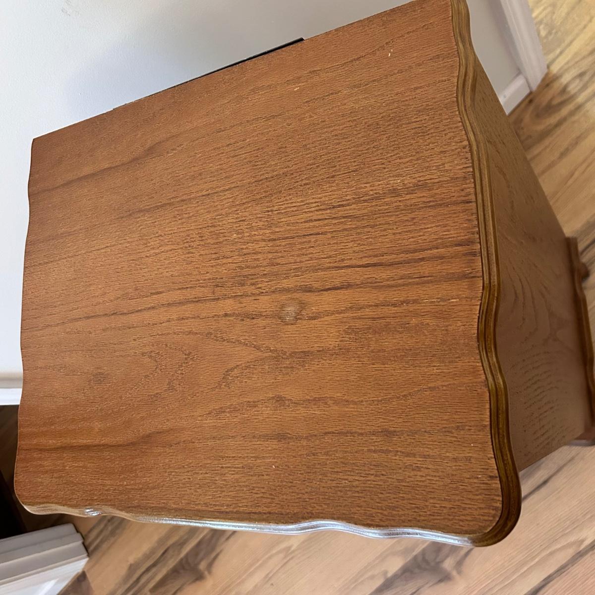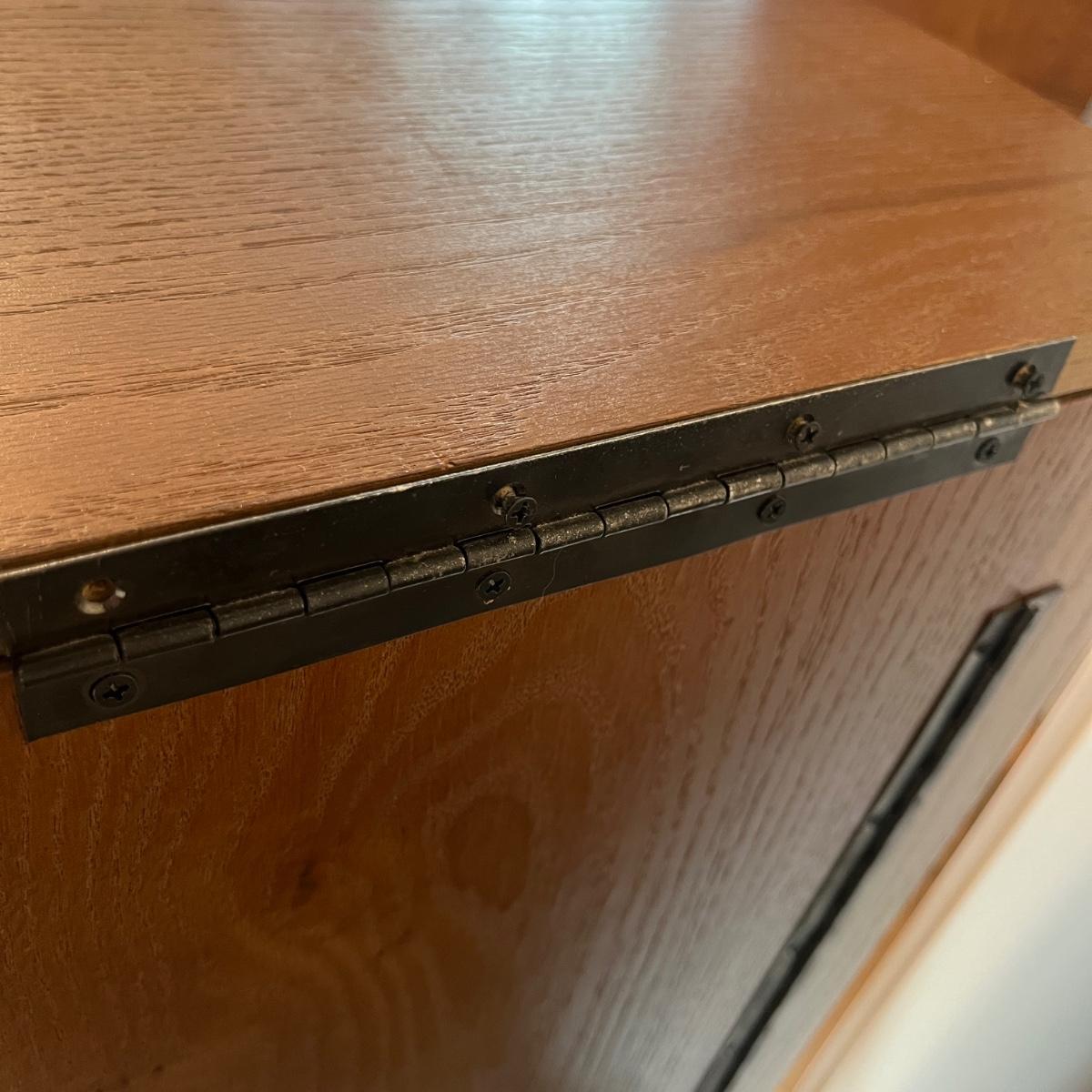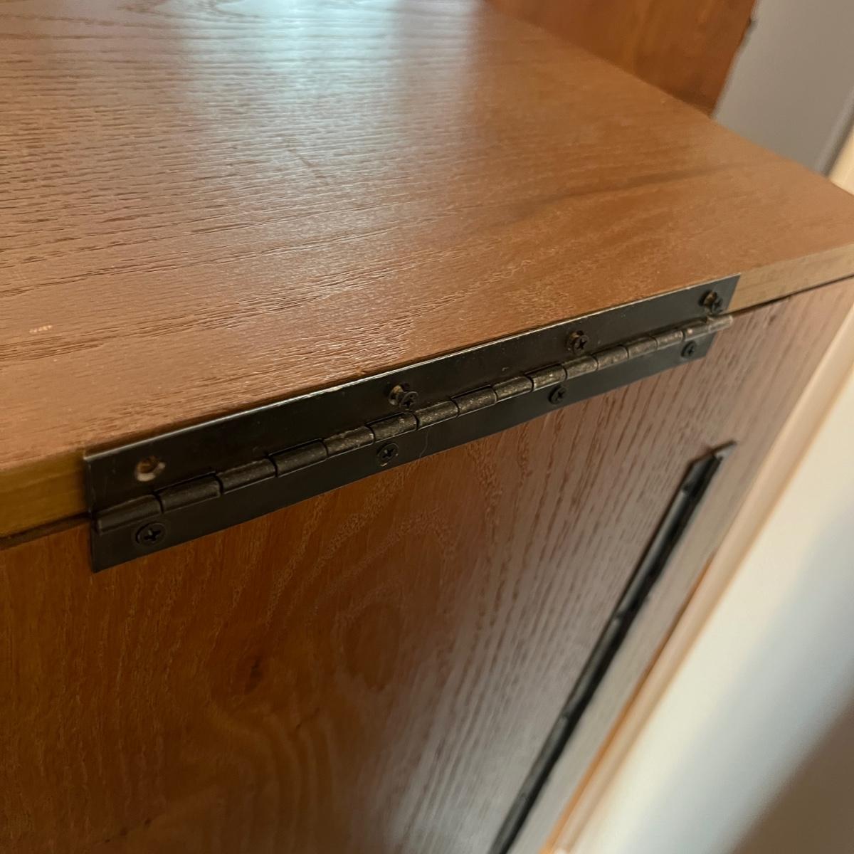 This wooden jewelry armoire has eight drawers and both sides swing open and the top opens to reveal a mirror and more storage. Armoire measures 18” 14.75” x 41”H. Top is loose and has a spot see photos. The top bracket could be better secured and needs one more screw.. Jewelry not Included but available in auction. One drawer has broken handle.