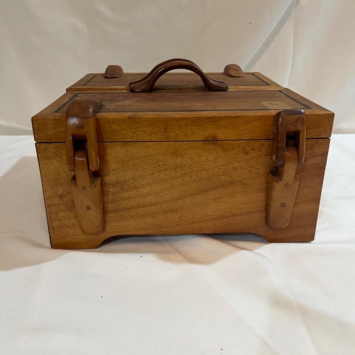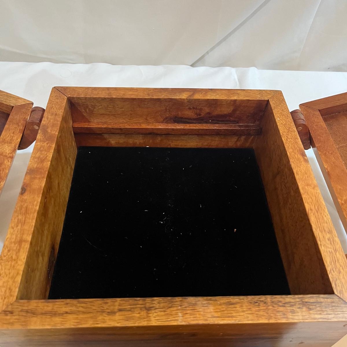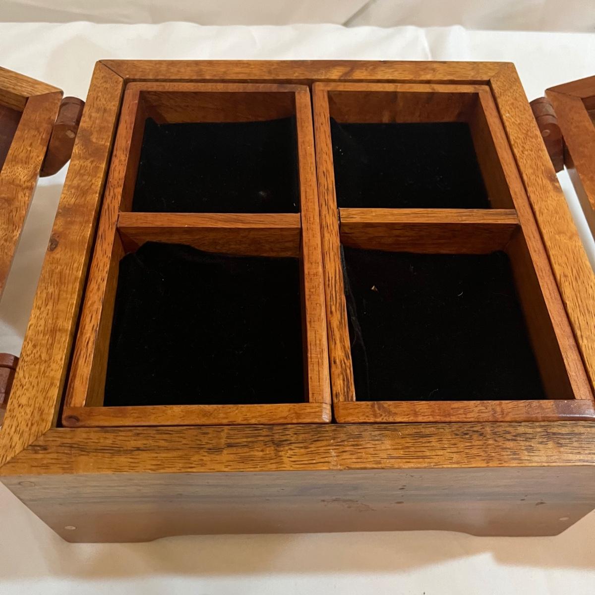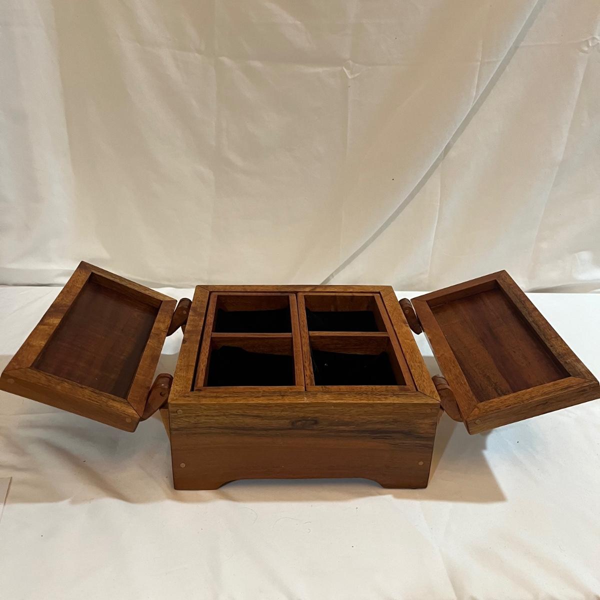 Lot includes a wooden jewelry box with two removable trays. Box appears to be constructed with dowels and not screws, see pictures. Box measures 12” x 10” x 6.5”H. Box has one hinge missing a part of it, see picture.