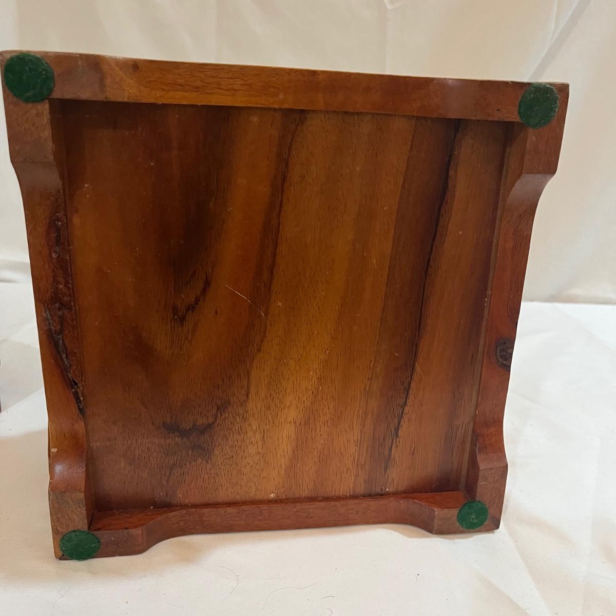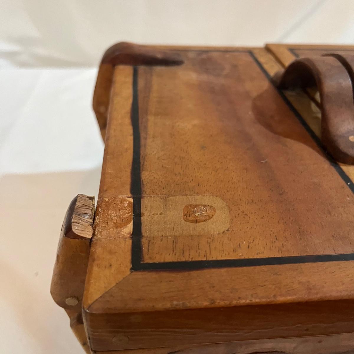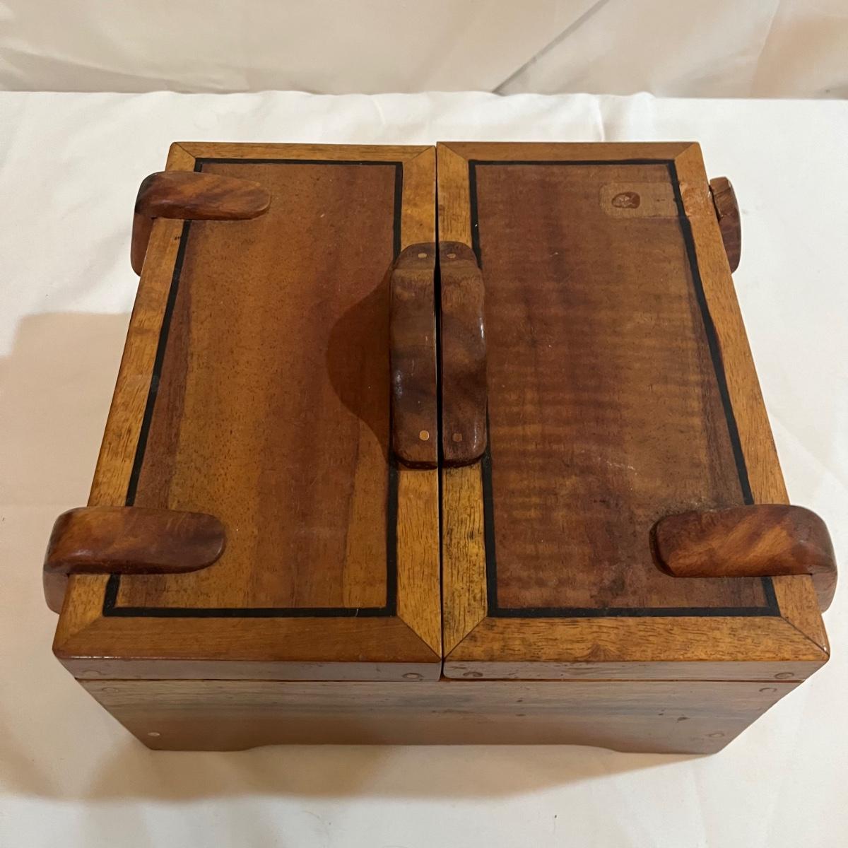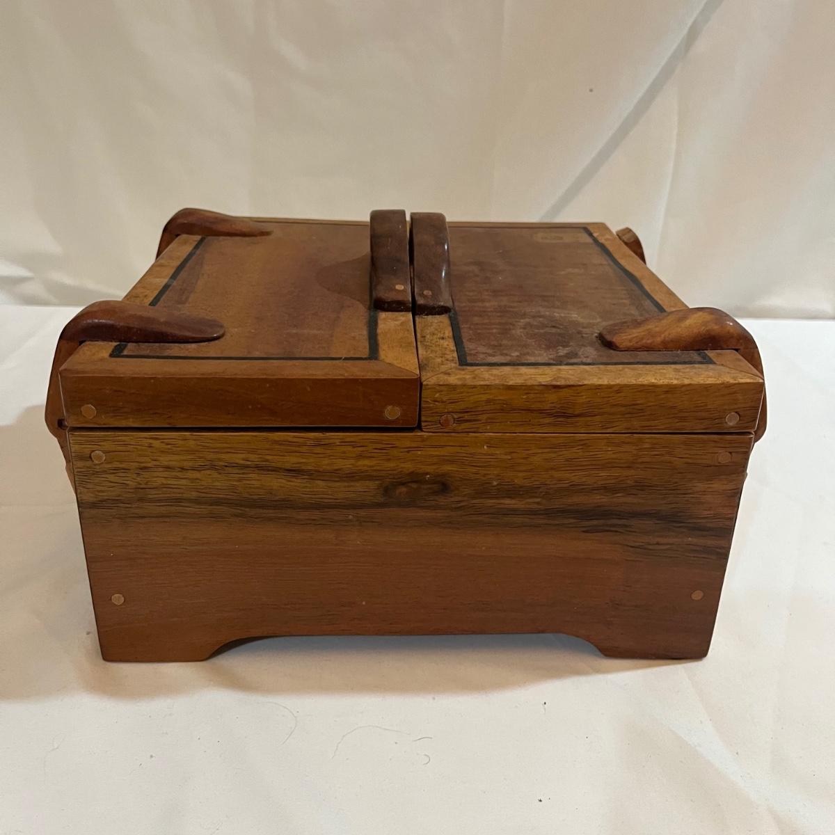 Lot includes a wooden jewelry box with two removable trays. Box appears to be constructed with dowels and not screws, see pictures. Box measures 12” x 10” x 6.5”H. Box has one hinge missing a part of it, see picture.