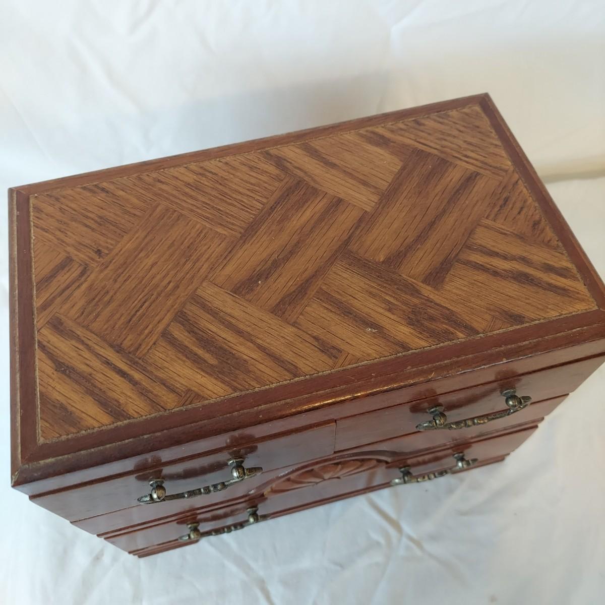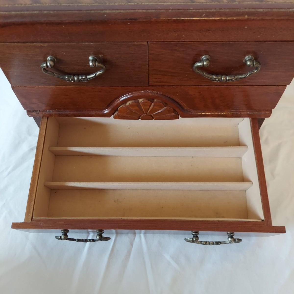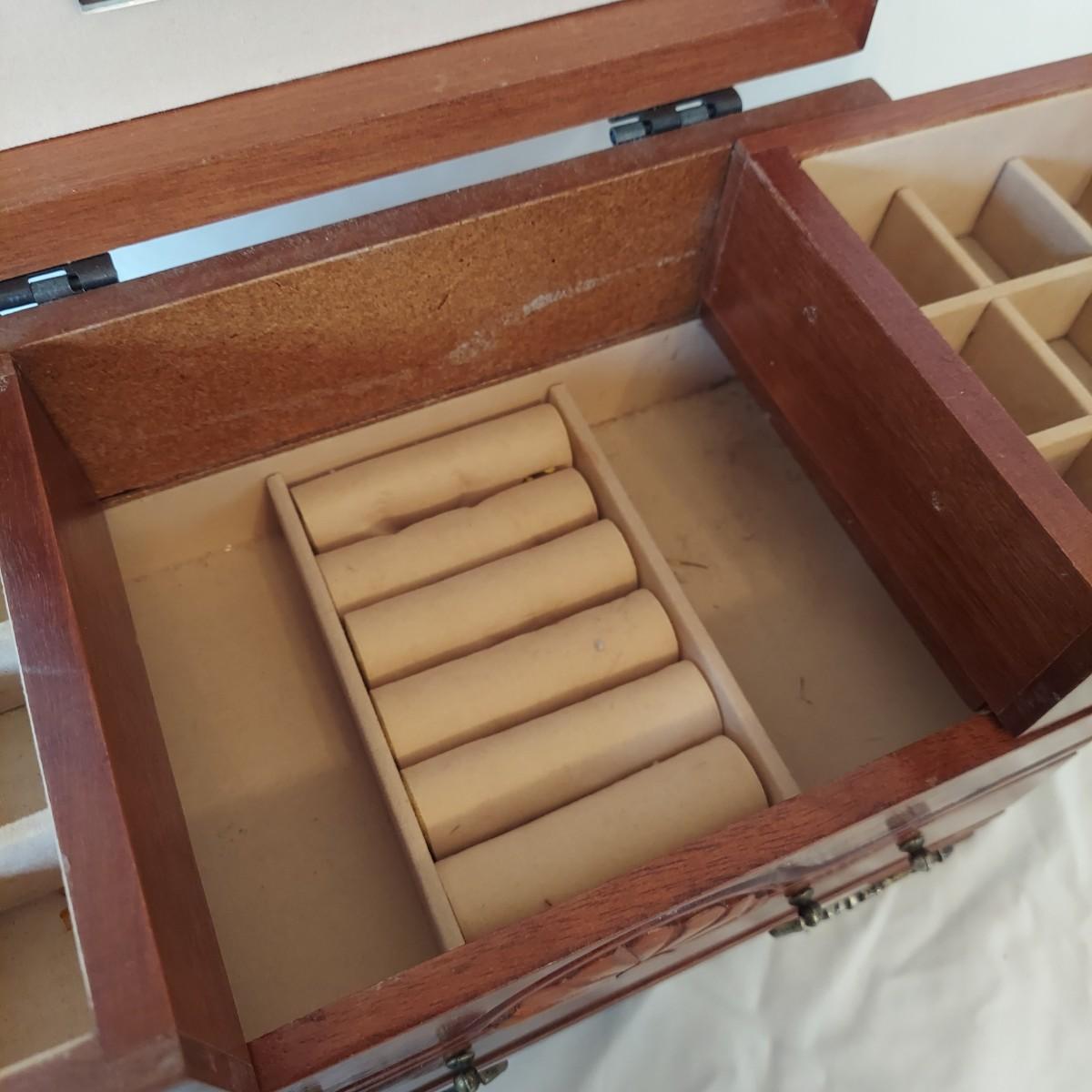 Five jewelry boxes. There are four wooden boxes and one that's black plastic. The largest wooden jewelry box with drawers measures 13” x 8” x 14.5"H. Please see photos for details. Local Pickup Only