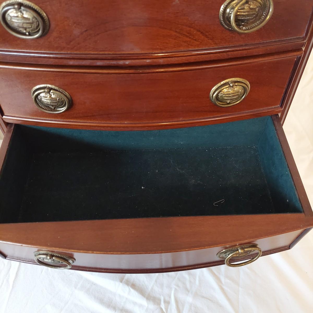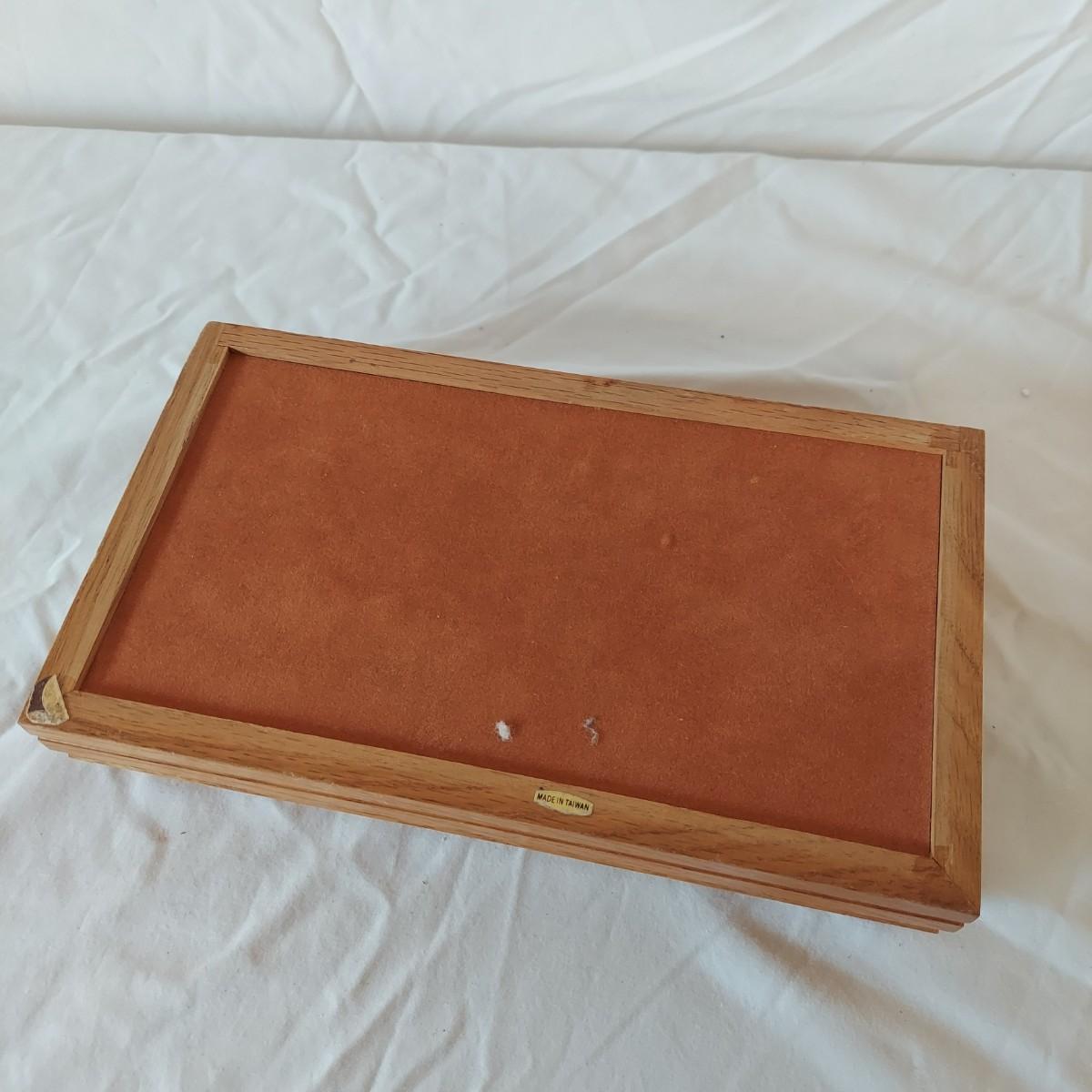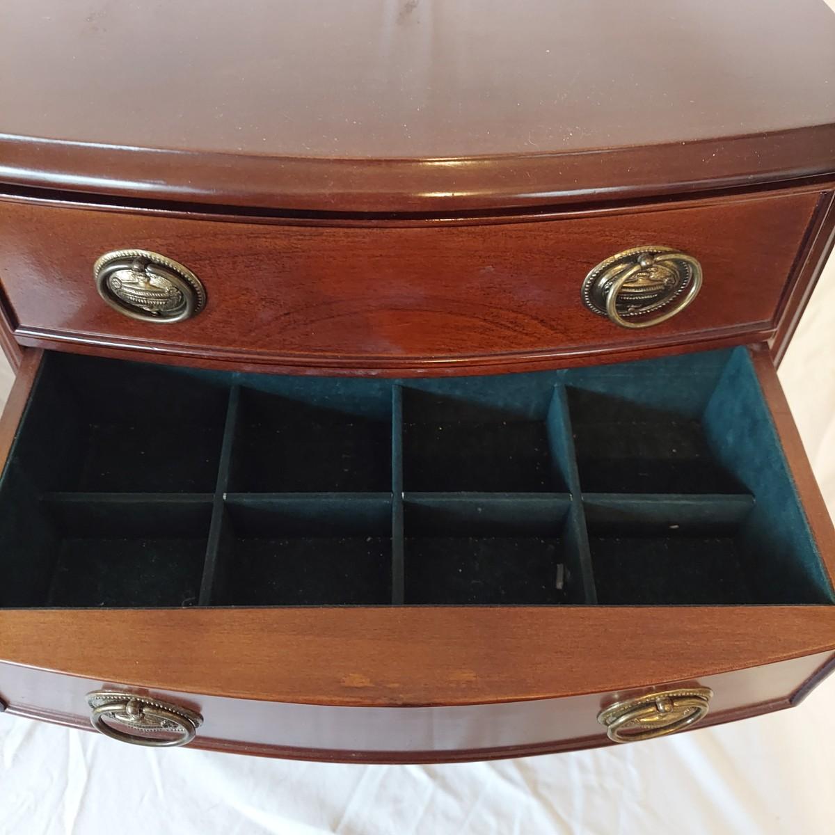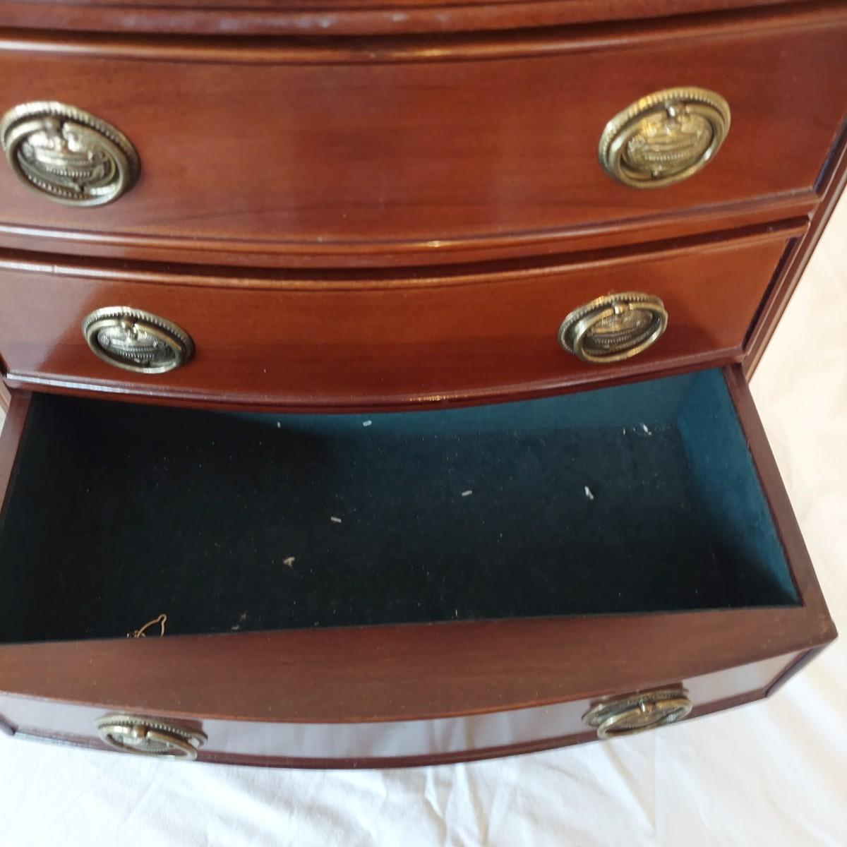 Five jewelry boxes. There are four wooden boxes and one that's black plastic. The largest wooden jewelry box with drawers measures 13” x 8” x 14.5"H. Please see photos for details. Local Pickup Only
