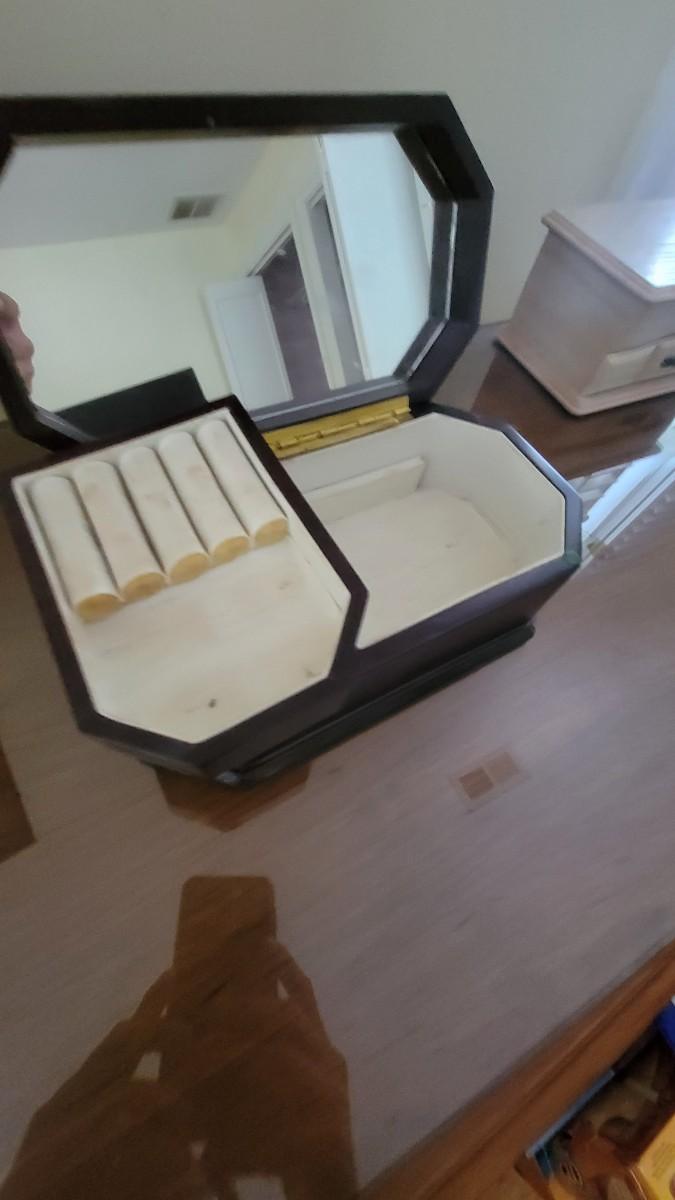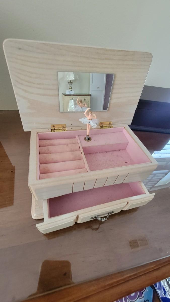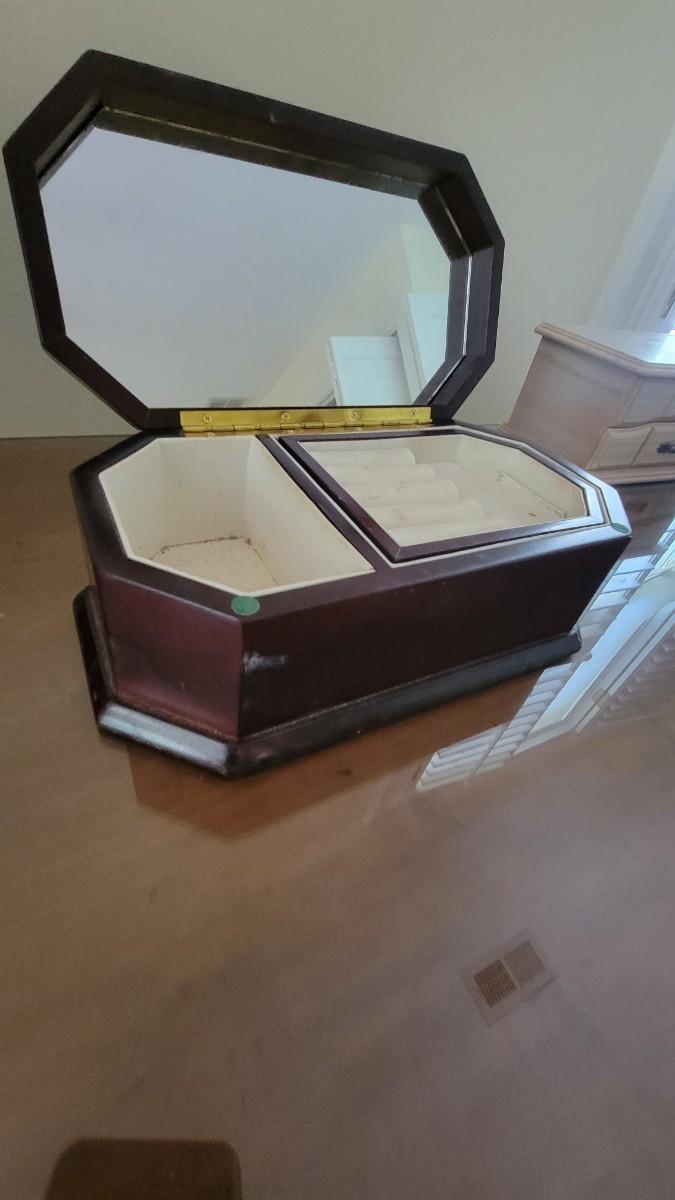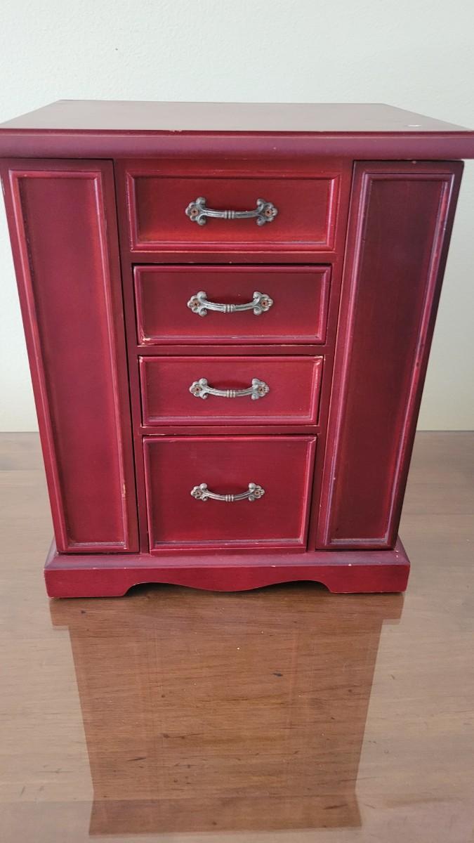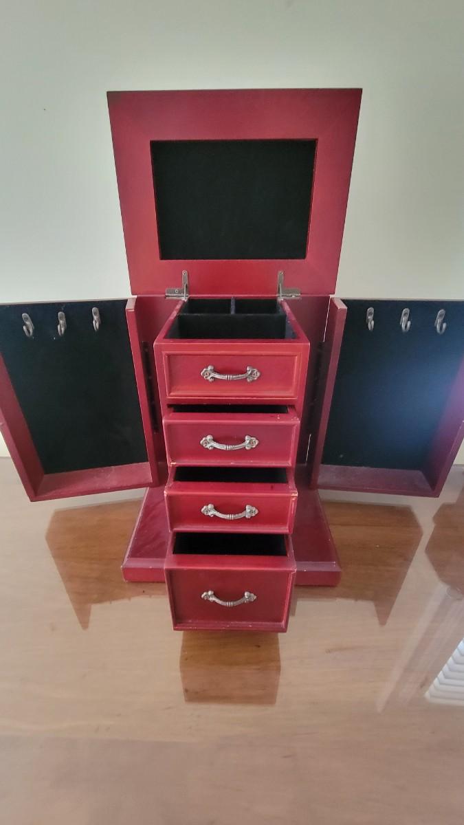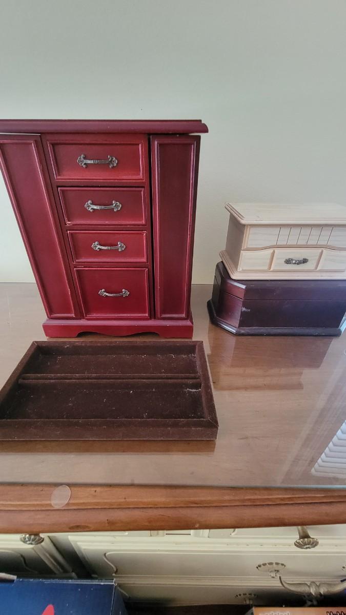 3 wooden jewelry boxes and a velvet jewelry tray. Ballerina box appears to be pressed wood with an inexpensive veneer. Winding mechanism works, but spins and plays at high speed when opened. Dark mahogany stained box is solid wood with a removable tray. Some blemishes on the outside of box. Largest cherry stained jewelry box has 3 drawers, wings and a lid that opens. Measures approximately 10.5" x 8" x 12.5" closed and approximately 25" x 9" x 20" open. Shipping available