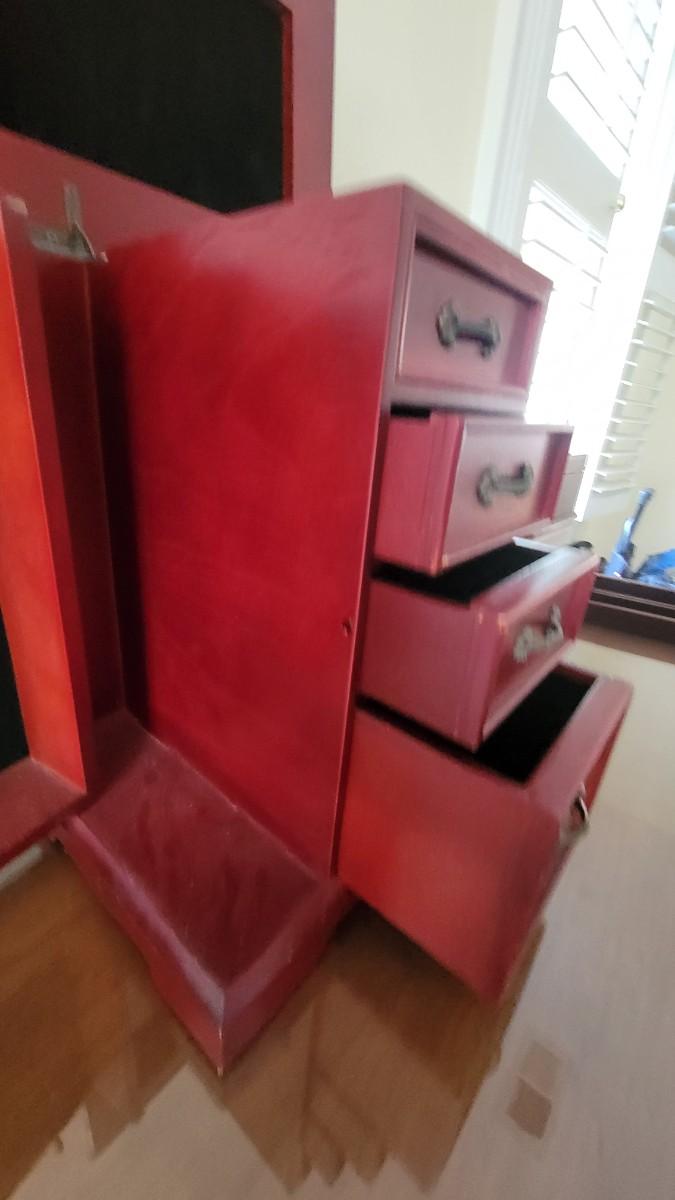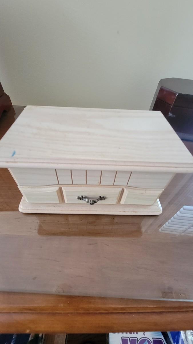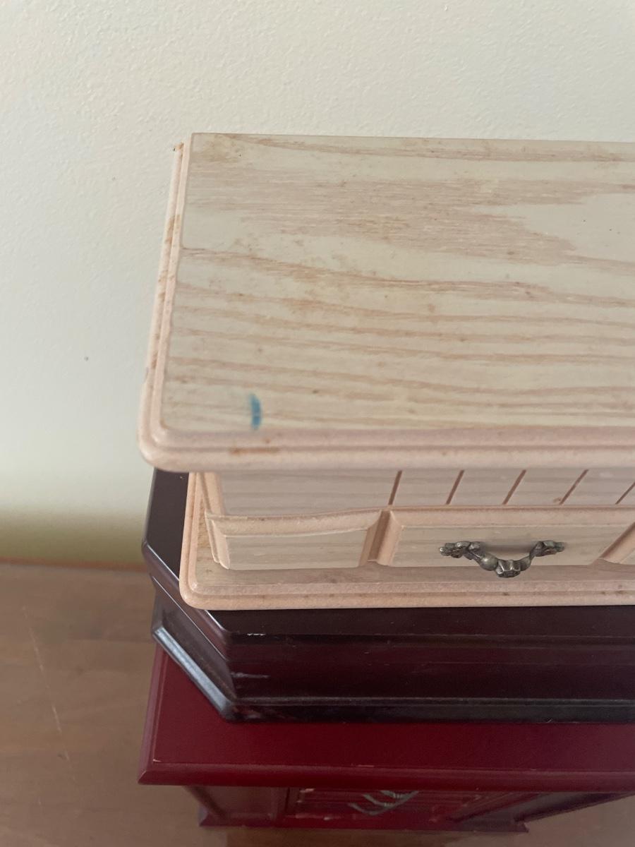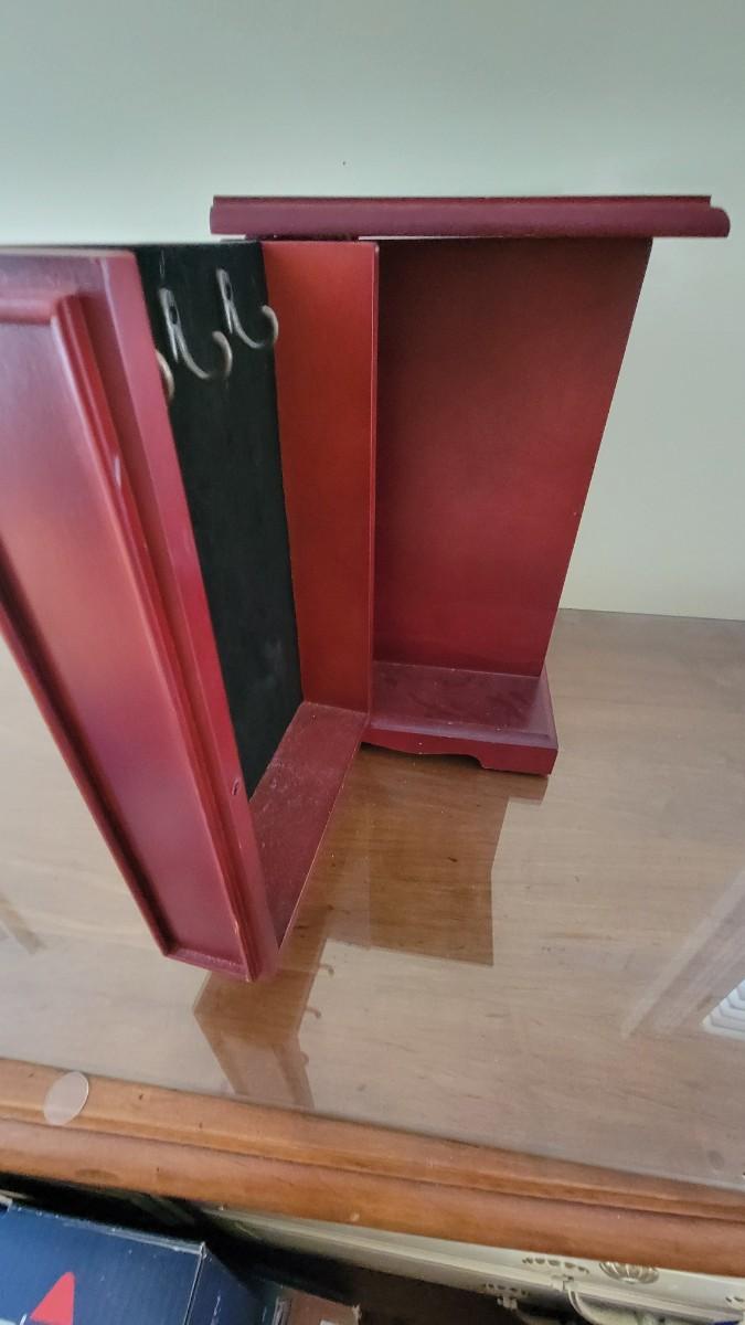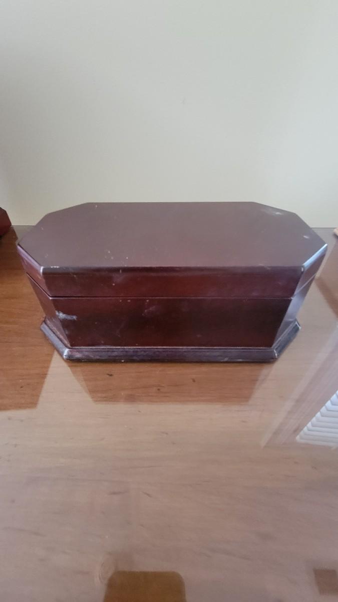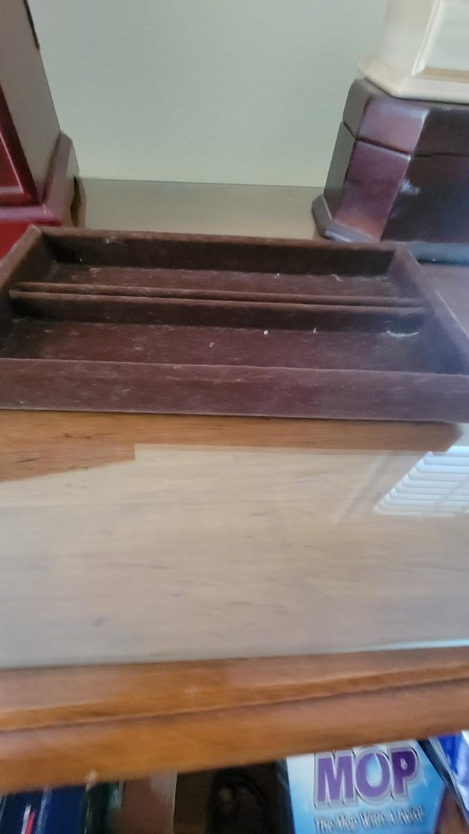 3 wooden jewelry boxes and a velvet jewelry tray. Ballerina box appears to be pressed wood with an inexpensive veneer. Winding mechanism works, but spins and plays at high speed when opened. Dark mahogany stained box is solid wood with a removable tray. Some blemishes on the outside of box. Largest cherry stained jewelry box has 3 drawers, wings and a lid that opens. Measures approximately 10.5" x 8" x 12.5" closed and approximately 25" x 9" x 20" open. Shipping available