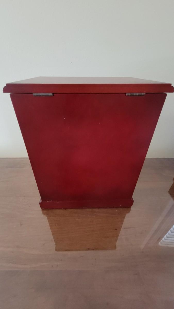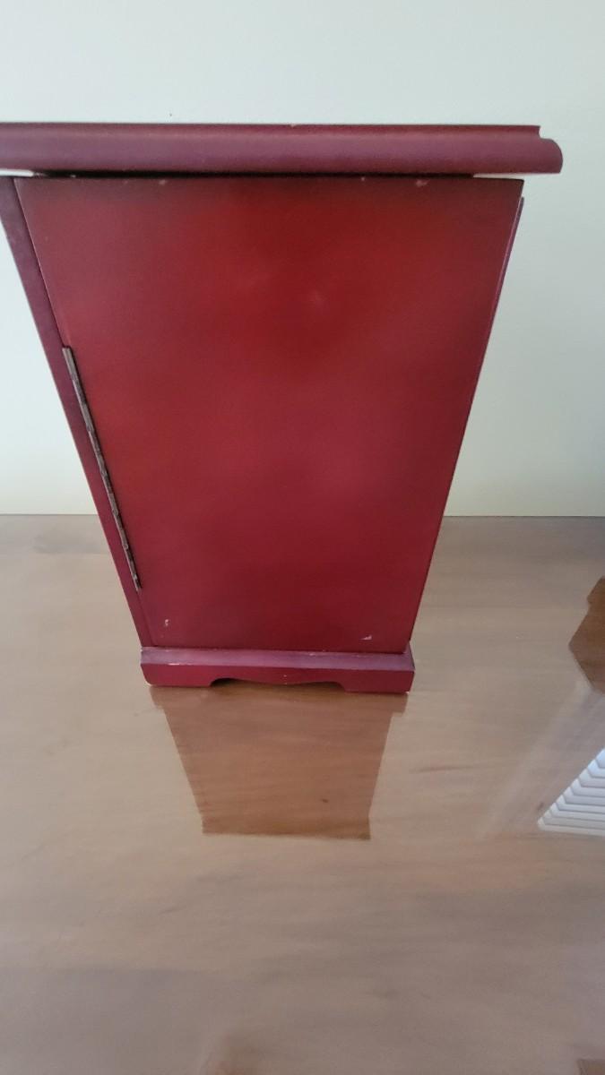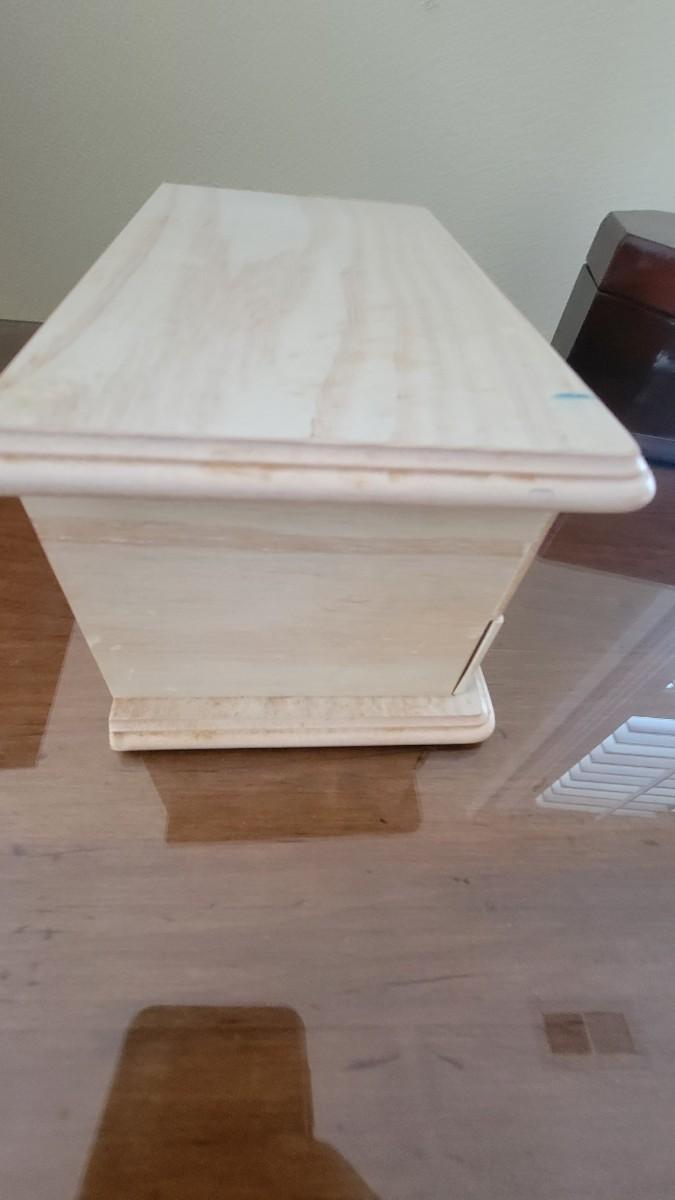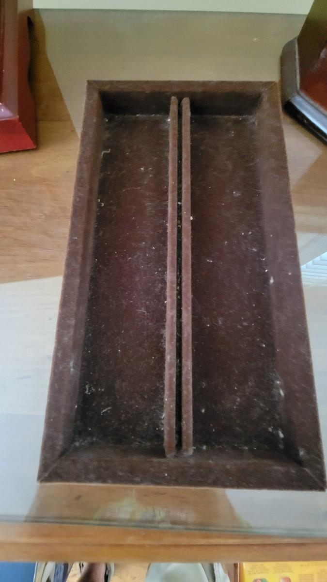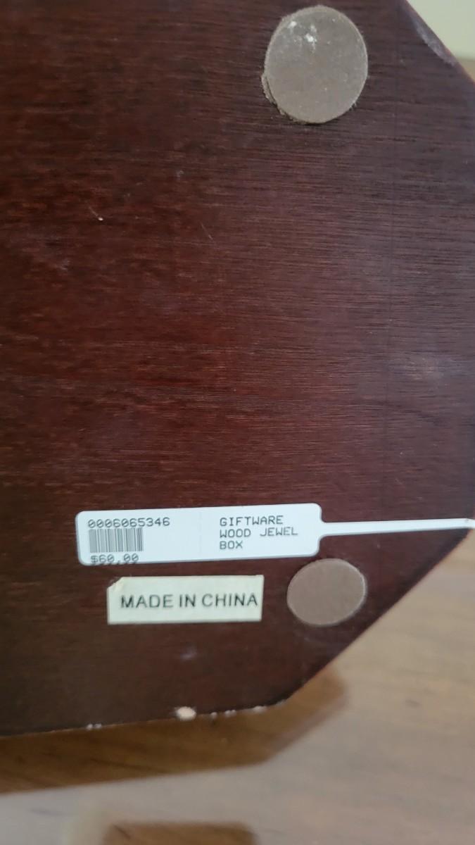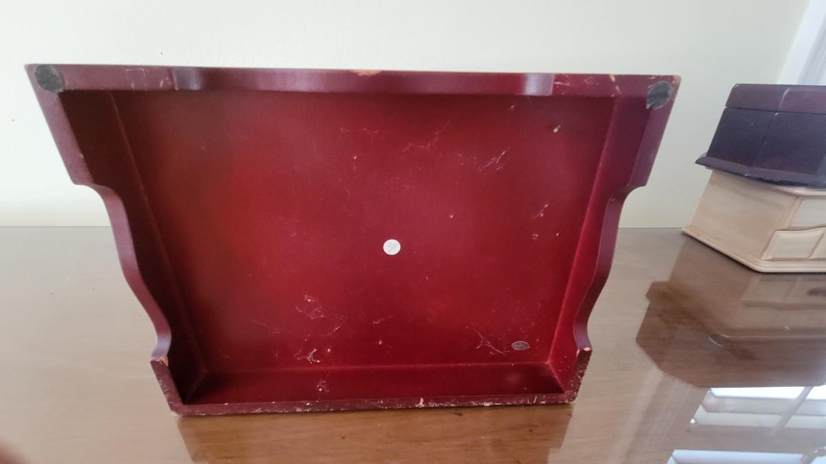 3 wooden jewelry boxes and a velvet jewelry tray. Ballerina box appears to be pressed wood with an inexpensive veneer. Winding mechanism works, but spins and plays at high speed when opened. Dark mahogany stained box is solid wood with a removable tray. Some blemishes on the outside of box. Largest cherry stained jewelry box has 3 drawers, wings and a lid that opens. Measures approximately 10.5" x 8" x 12.5" closed and approximately 25" x 9" x 20" open. Shipping available