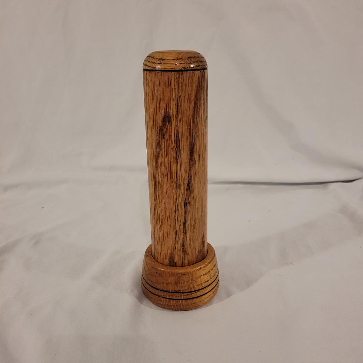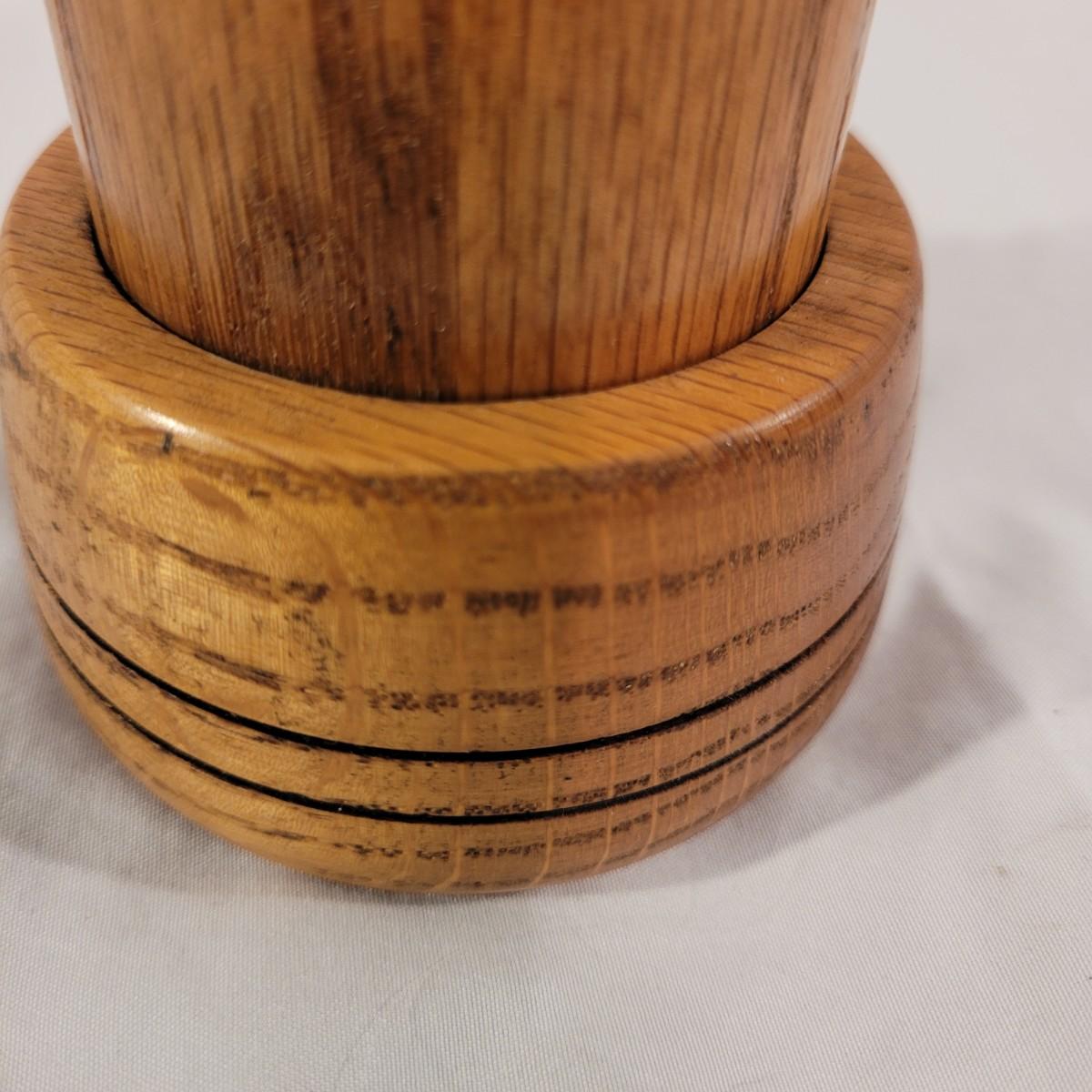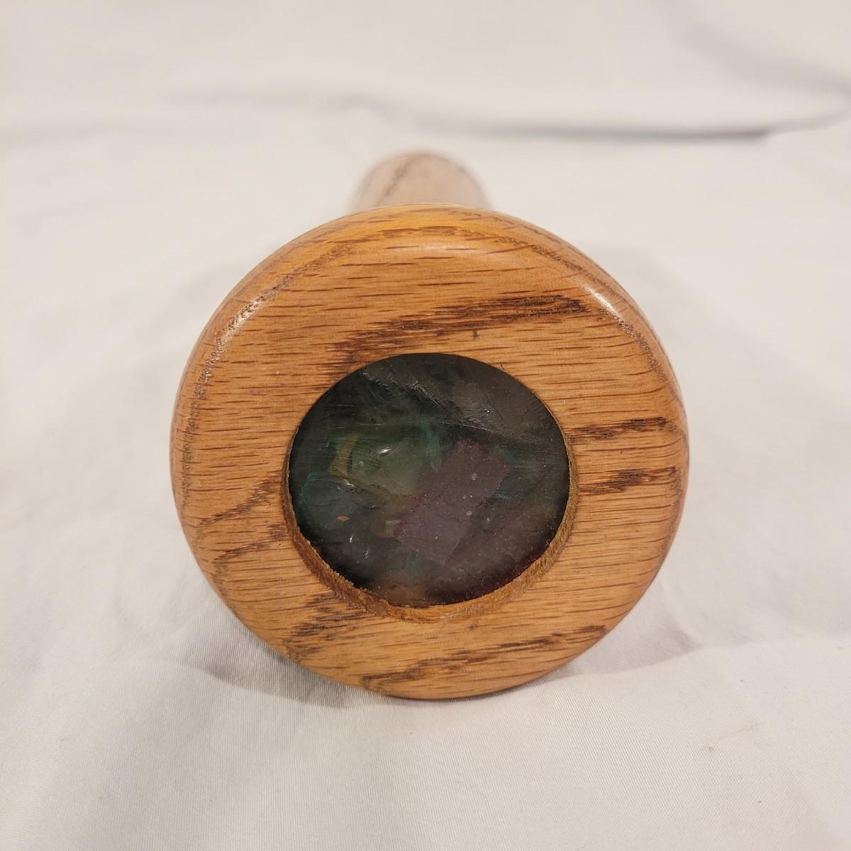 This unique wooden kaleidoscope is sturdy and shines in bright blues, yellows, greens and reds. Measures approximately 10”H. Shipping available.