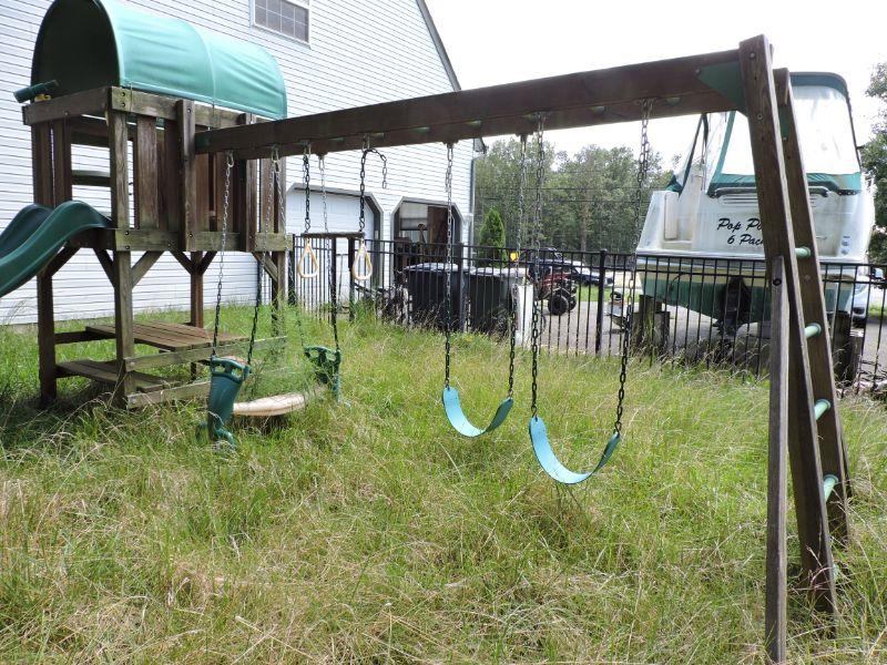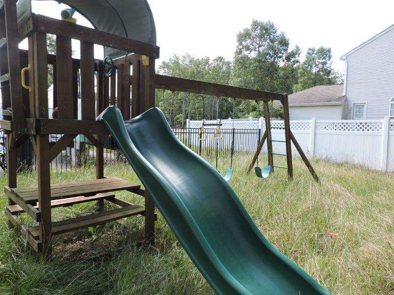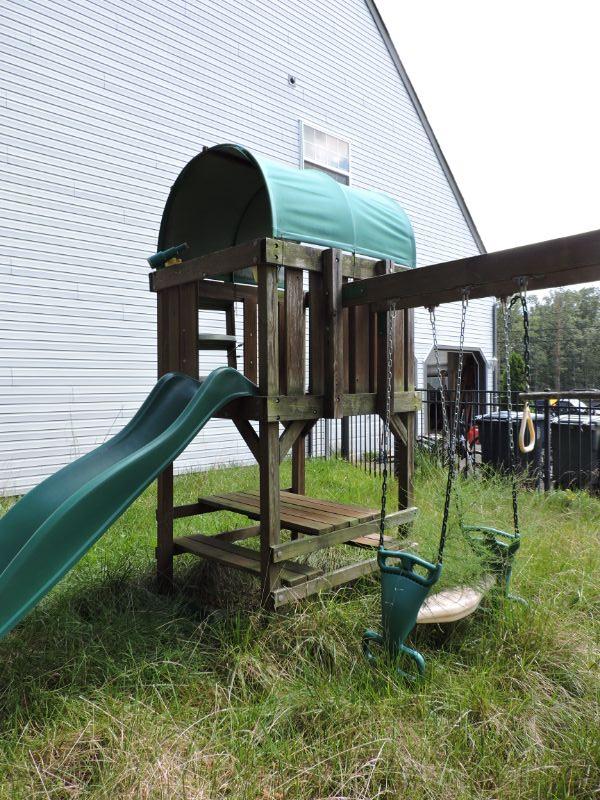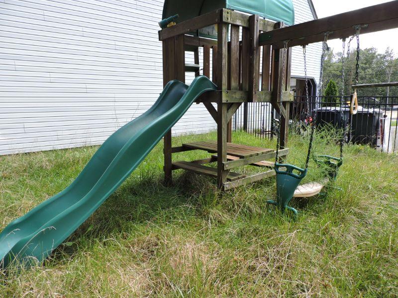 Kid's playset with swings, playhouse, table, and slide. Must be able to disassemble and take by Monday, Sept. 2. **Please read Terms and Conditions before placing a bid. Pick up is Sunday, September 1, 2019 from 10am to 4pm in Williamstown. All sales are final. All sales are as is, where is. Please review all photos. Any props included in photos are not included in listing. All measurements are approximate.