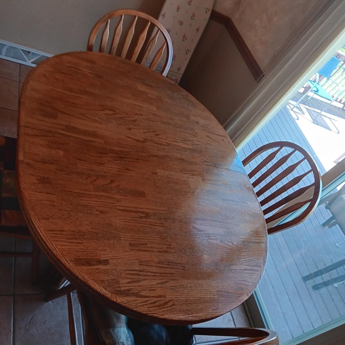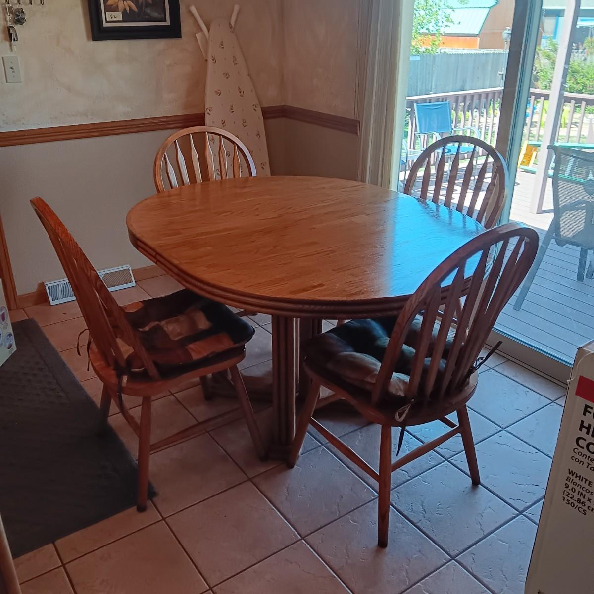 WOODEN KITCHEN TABLE W/4 CHAIRS AND 2 LEAVES